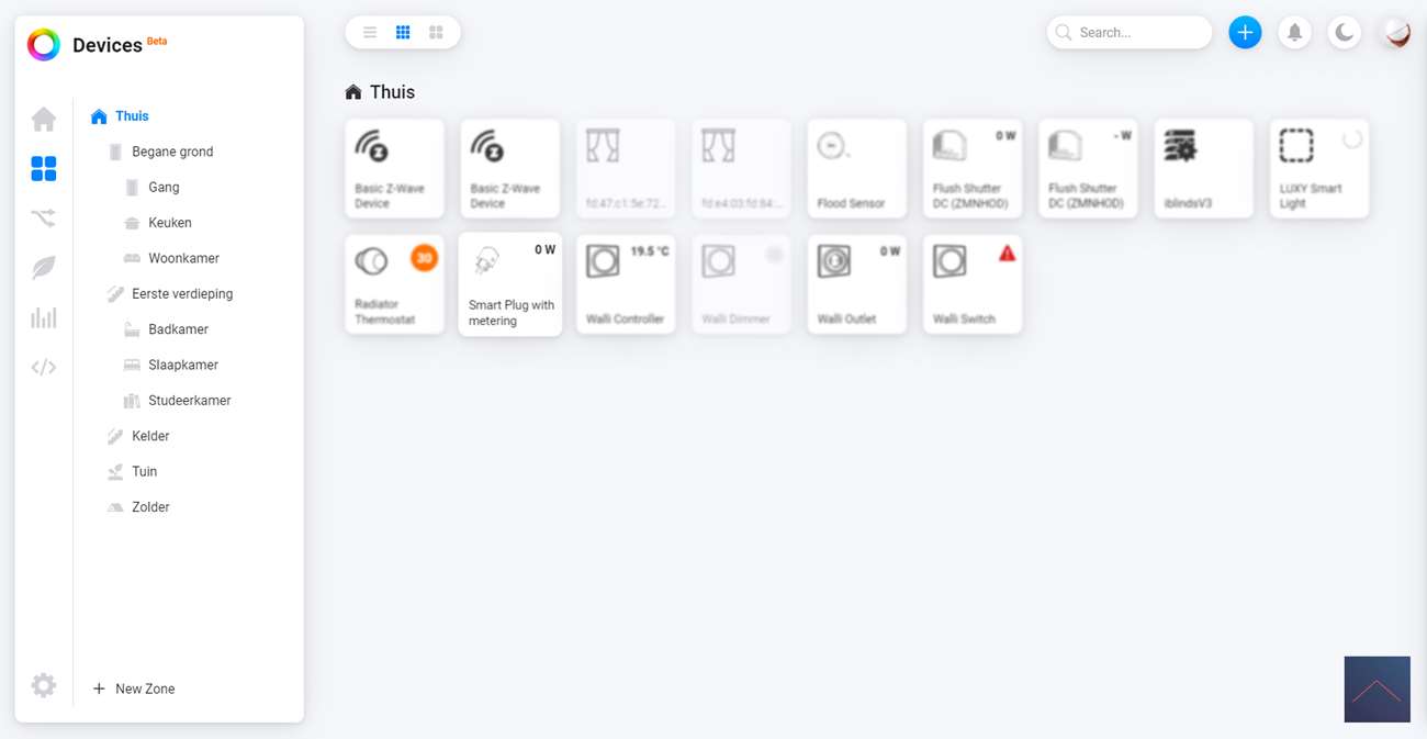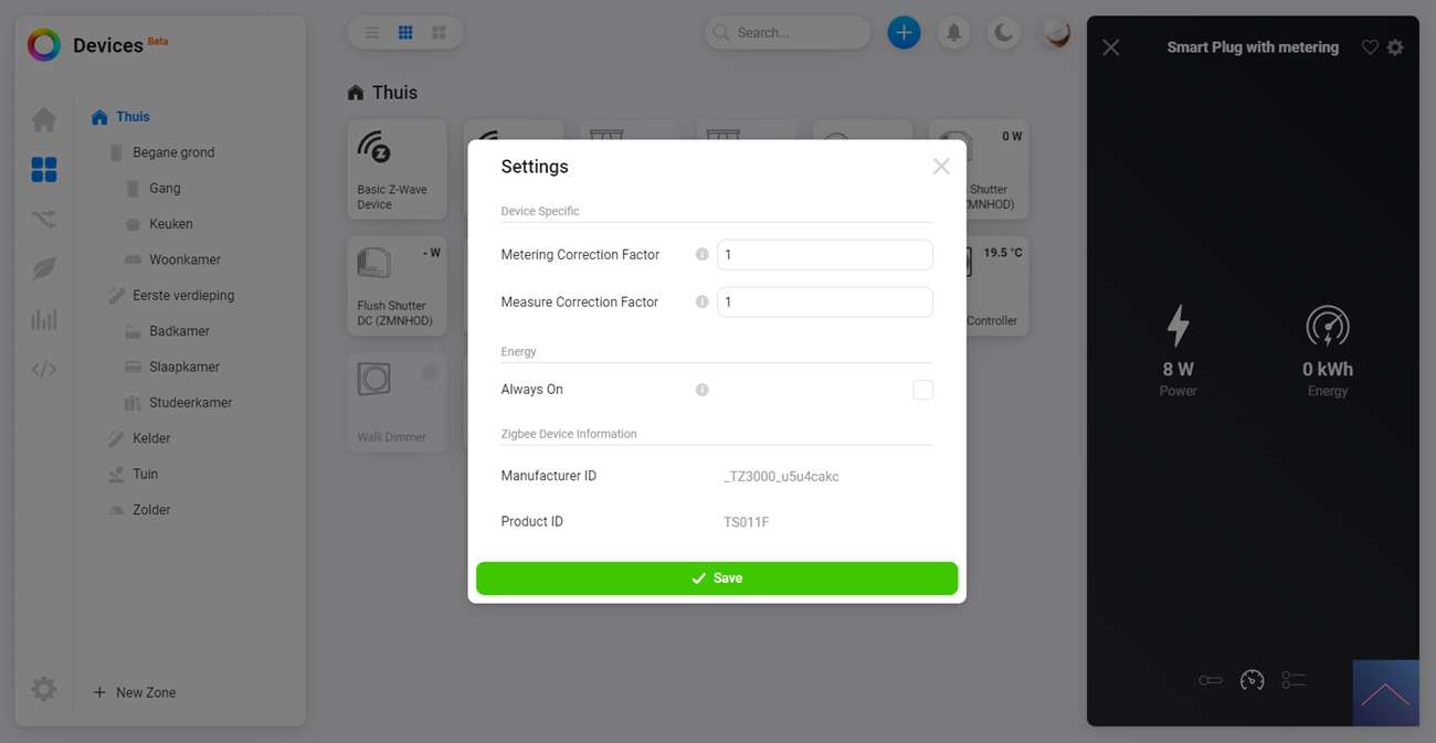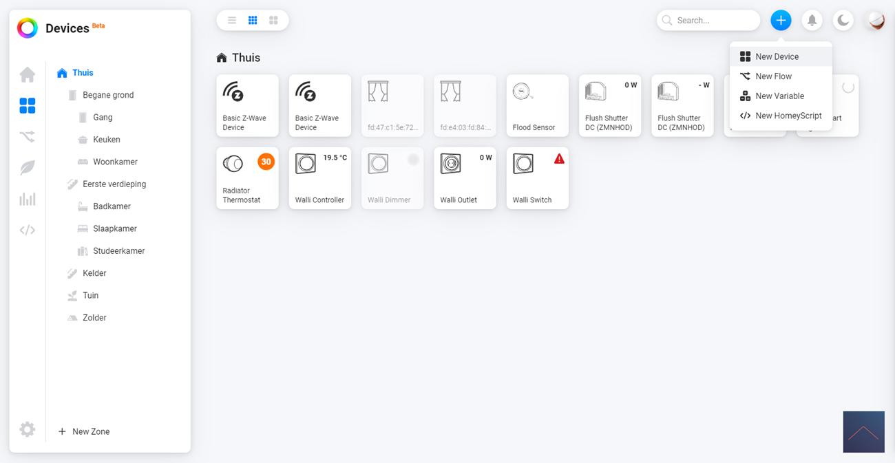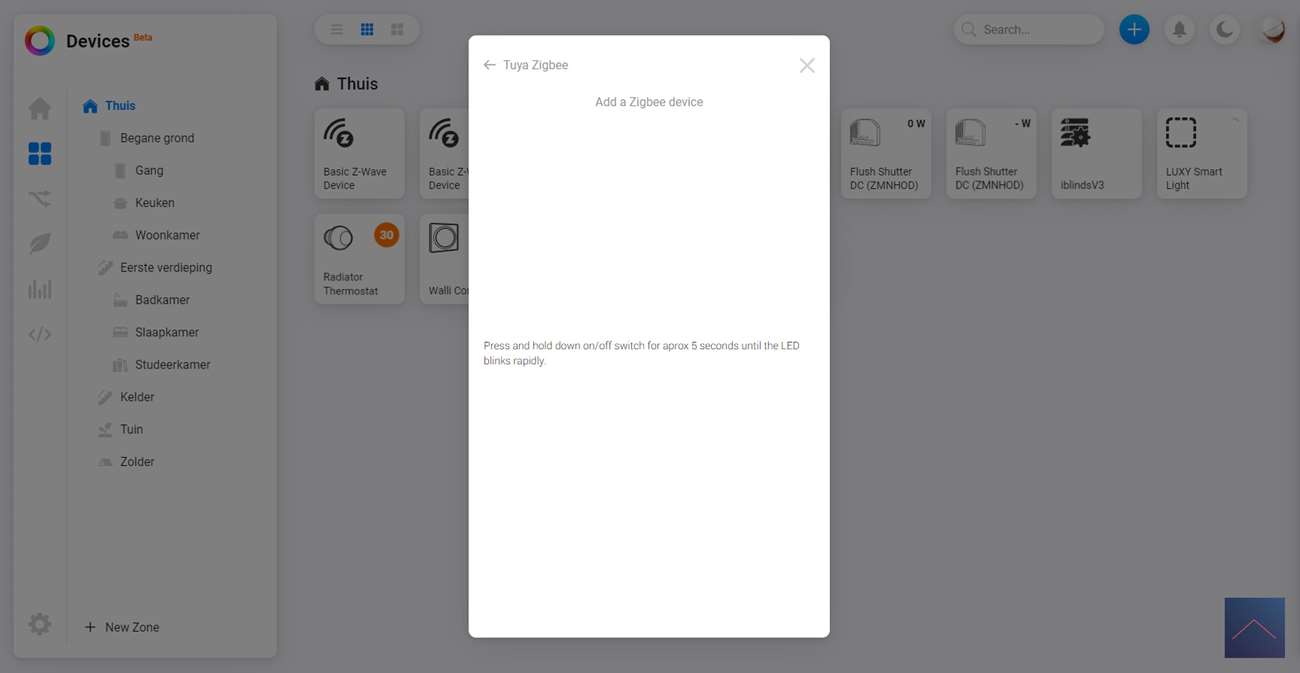 De eerste controller waar we de BlitzWolf mee gaan koppelen is de Homey. De Homey heeft een Zigbee chip ingebouwd dus het koppelen zou niet al te veel problemen moeten geven. We beginnen met het inloggen via de web-interface en naar onze apparaten te gaan. We klikken vervolgens op het plusje en drukken op 'nieuw apparaat toevoegen'. Nu zoeken we de BlitzWolf op, je ziet dat er resultaten komen maar het merk BlitzWolf komt niet naar voren. Dit komt omdat er geen aparte APP is maar je kunt de Tuya Zigbee APP gebruiken. Deze selecteren wij en zoeken de plug (met meter) op.