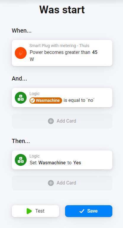 Door te kijken naar het energie verbruik weten we dat de wasmachine gestart is. Dit is dus ook onze trigger. Bij de EN controleren we een variabel (deze kun je bovenin aanmaken) om te voorkomen dat deze regel continue draait.