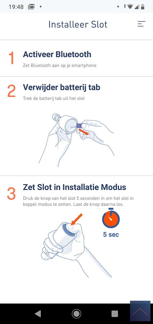 Het installeren van het slot moet je de knop 3 seconden ingedrukt houden. Het slot komt dan in de leerstand waarna je hem kunt koppelen aan de APP/je account. Dit kan je doen door gelijk de knop in de APP en de knop op het slot in te drukken. Dit lukte mij eerst niet maar dit kwam omdat ik te lang de knop ingedrukt hield.
