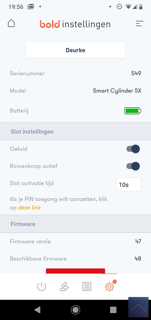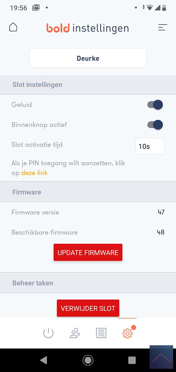 Via het radaricoontje kom je bij de instellingen. Hier kun je de batterij status zien, het geluid aan- en uitzetten, de binnen knop aan of uitzetten en de tijd instellen dat het slot actief is. Hier kun je ook het slot voorzien van een nieuwe firmware. In mijn geval was er nieuwe firmware, maar deze kreeg ik niet geinstalleerd. Na een paar keer proberen pakte hij hem wel.