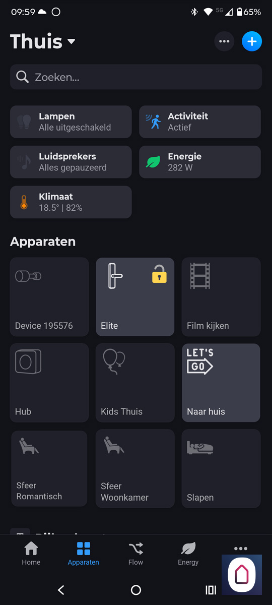 Omdat de Elite Matter gecertificeerd is, wilden we natuurlijk ook testen hoe dit werkt in combinatie met Homey. In theorie heb je met Matter geen aparte merk-app of cloudkoppeling meer nodig, maar voeg je het slot direct toe aan je Smart Home ecosysteem via de Matter standaard.