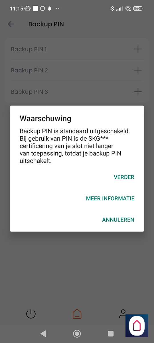 De mogelijkheid om een pin in te stellen mocht je je telefoon niet bij je hebben. Dit werkt hetzelfde als een kluis. Je draait dus 2x links, 3x rechts, etc. Op deze manier kun het slot ook openmaken zonder je telefoon.