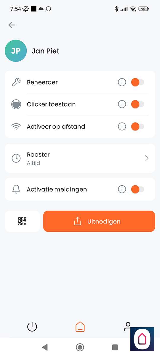 Het mooie van een slim slot is dat je derden toegang kunt geven zodat zij dus ook naar binnen kunnen. Handig voor je schoonmaker of als je een Airbnb hebt. Bij het aanmaken van een gebruiker krijg je naast de opties om hem beheerder te maken, opties om de "clicker" toe te staan, activeren op afstand aan/uit te zetten en je kunt meldingen krijgen als iemand de deur opent.