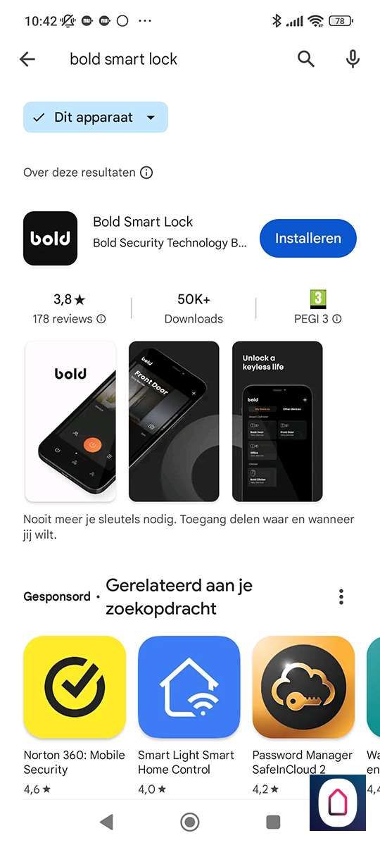 Dit slot van Bold moet super gemakkelijk te installeren zijn. Op de doos staat zelfs binnen 5 minuten. Nou, we gaan het mee maken. De eerste stap is om de APP te installeren, in de handleiding staat een QR-code, er is een iOS en Android versie beschikbaar. Het inloggen/registeren gaat via jouw mobiele nummer waar naar een SMS wordt gestuurd met een nummer. Wel zo'n veilig optie en dit werkt ook altijd (mail wil nog weleens niet aankomen).