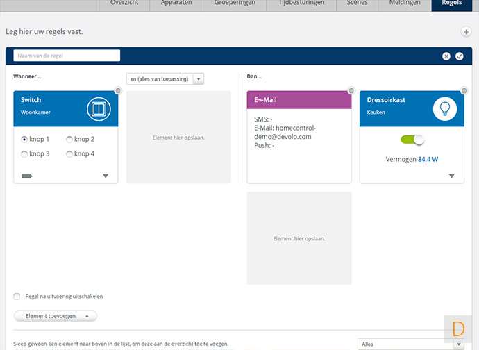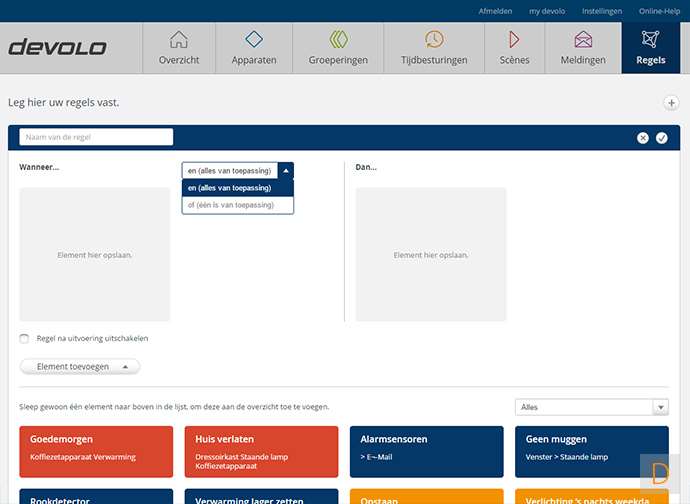 Als laatste onderdeel op het dashboard is het regel maken gedeelte. Hier kun je wat complexere zaken regelen. Zo kun je bv instellen dat er bij beweging, via een bewegingsmelder, een lamp aan moet gaan. Dit is dus iets anders dan het tijdsbesturing gedeelte.