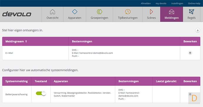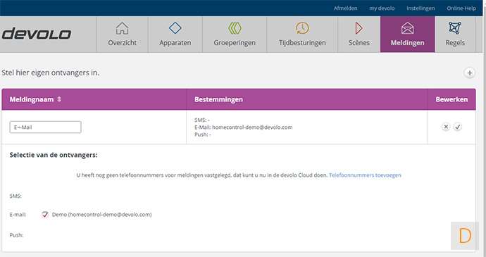 In het meldingen scherm is de mogelijkheid om je melding via email, sms en push in te stellen. Je kunt naast de hoofdontvanger ook een extra ontvanger aanmaken.