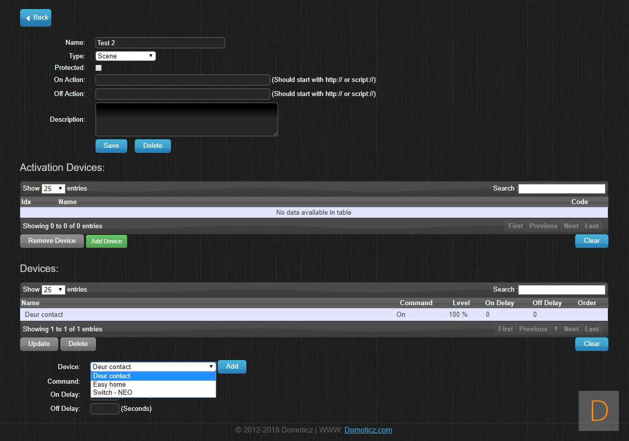 Nu we wat apparaten hebben toegevoegd kunnen we wat zaken gaan automatiseren. Dit kun je o.a. doen met scene's en met events welke ik later zal behandelen. Met een scene kun je o.a. groepen maken zo kun je verschillende verlichting met elkaar bundelen. Deze kun je dan met 1 knop tegelijk aanzetten (of uit).