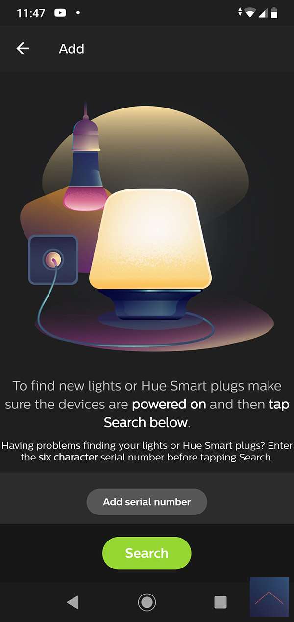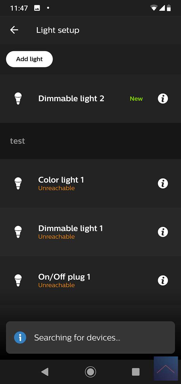 Start vervolgens de HUE app op ga naar je verlichting setup en druk op "add light". Als de LED op de dimmer rood oplicht, moet je de dimmer eerst even resetten. Dit kun je doen door de reset knop 5 seconden ingedrukt te houden. Hierna zal de LED niet meer oplichten. Als de LED meteen blauw is hoef je hem niet te resetten/kun je deze stap overslaan.