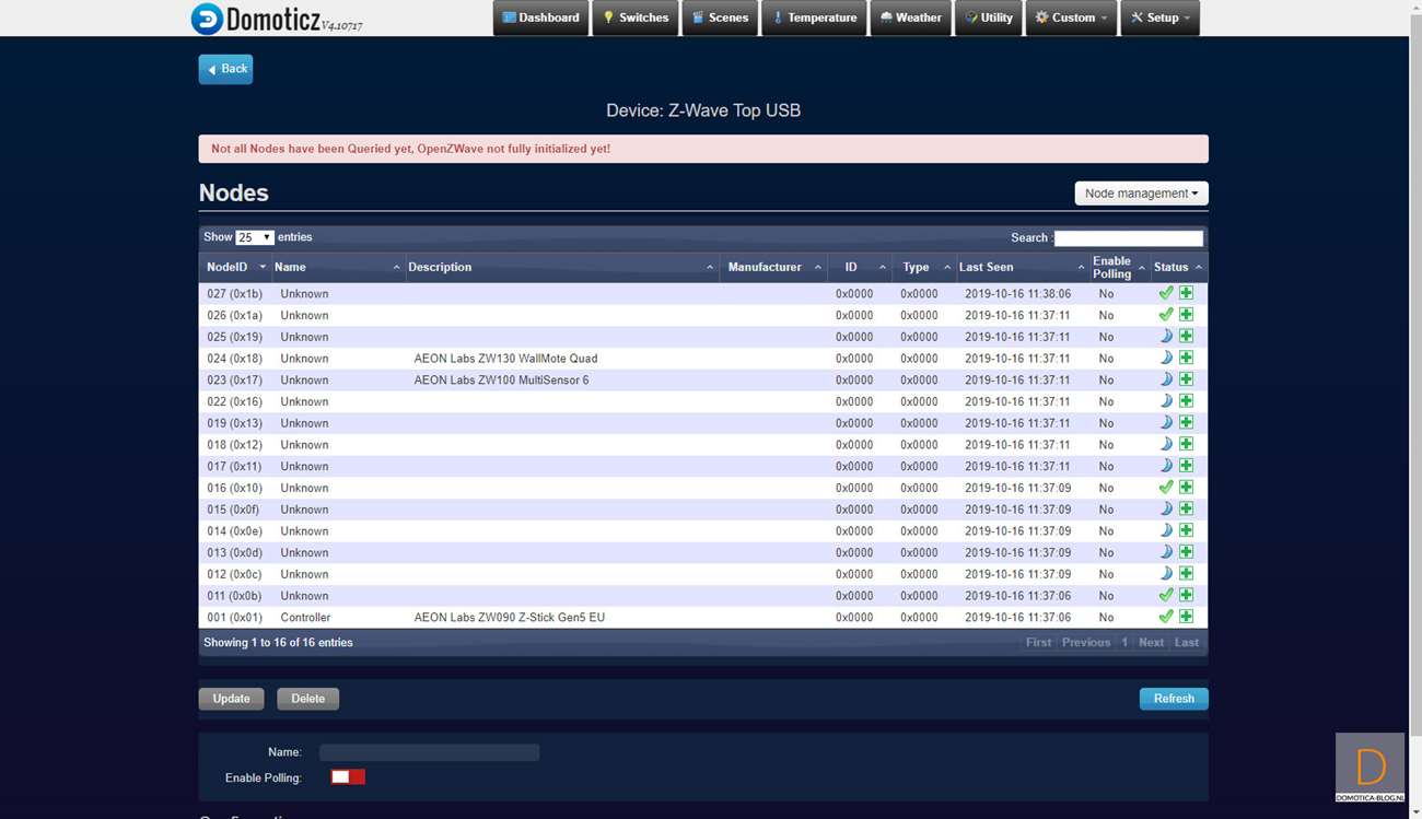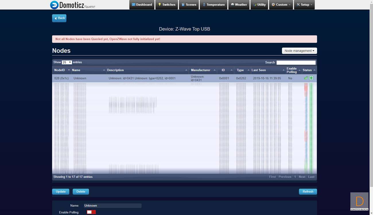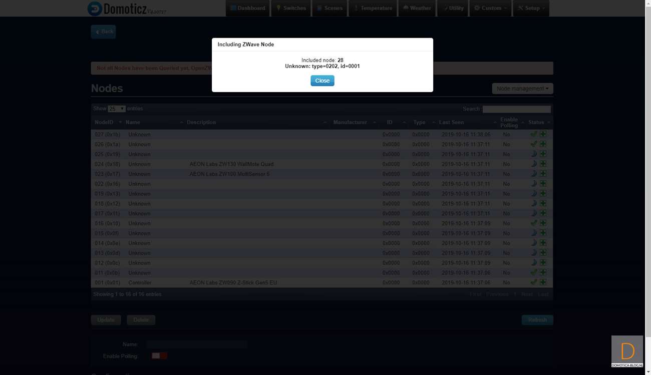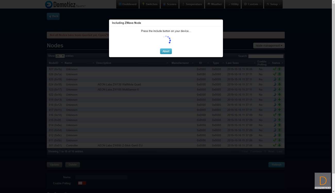 Je kunt beter eerst inloggen op Domoticz en naar en naar het menu item "setup" en hierna naar "hardware" gaan. Vervolgens klik je op setup van de Aeon Labs controller en ga je naar include node (aan de rechterkant). Voorzie hierna de dimmer van stroom. Hij werd vrijwel direct gevonden en zie een aan- en uit schakelaar en ik kan het dimniveau bepalen.