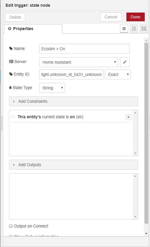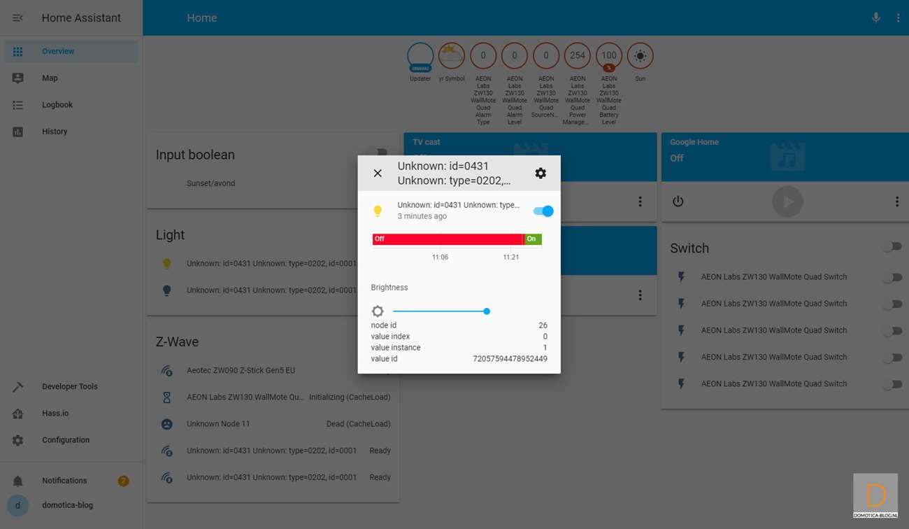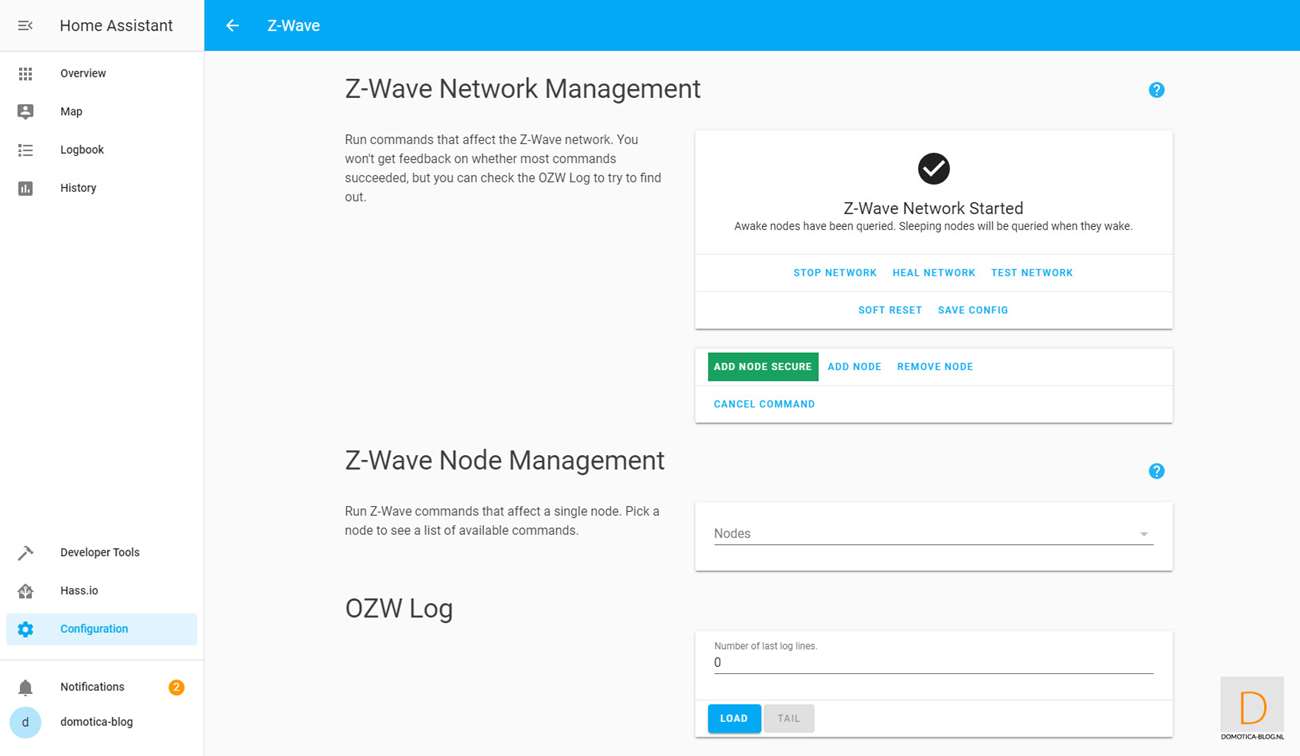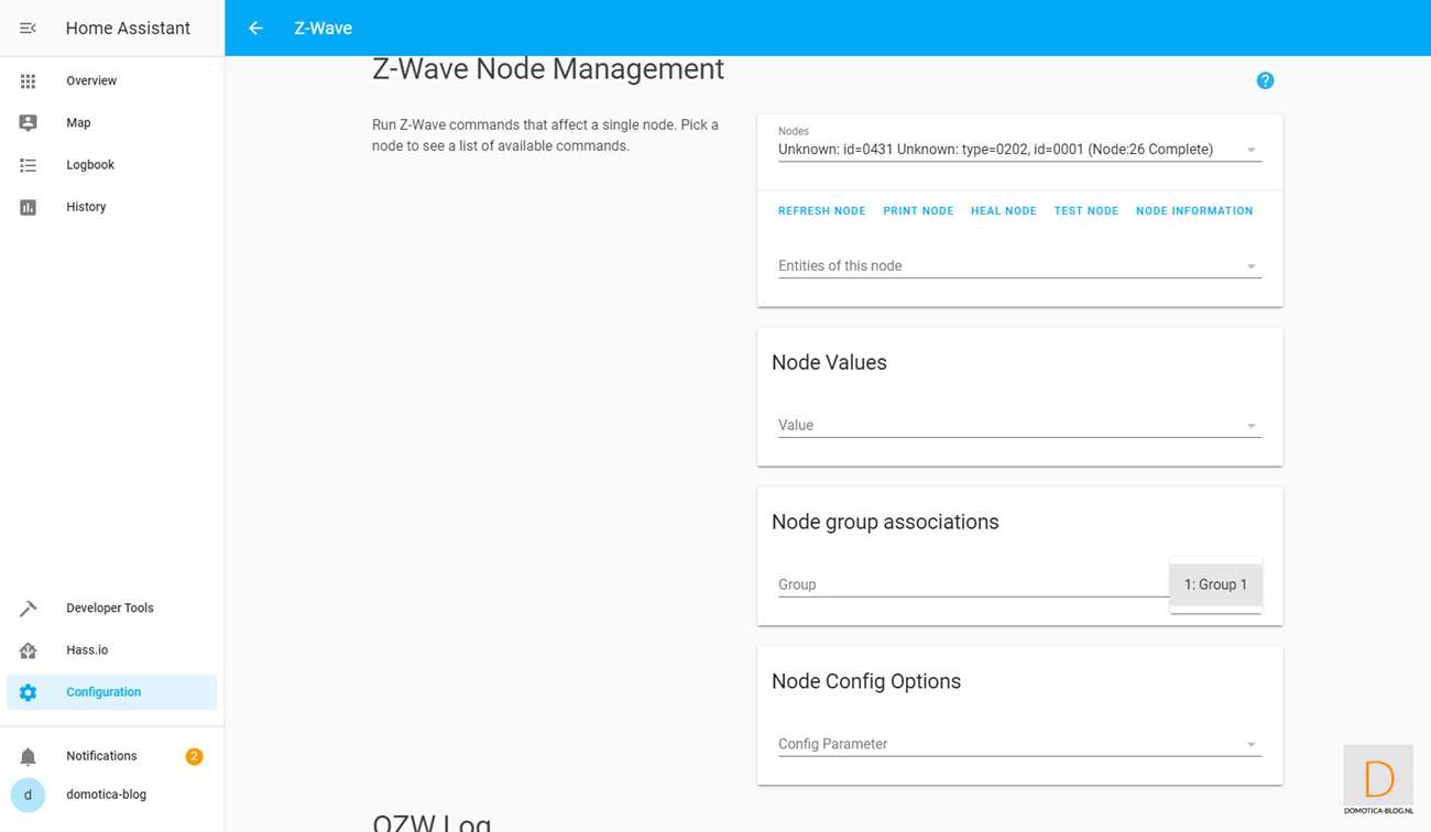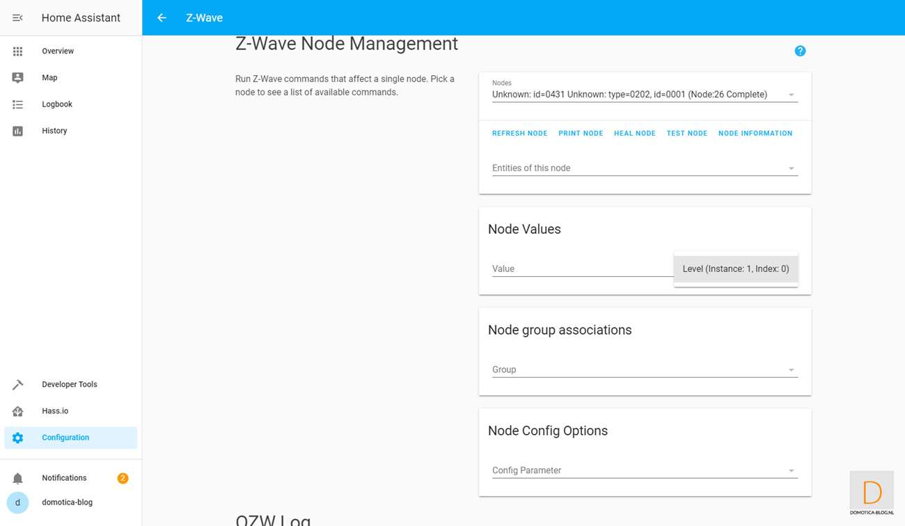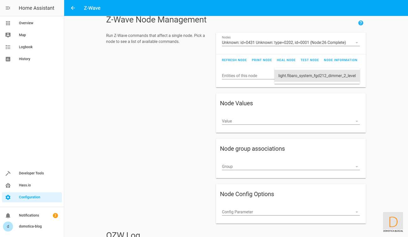 Het is namelijk gemakkelijker om de dimmer eerst toe te voegen. Dit doe je door in te loggen op HASS via je browser en naar je configuratie en hierna naar Z-Wave te gaan. Vervolgens klik je op "add node" om het toevoegen te starten. HASS geeft een zeer korte melding dat het toevoegen is gestart. Je voorziet hierna de dimmer van stroom. Er lijkt niks te zijn gebeurd maar na het openklappen van het nodes menuutje zie ik de Dimmer staan.
