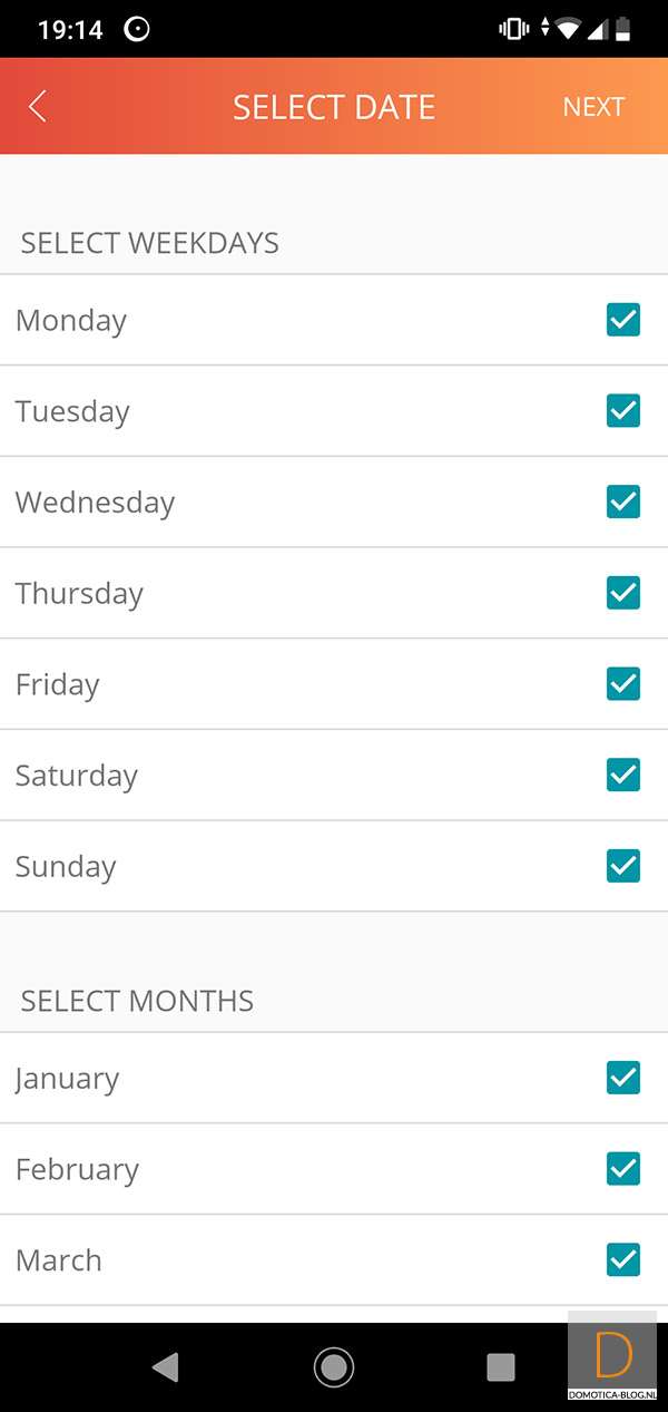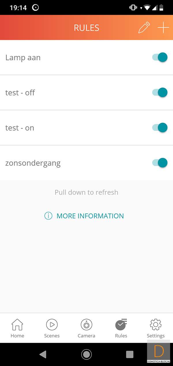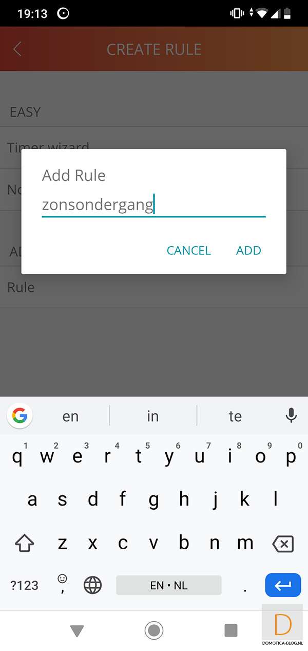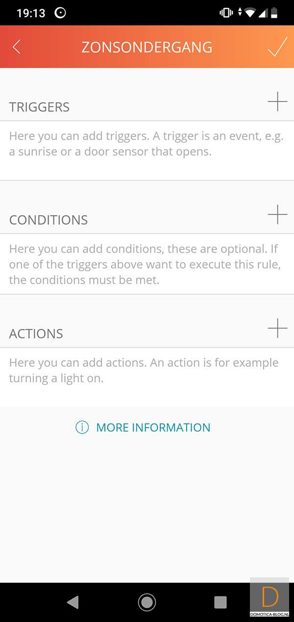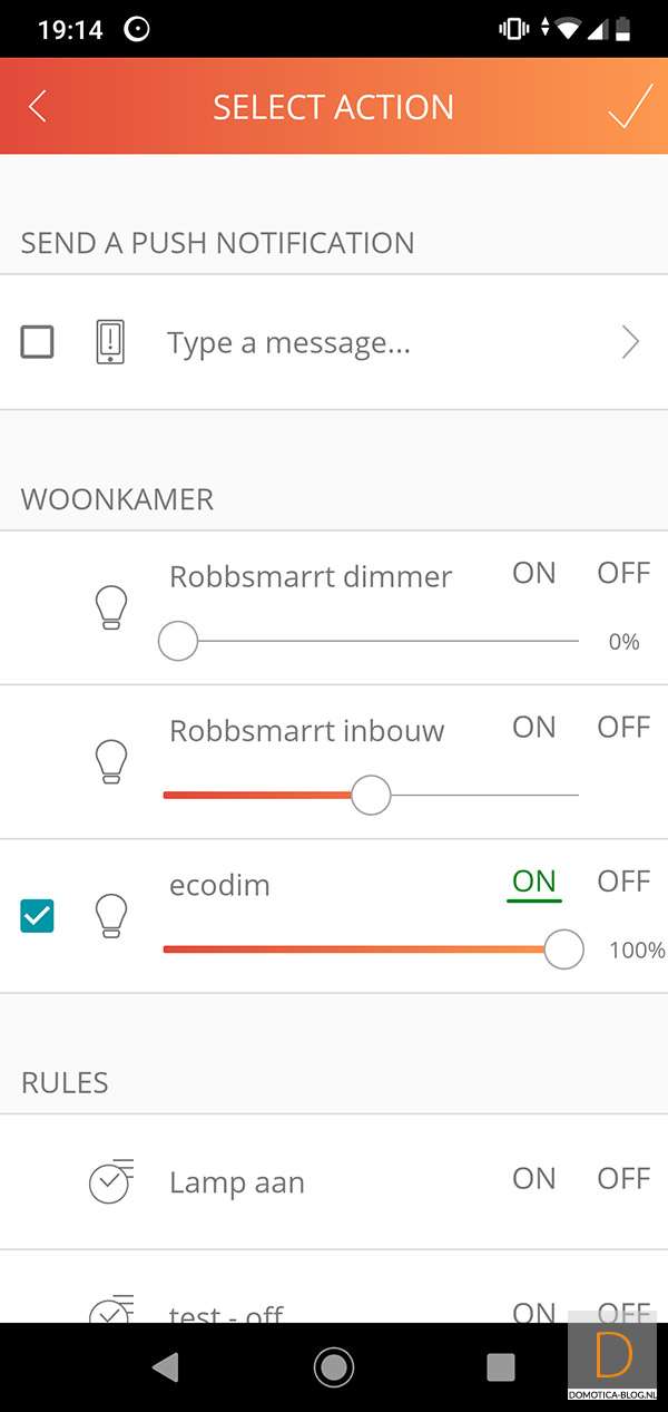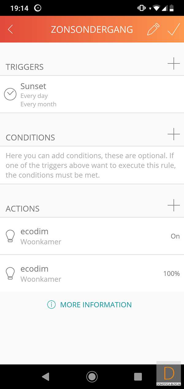 Voor de voorbeeld regel wil ik laten zien dat als de zon ondergaat, dat de Eco-DIM wordt aangezet. Dit kun je regelen met het "rule" gedeelte. Zie onderstaande schermen.