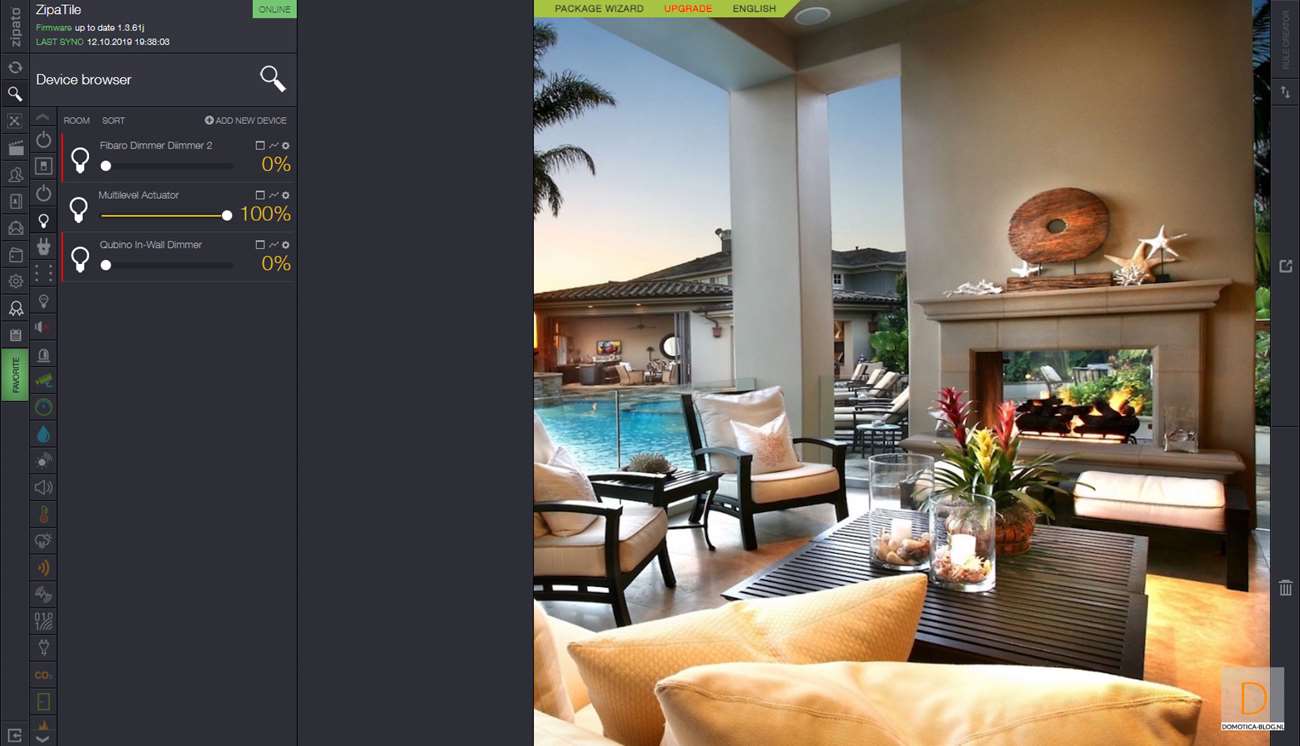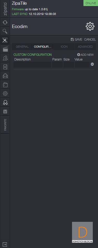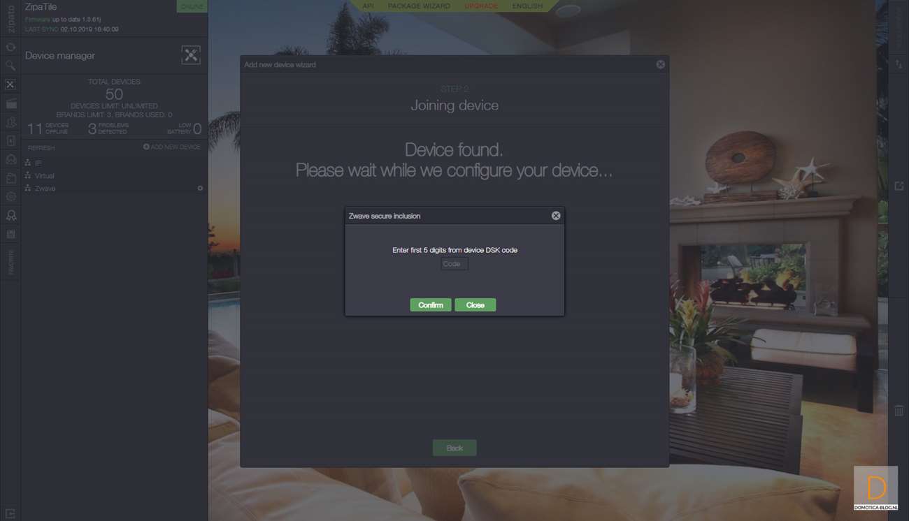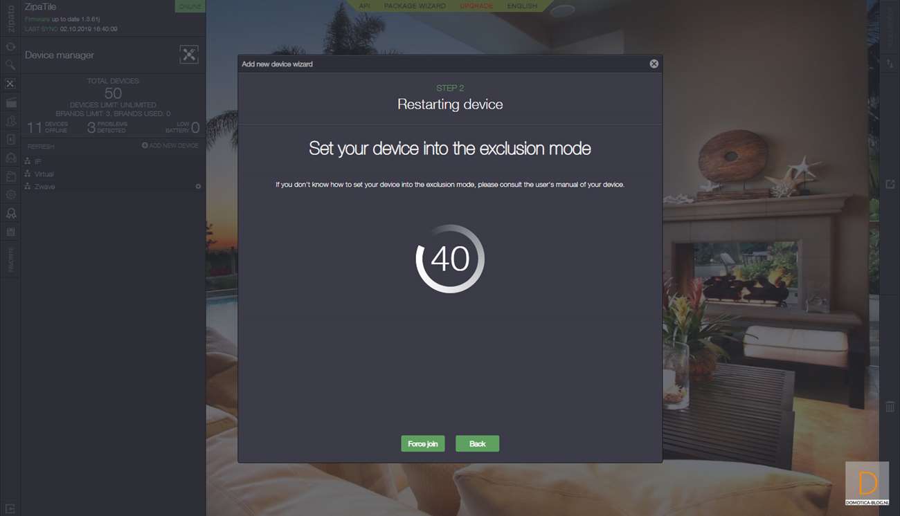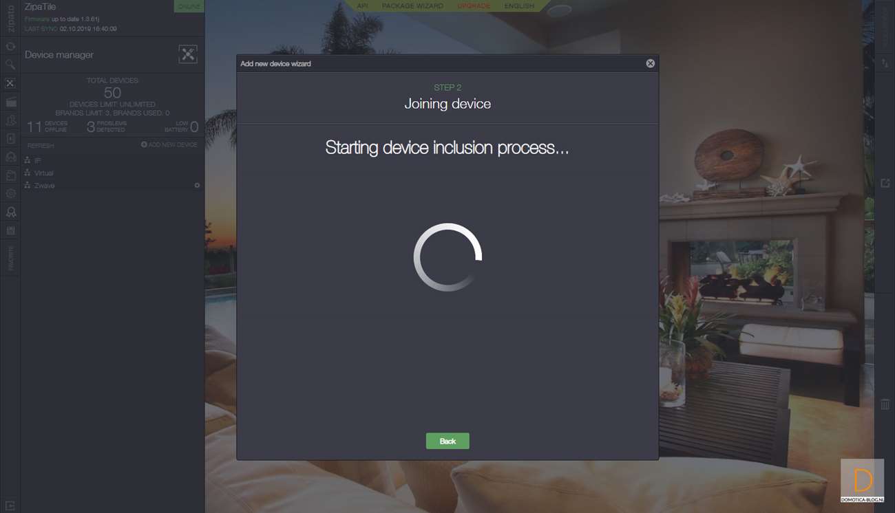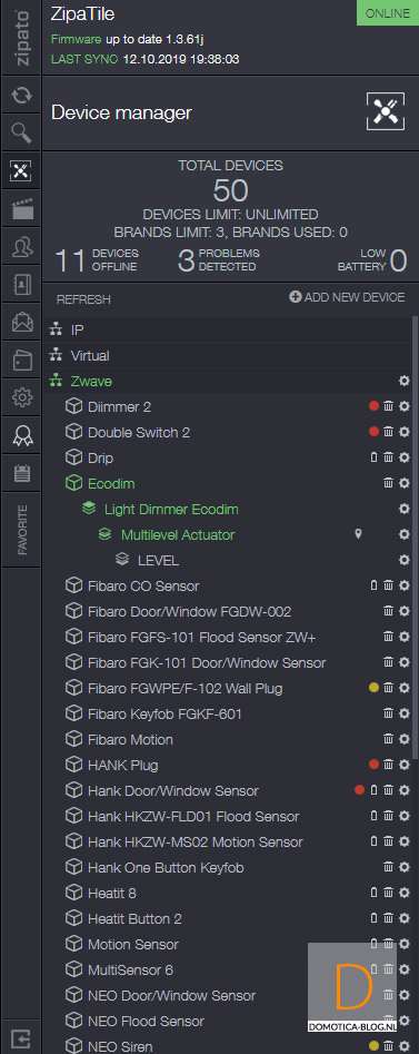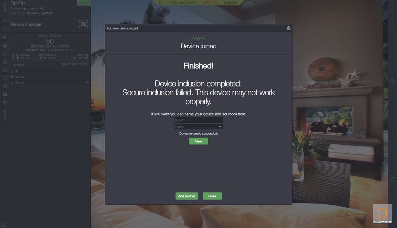Het is namelijk gemakkelijker om de dimmer eerst toe te voegen. Dit doe je door in te loggen op de Zipatile en naar het apparaten gedeelte te gaan. Je klikt vervolgens op "add new device" en hierna op Z-Wave. De Zipatile zal de dimmer eerst resetten/verwijderen dus de volgende stap is de dimmer van stroom te voorzien zodat dit kan gebeuren. Er gebeurde bij mij helaas niks maar als je 4x achter elkaar op het knopje aan de voorkant drukt dan start je het toevoegen ook. Hij werd hierna gereset en drukte ik nogmaals 4 keer op het knopje om hem daadwerkelijk toe te voegen.