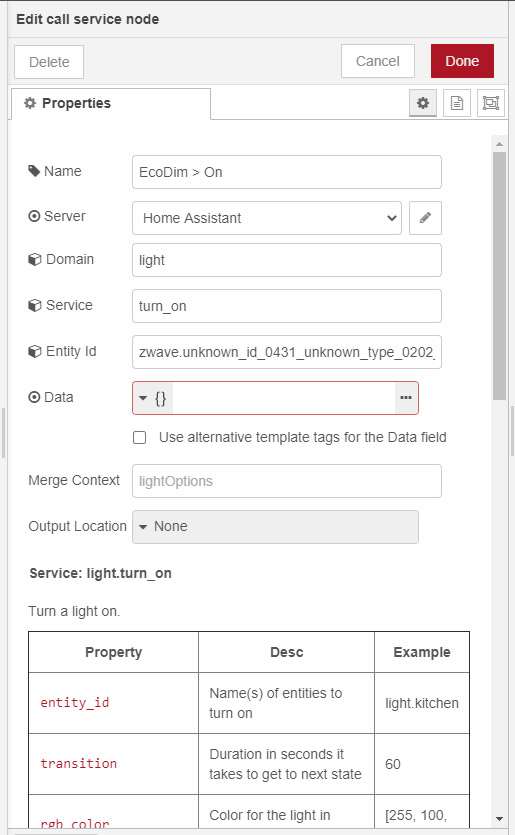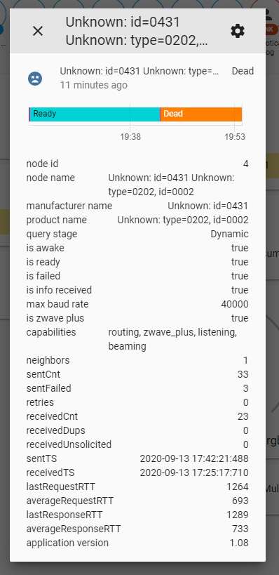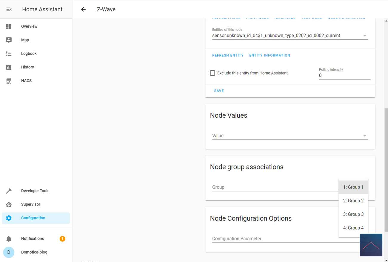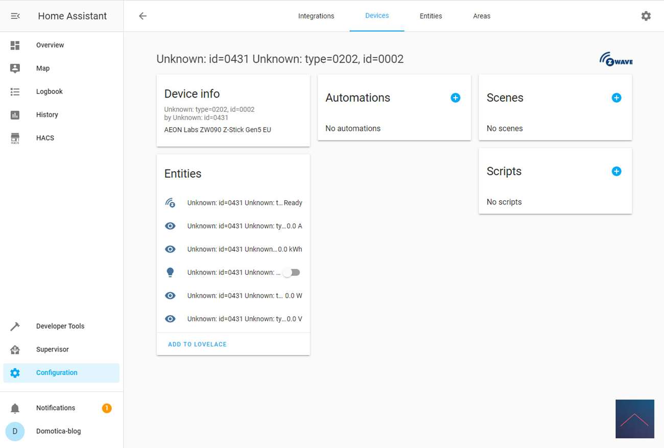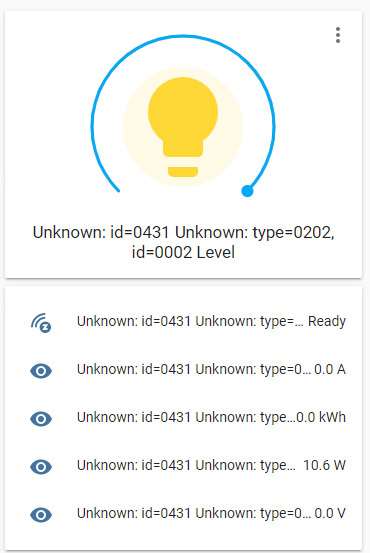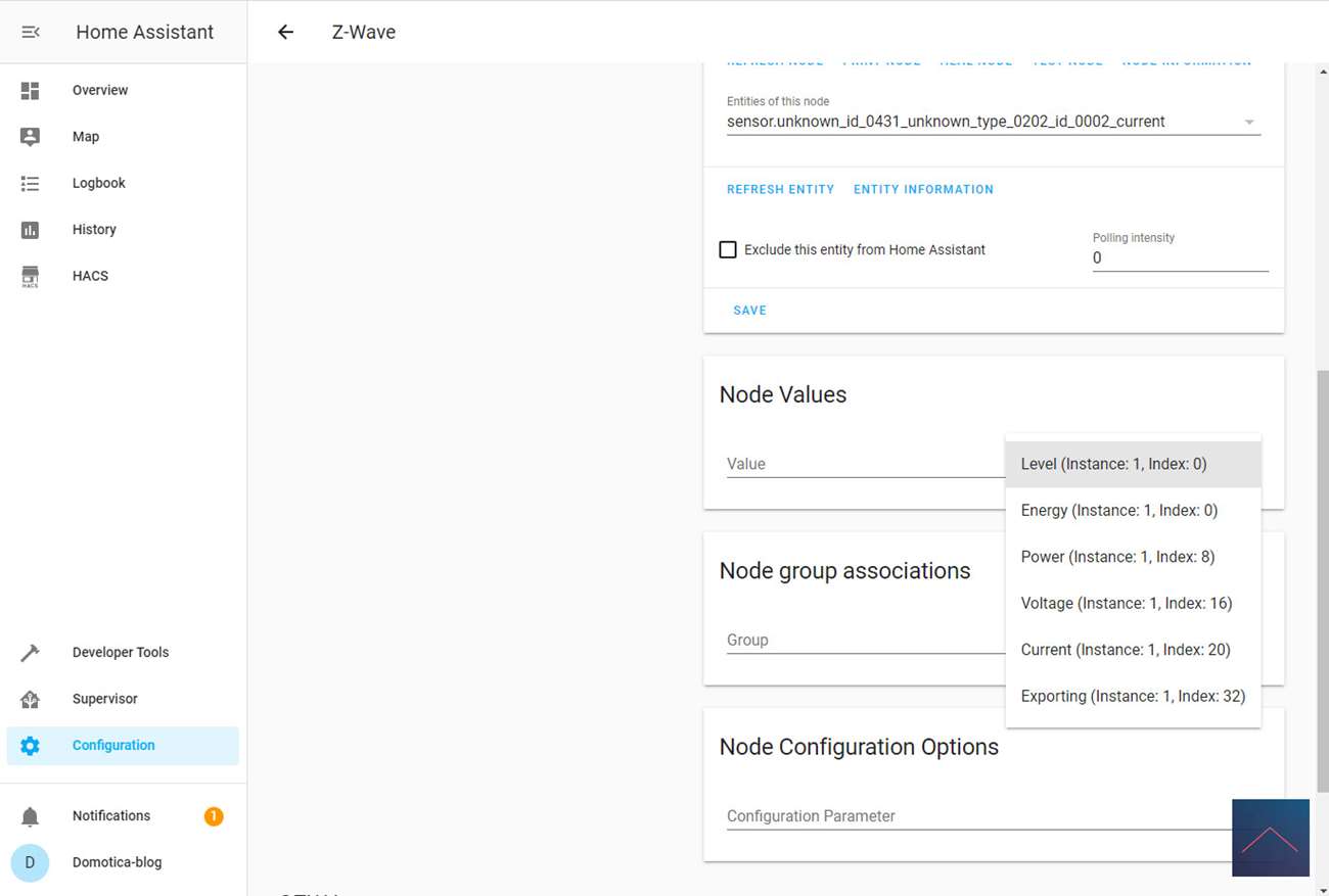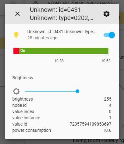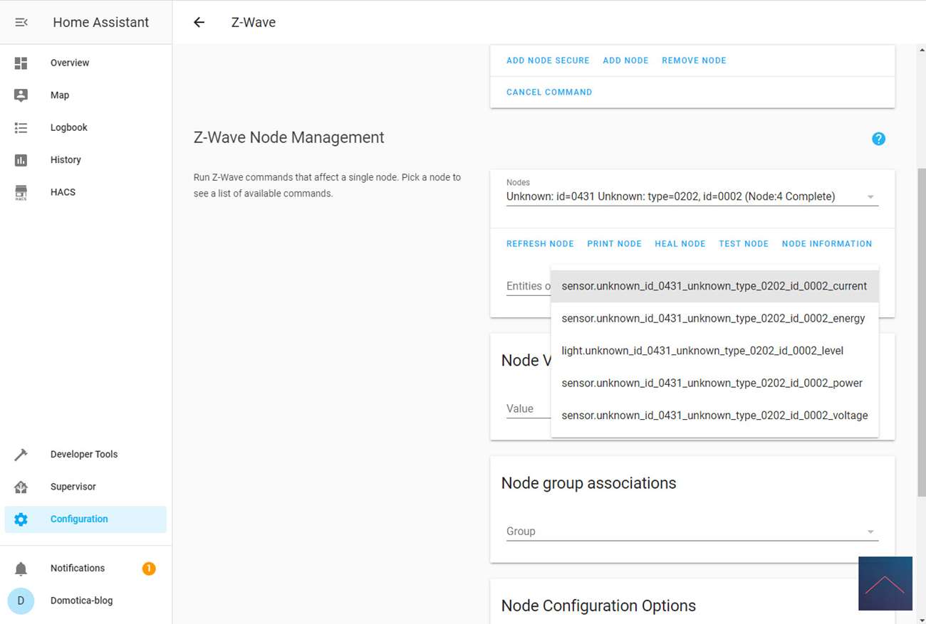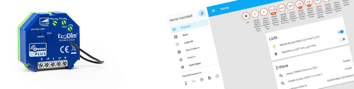 Er komt weer geen melding maar als we het pull down menu van de nodes openen zien we daar een onbekend apparaat. Dit is de Eco-DIM want dit kunnen we aan de configuratie zien. Na het toevoegen van de diverse nodes zie ik een dimmer, aan/uitschakelaar en ik zie het totaal verbruik en huidige verbruik. Er is ook een Voltage en Ampere meter maar deze geven 0 als waarde terug en updaten niet.