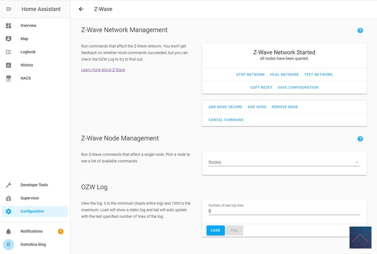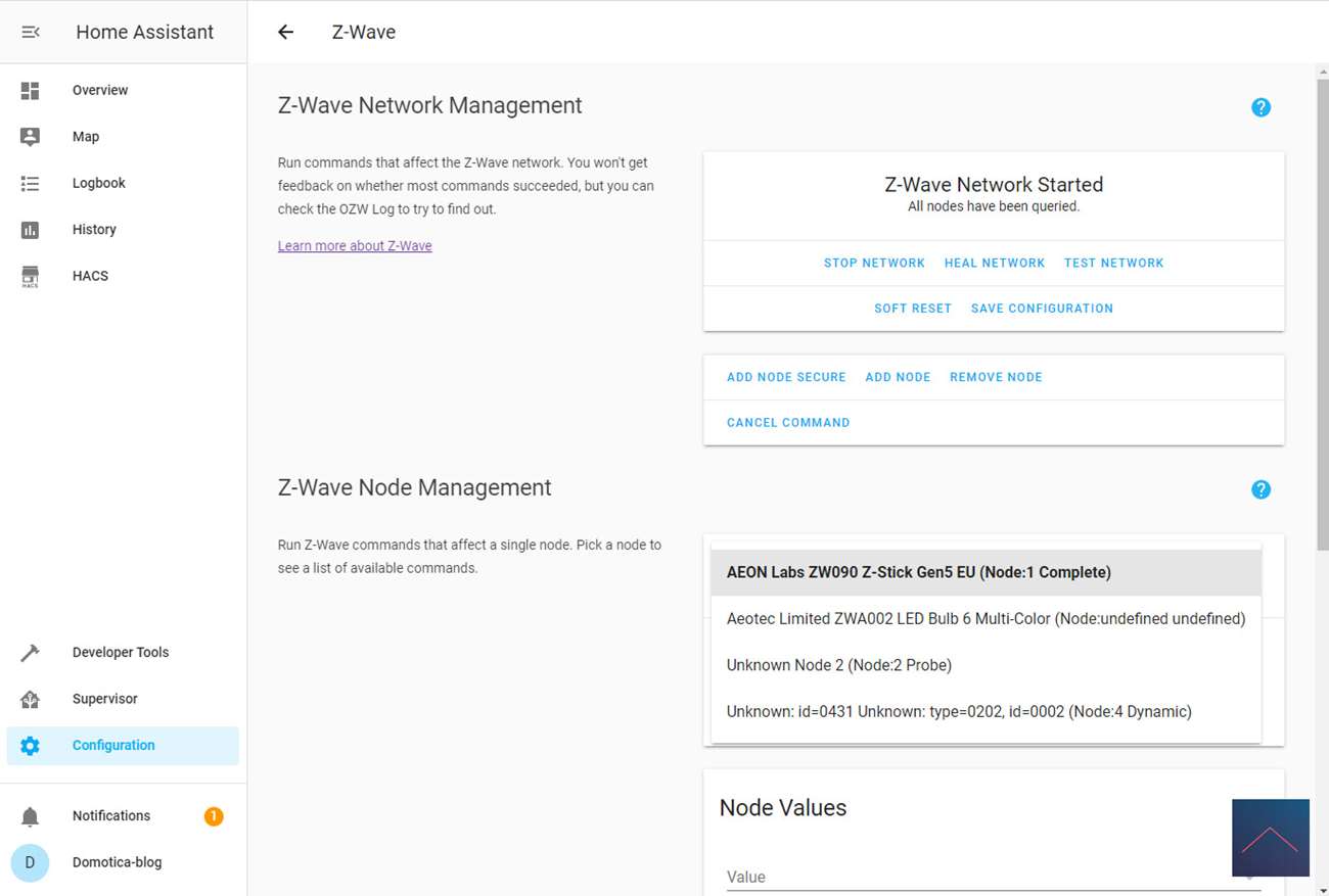 We gaan namelijk eerst inloggen op HASS en gaan naar de configuratie en scrollen naar beneden naar Z-Wave. Wij gebruiken een Aeotec USB Z-wave stick om hem toe te voegen. In het Z-wave scherm klik je vervolgens op "add node secure". Er gebeurt helaas niks en hij wordt ook niet toegevoegd. We proberen het nog een keer maar drukken nog 2x op het knopje aan de voorkant van de dimmer.