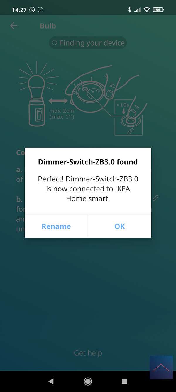 Vervolgens voorzien we de dimmer van stroom en resetten we hem door de reset knop 10 seconden ingedrukt te houden. De LED zal rood oplichten en vervolgens uitgaan. Nu drukken we de reset knop 4x achter elkaar in. We starten nu de toevoegen procedure (op de HUB) door op Bulb te klikken en vervolgens op de Ikea afstandsbediening. Hierna druk je het knopje aan de achterkant van de afstandsbediening in en houd deze 10 seconden vast.
