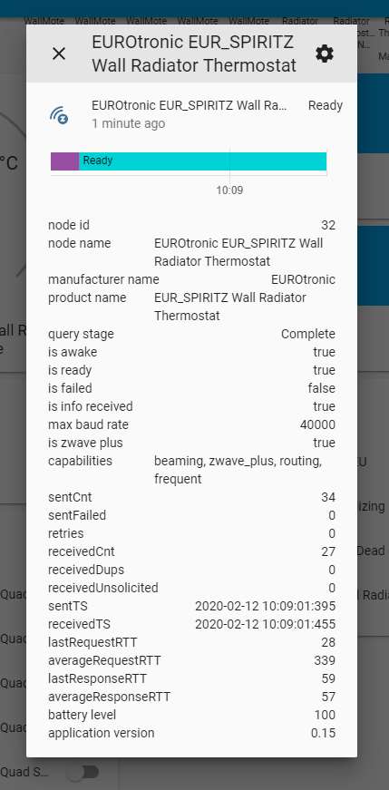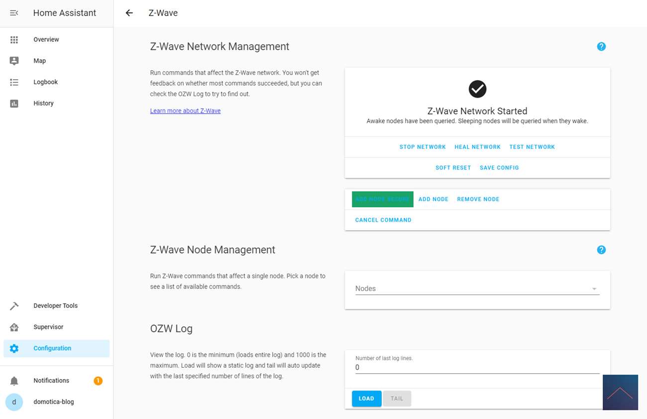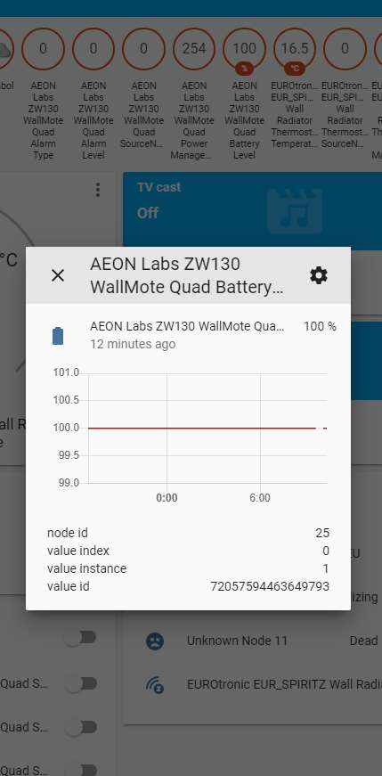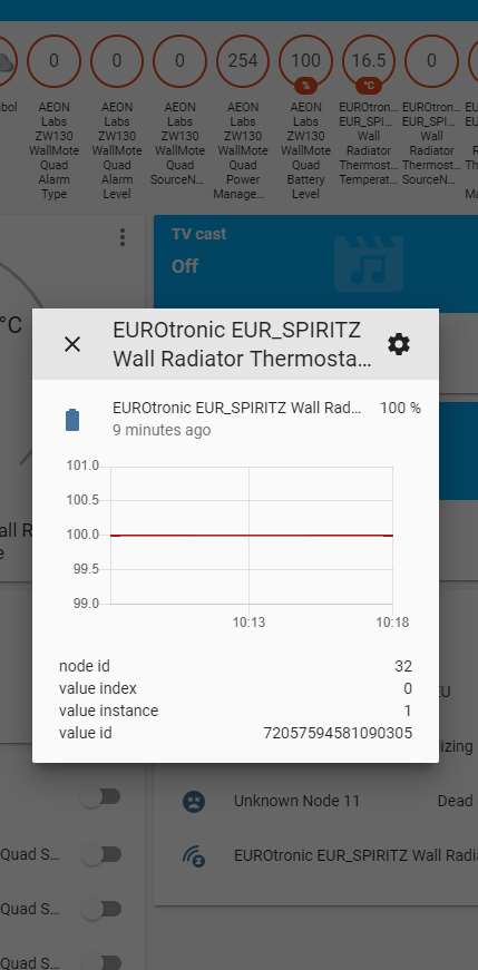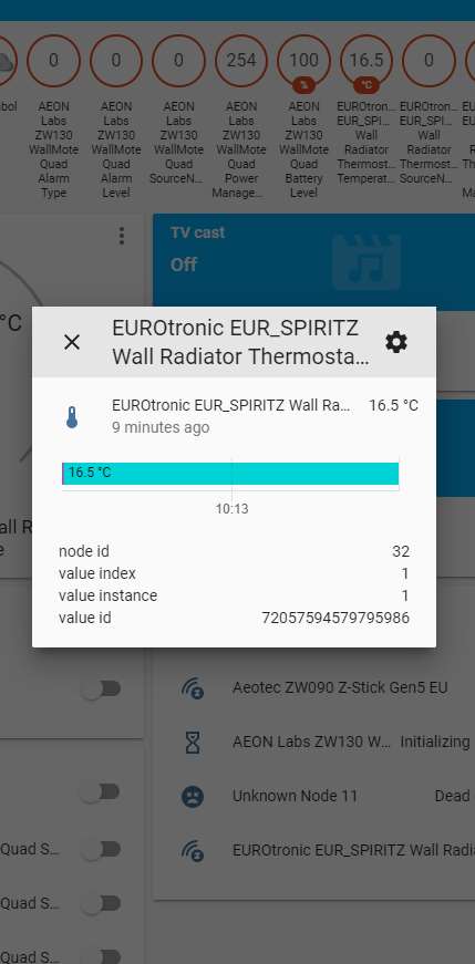 Log vervolgens in op HASS en ga naar je configuratie en dan naar Z-Wave. Klik vervolgens op de add node secure om het toevoegen te starten. Bij HASS komt er geen melding maar je moet hierna de boost knop op de kraan indrukken. Deze zal dan oplichten en gaan aftellen. Als je even wacht en dan klikt op nodes zie je hem verschijnen. Het aftellen op de kraan zal ook stoppen en de LED zal groen oplichten en in de display zal xx komen.