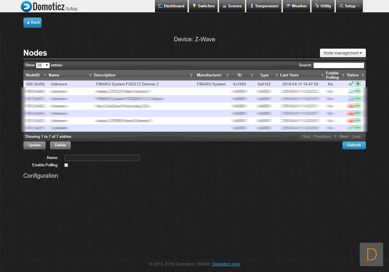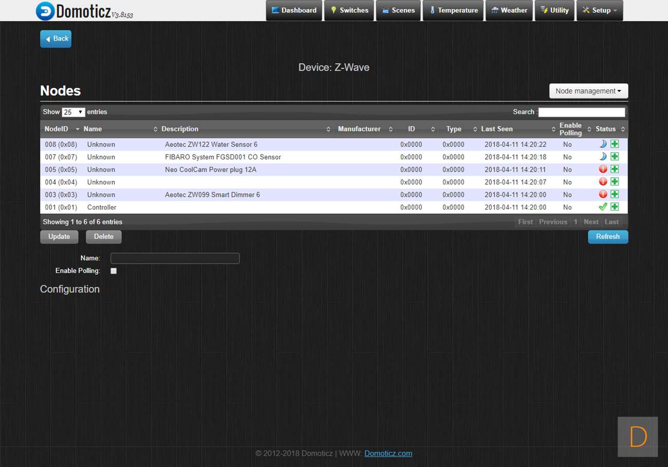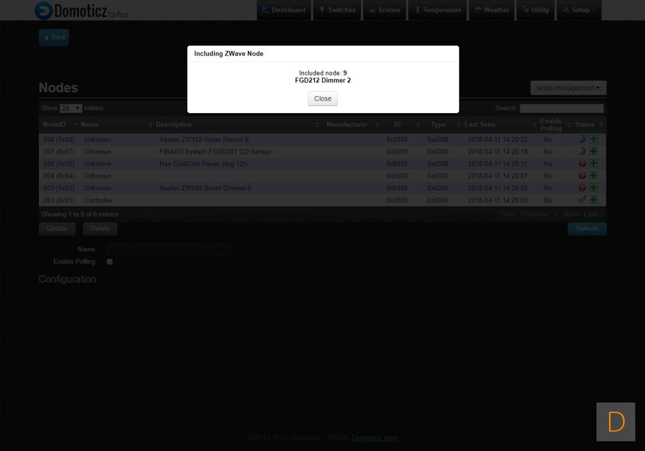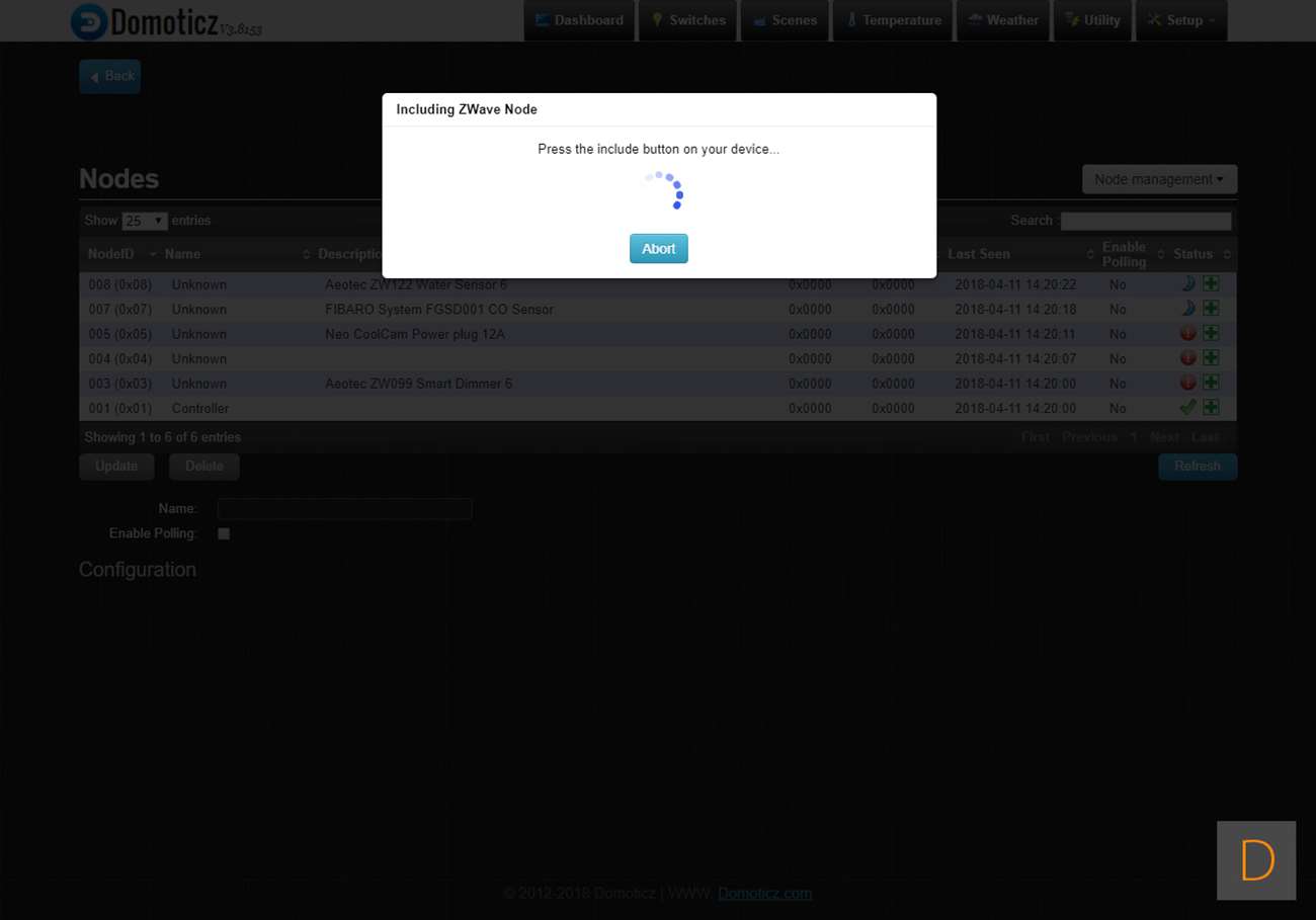 Als laatste controller is domoticz aan de beurt. Je kunt de Dimmer 2 toevoegen door naar Setup en hardware te gaan. Ik voeg hem via de Aeon Labs Z-Wave USB stick toe: dus klik ik daar op setup. Vervolgens ga ik naar rechterkant en klik in het menu op "include node". Daarna moet je de dimmer voorzien van stroom en 3x op het B-knopje drukken. Het ingebouwde lamp op de dimmer zal groen oplichten.