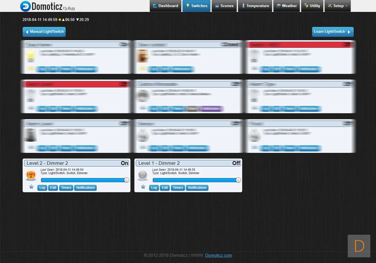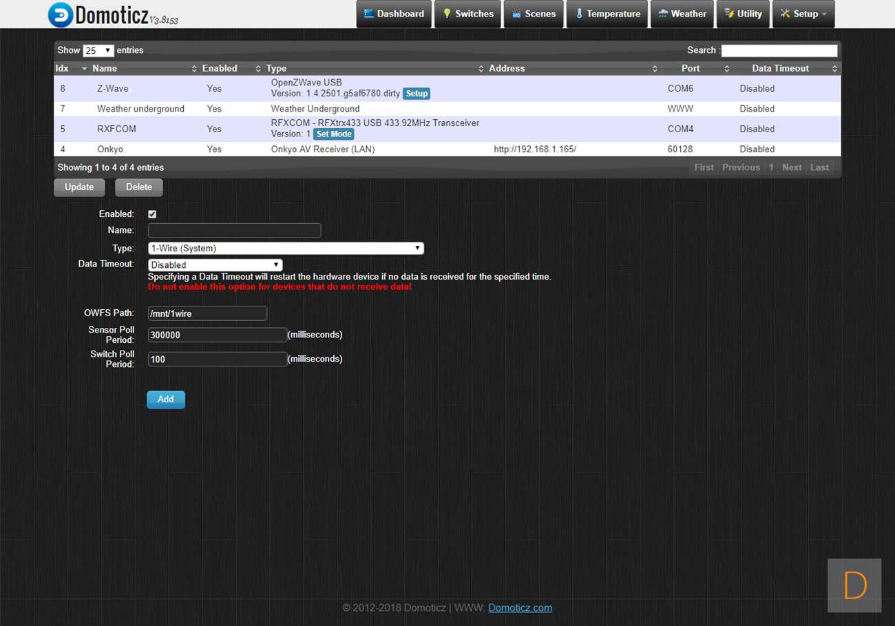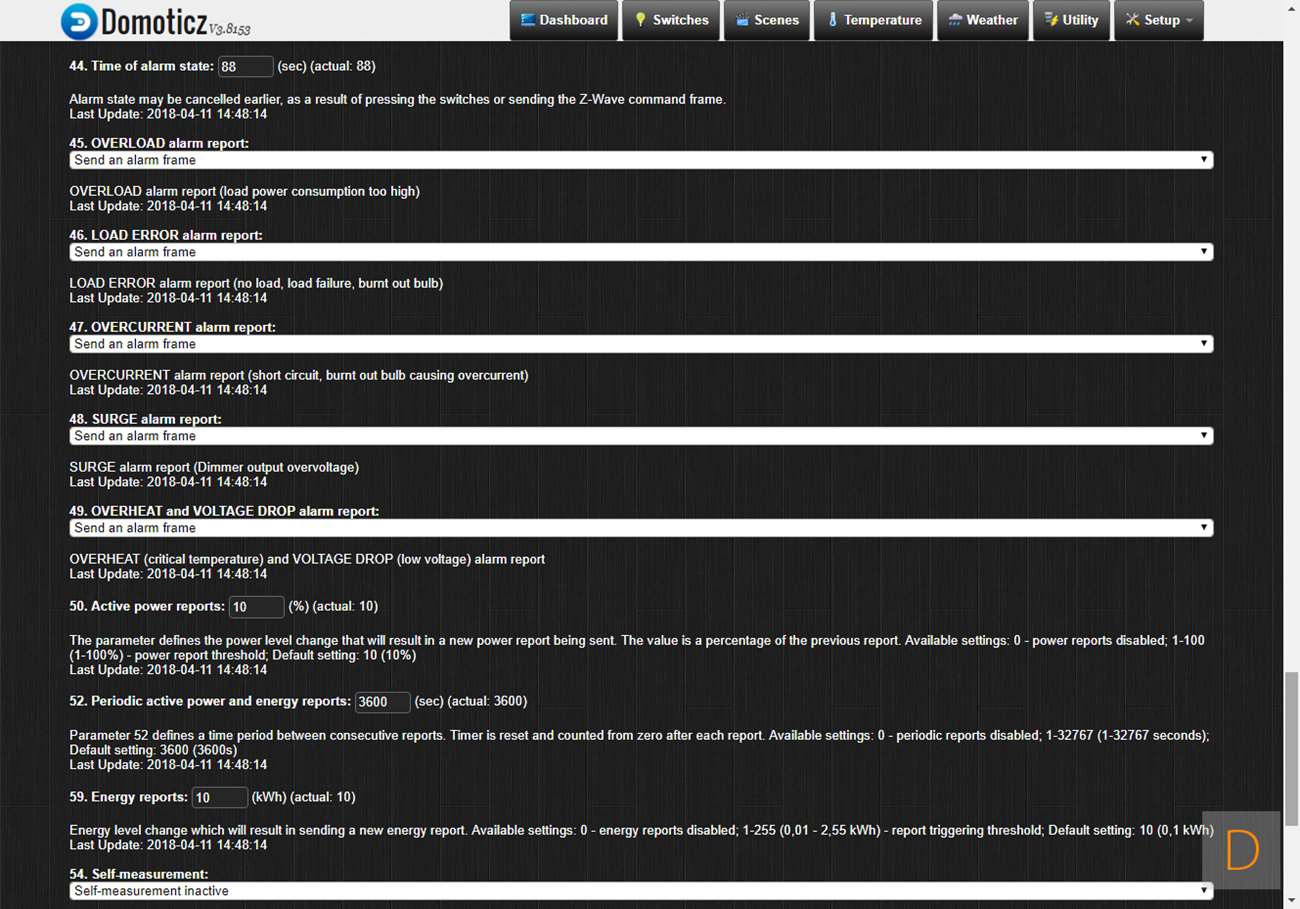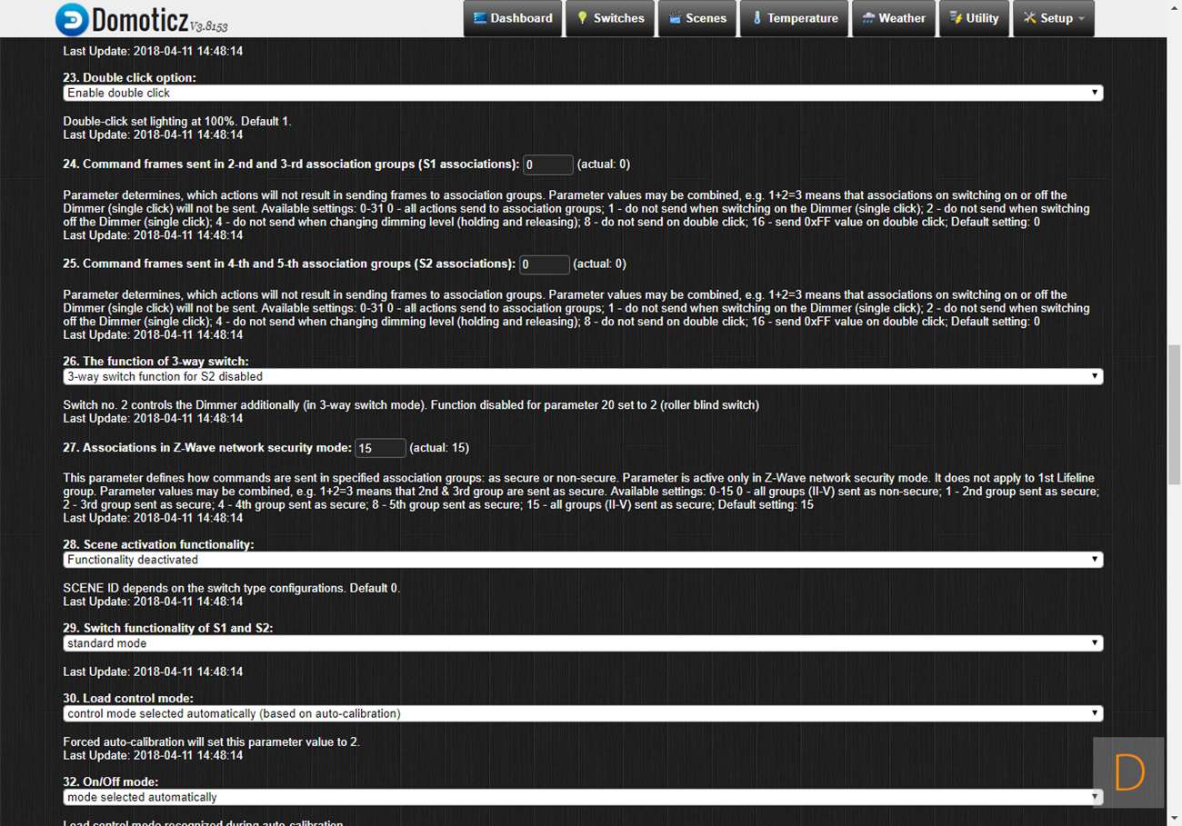 Als laatste controller is domoticz aan de beurt. Je kunt de Dimmer 2 toevoegen door naar Setup en hardware te gaan. Ik voeg hem via de Aeon Labs Z-Wave USB stick toe: dus klik ik daar op setup. Vervolgens ga ik naar rechterkant en klik in het menu op "include node". Daarna moet je de dimmer voorzien van stroom en 3x op het B-knopje drukken. Het ingebouwde lamp op de dimmer zal groen oplichten.
