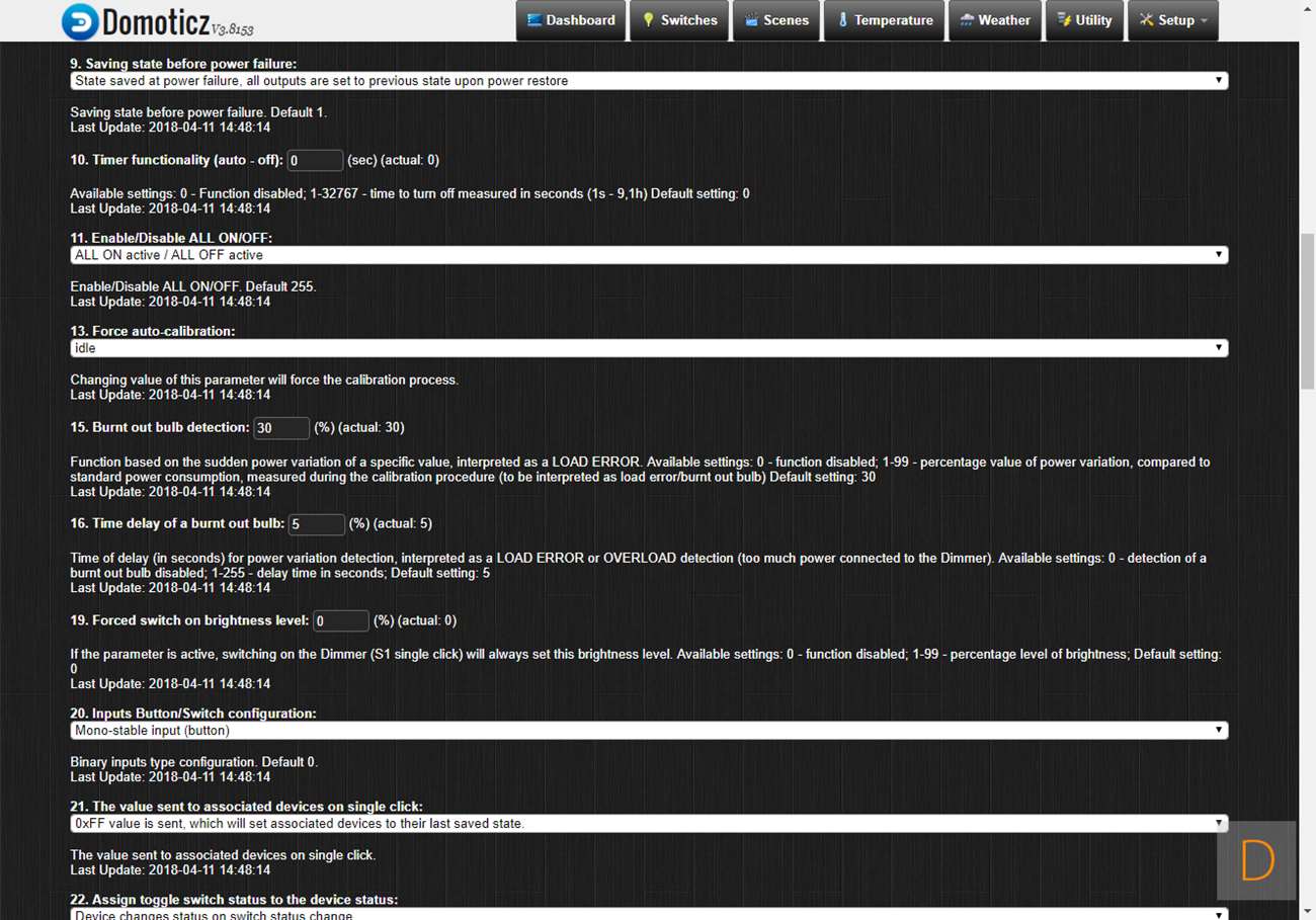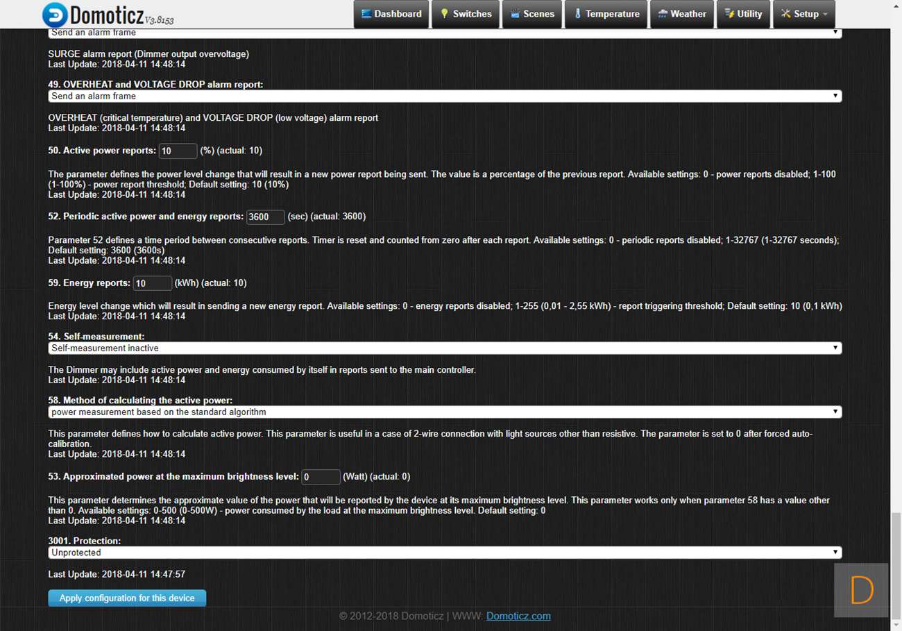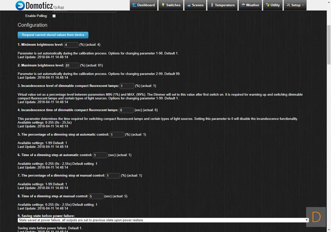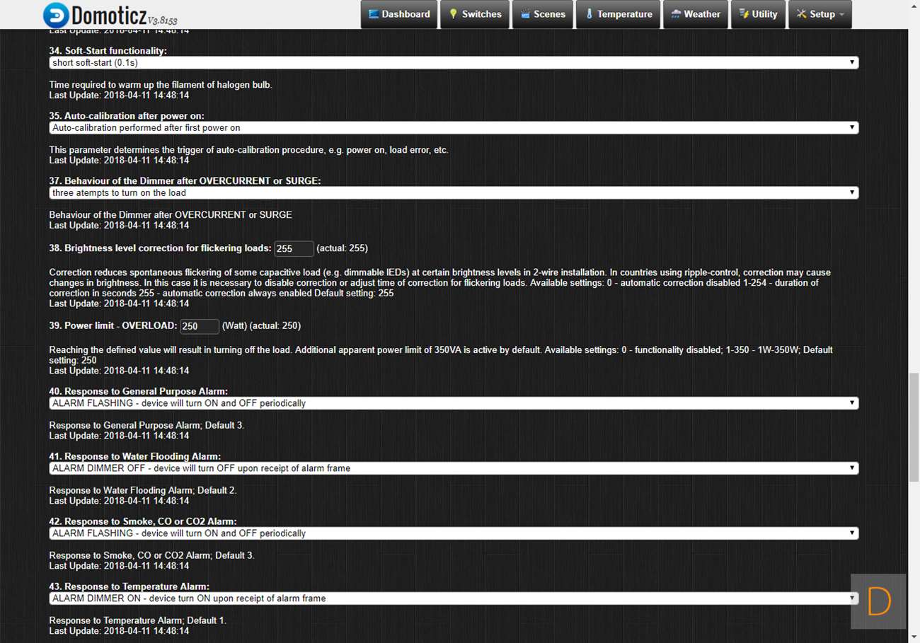 Als laatste controller is domoticz aan de beurt. Je kunt de Dimmer 2 toevoegen door naar Setup en hardware te gaan. Ik voeg hem via de Aeon Labs Z-Wave USB stick toe: dus klik ik daar op setup. Vervolgens ga ik naar rechterkant en klik in het menu op "include node". Daarna moet je de dimmer voorzien van stroom en 3x op het B-knopje drukken. Het ingebouwde lamp op de dimmer zal groen oplichten.