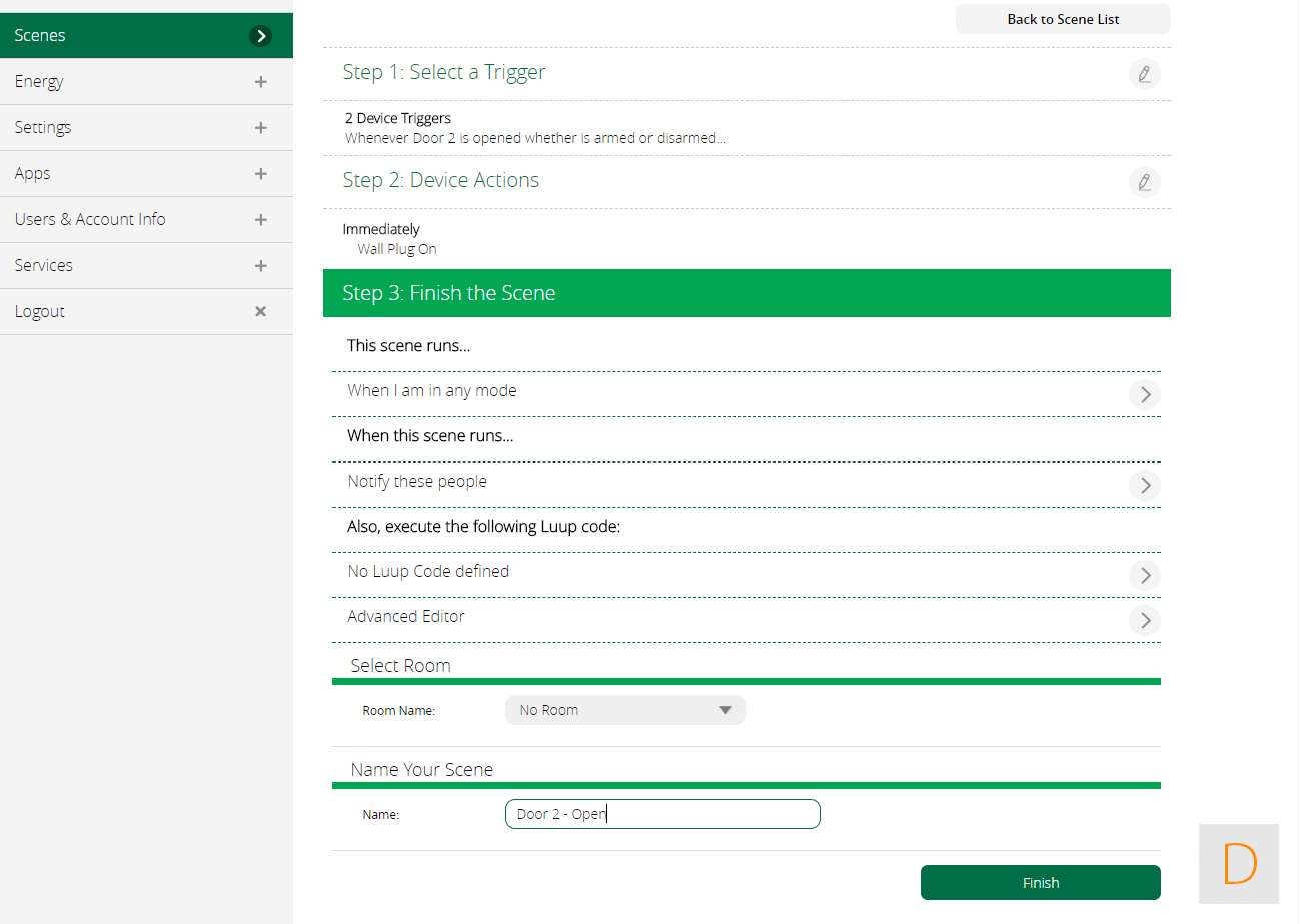Ik wil graag een scene maken die een lamp aanzet als de deur wordt geopend. Hierbij wil ik dat de lamp aan blijft als de deur ook open blijft en weer uitgaat na x seconde als de deur gesloten wordt.