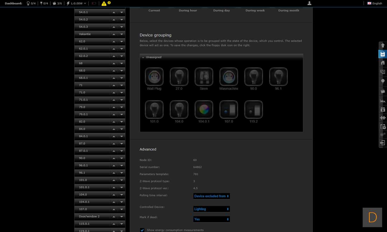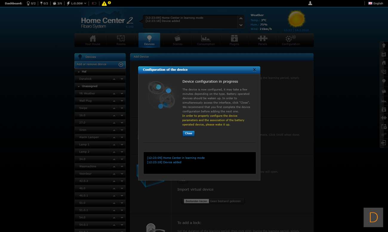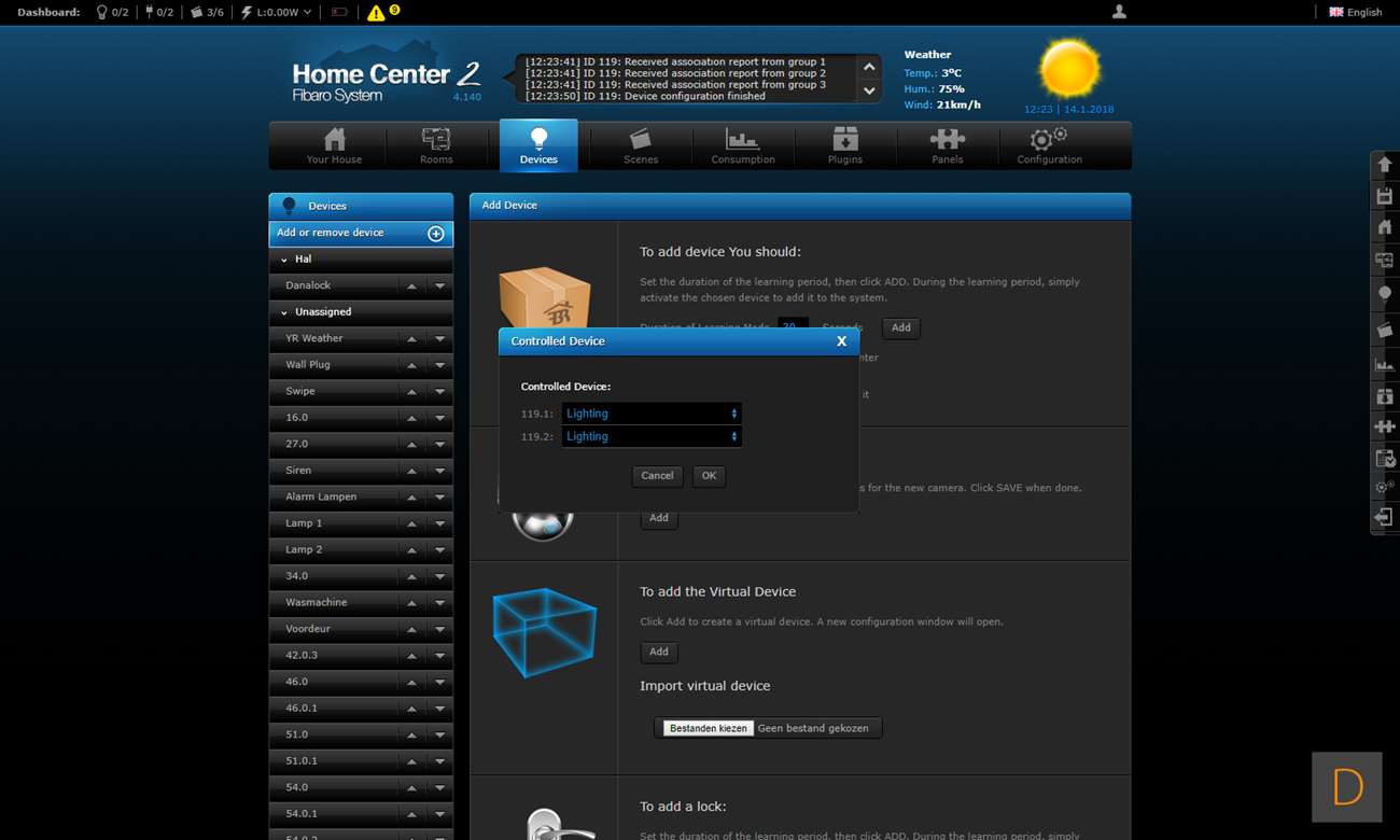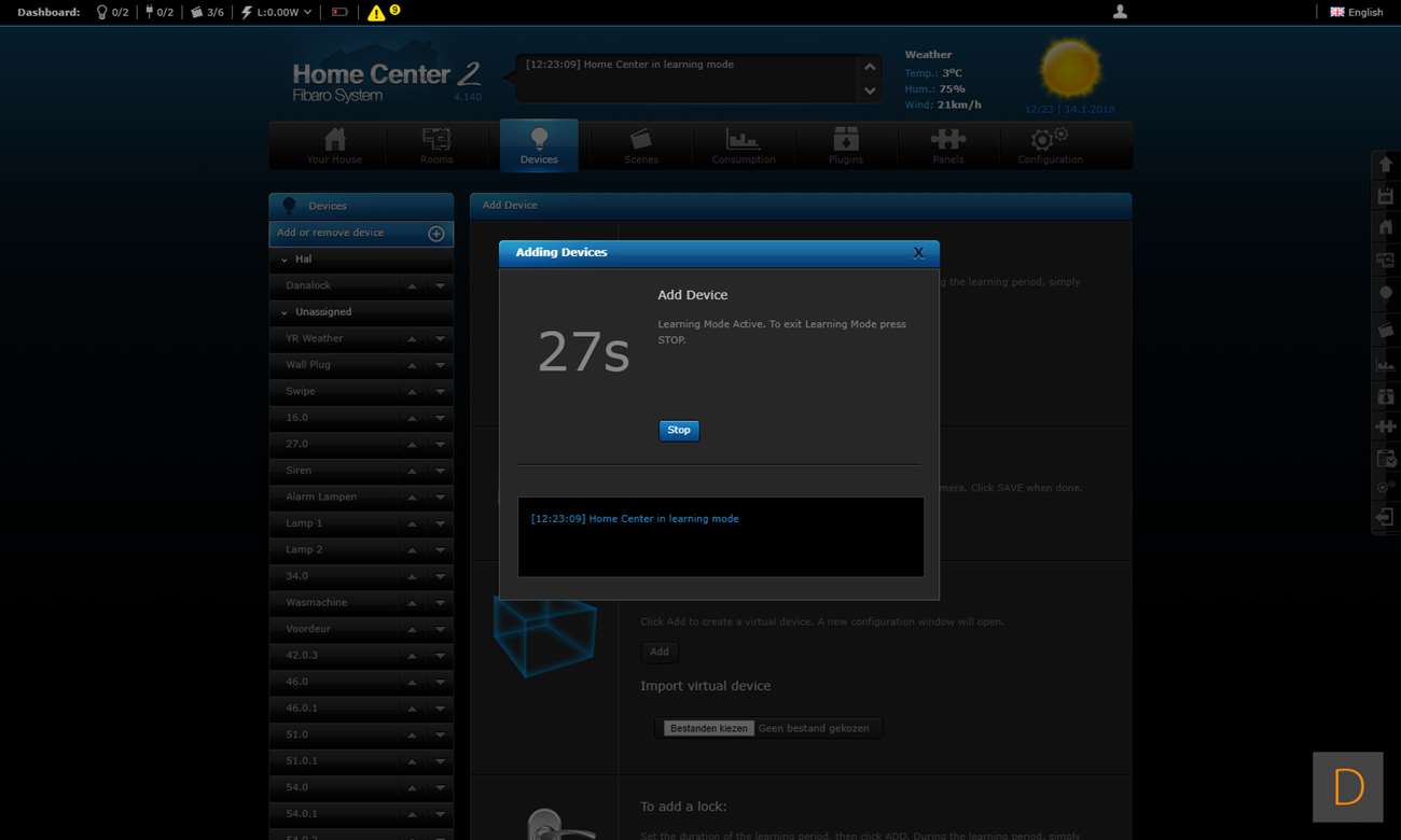 Het toevoegen van deze schakelaar moet natuurlijk appeltje eitje zijn voor de HC2. Dit product is tenslotte door hun zelf gemaakt. Om het toevoegen te starten log je in op je Home Center. Vervolgens ga je naar het device gedeelte en klik je op "add or remove device" en vervolgens op de "add" knop. Het aftellen zal beginnen. Hierna moet je de schakelaar voorzien van stroom. Je kunt het toevoegen starten door 3 keer snel achter elkaar op het knopje aan de voorkant te drukken. Je kunt het toevoegen ook starten door de wandschakelaar 3x snel achter elkaar in te drukken. Zorg altijd dat je dicht bij de controller bent als je gaat toevoegen. Hij werd uiteraard netjes gevonden en toegevoegd aan de HC2. Ik zie 2 schakelaars verschijnen met het totaal verbruik en huidige verbruik.