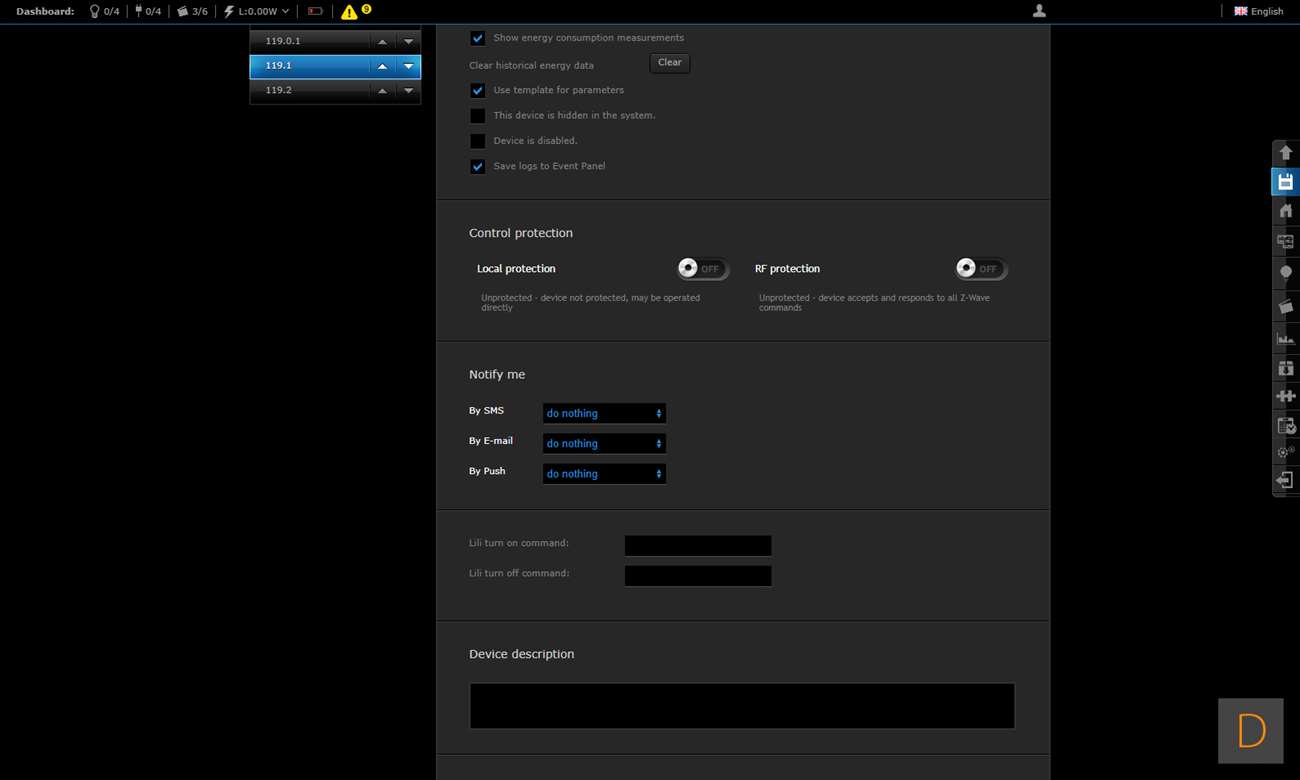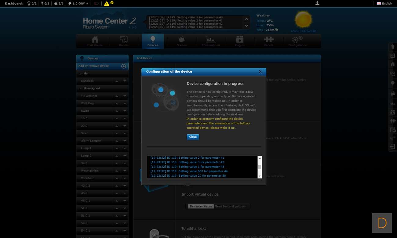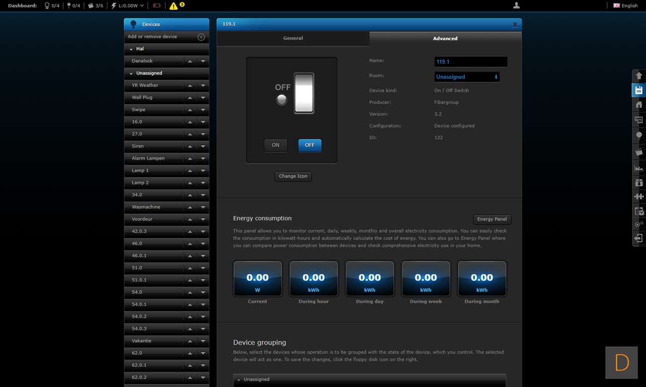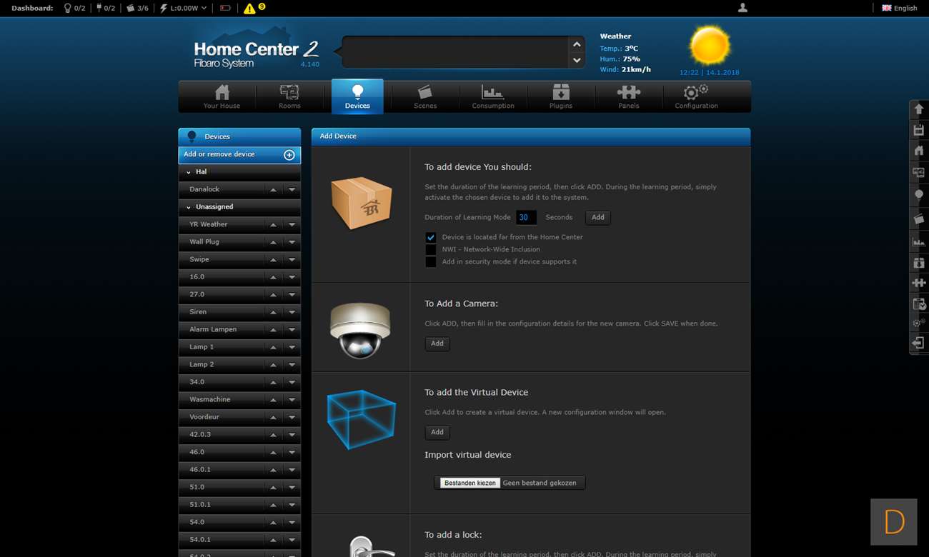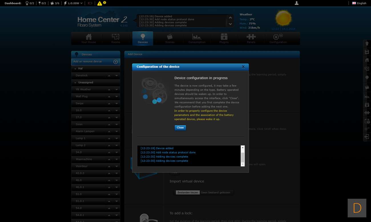 Het toevoegen van deze schakelaar moet natuurlijk appeltje eitje zijn voor de HC2. Dit product is tenslotte door hun zelf gemaakt. Om het toevoegen te starten log je in op je Home Center. Vervolgens ga je naar het device gedeelte en klik je op "add or remove device" en vervolgens op de "add" knop. Het aftellen zal beginnen. Hierna moet je de schakelaar voorzien van stroom. Je kunt het toevoegen starten door 3 keer snel achter elkaar op het knopje aan de voorkant te drukken. Je kunt het toevoegen ook starten door de wandschakelaar 3x snel achter elkaar in te drukken. Zorg altijd dat je dicht bij de controller bent als je gaat toevoegen. Hij werd uiteraard netjes gevonden en toegevoegd aan de HC2. Ik zie 2 schakelaars verschijnen met het totaal verbruik en huidige verbruik.