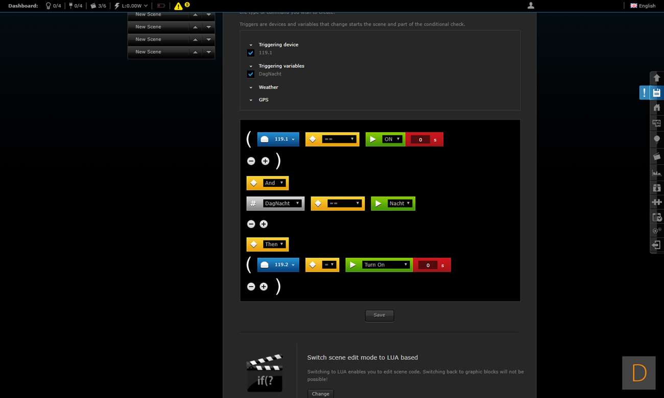 Als voorbeeld wil ik graag dat als ik de eerste lamp (S1) van de double switch 2 aanzet, en het donker genoeg is, dat dan ook de 2de lamp wordt aangezet.