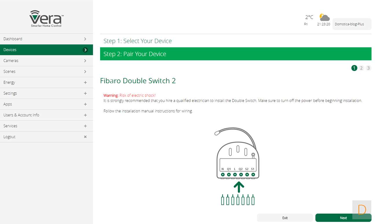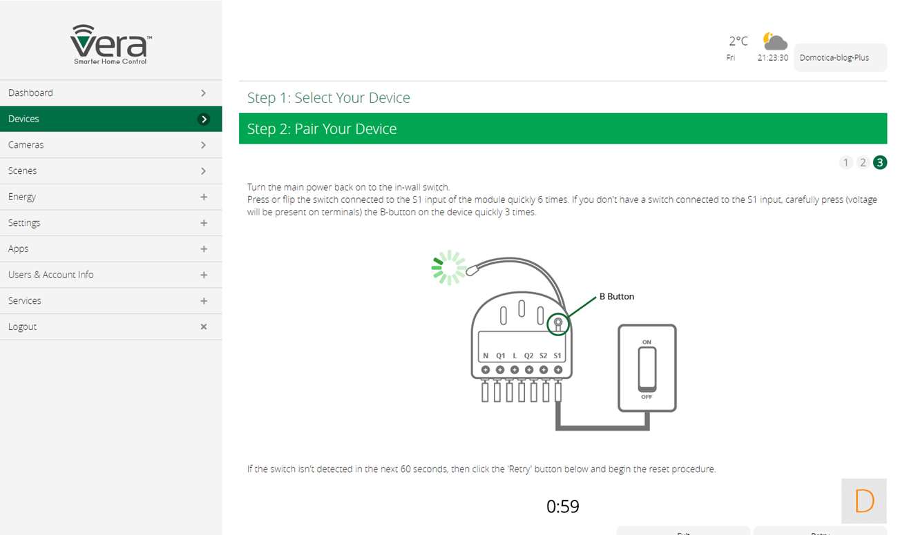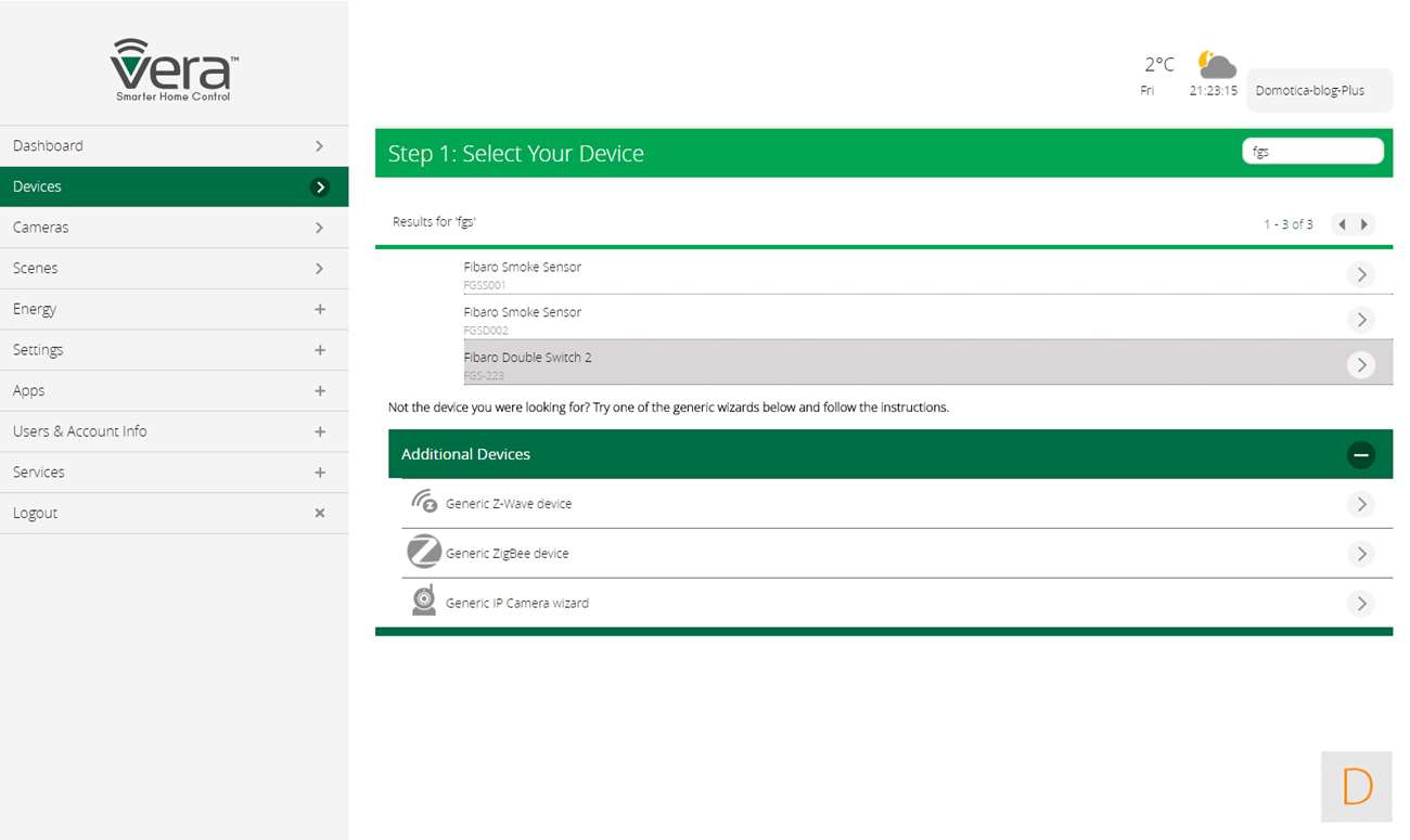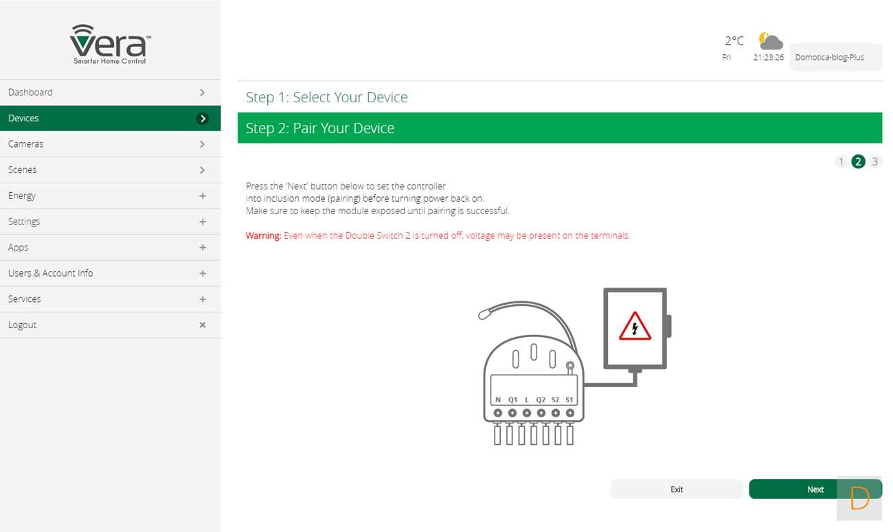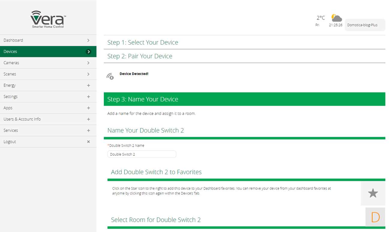 Het toevoegen van de schakelaar kun je starten door in te loggen op de controller en naar het apparaten gedeelte te gaan en vervolgens op "add device" te klikken. Hierna moet je de schakelaar opzoeken, hij werd netjes gevonden in de lijst. Om het toevoegen te starten voorzie je de schakelaar van stroom en druk je 3x op het "B knopje" aan de voorkant of druk je 3x op de wandschakelaar. De schakelaar werd toegevoegd aan de Vera. Het vreemde was dat ik eerst op het dashboard alleen het verbruik zag en dus niet de 2 schakelaars. Nadat ik een refresh had gedaan zag ik wel de 2 schakelaars en het verbruik. Even geduld dus om alles goed te zien.