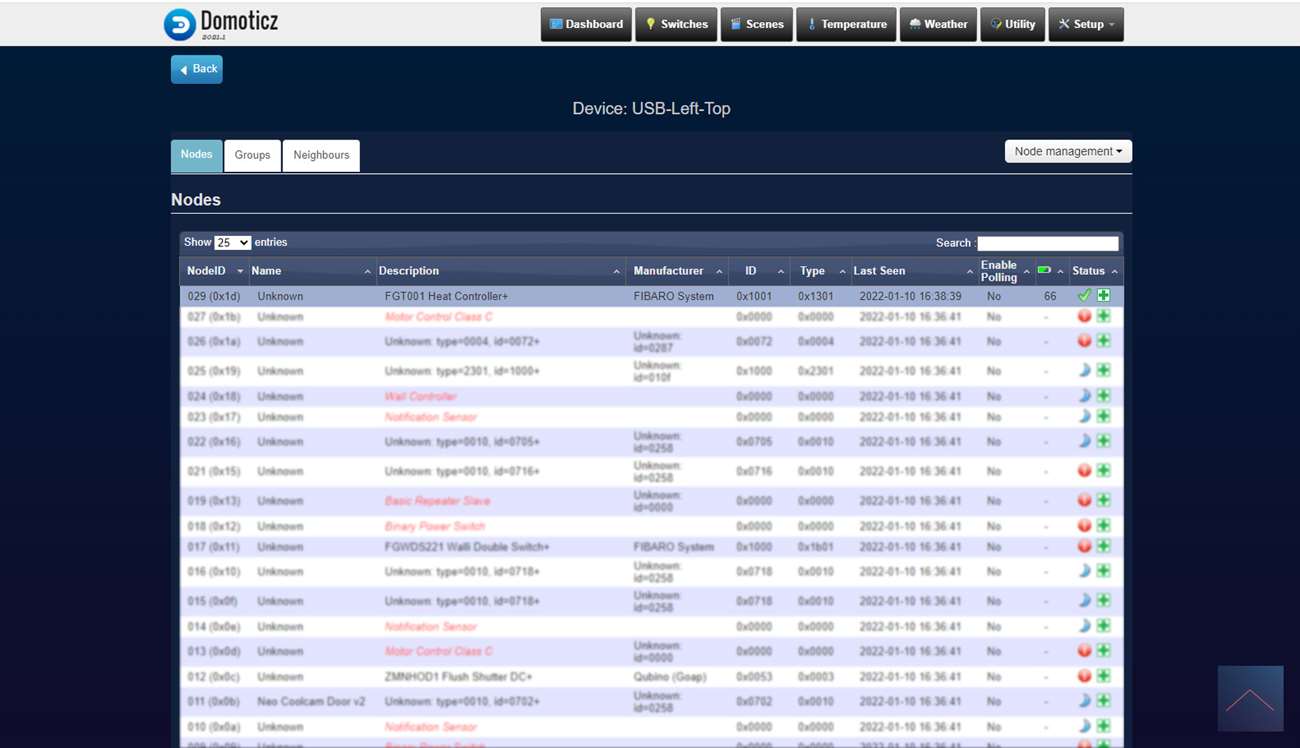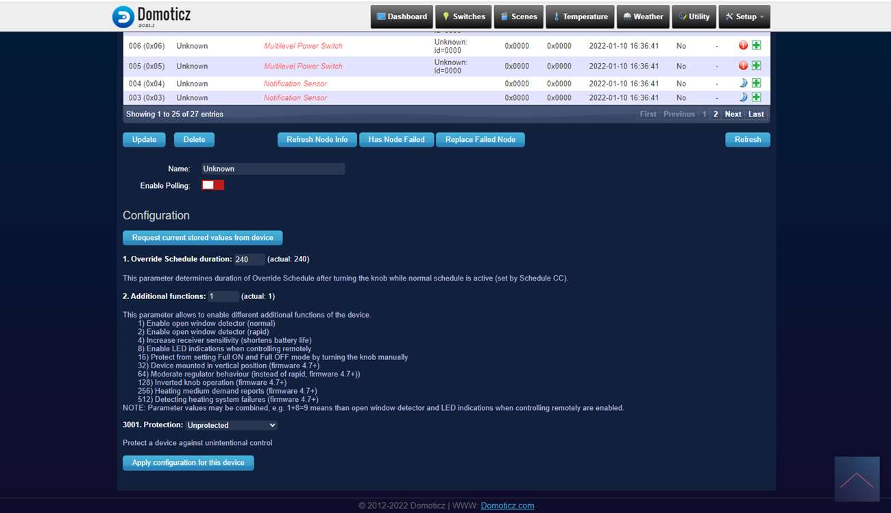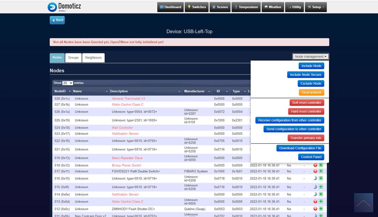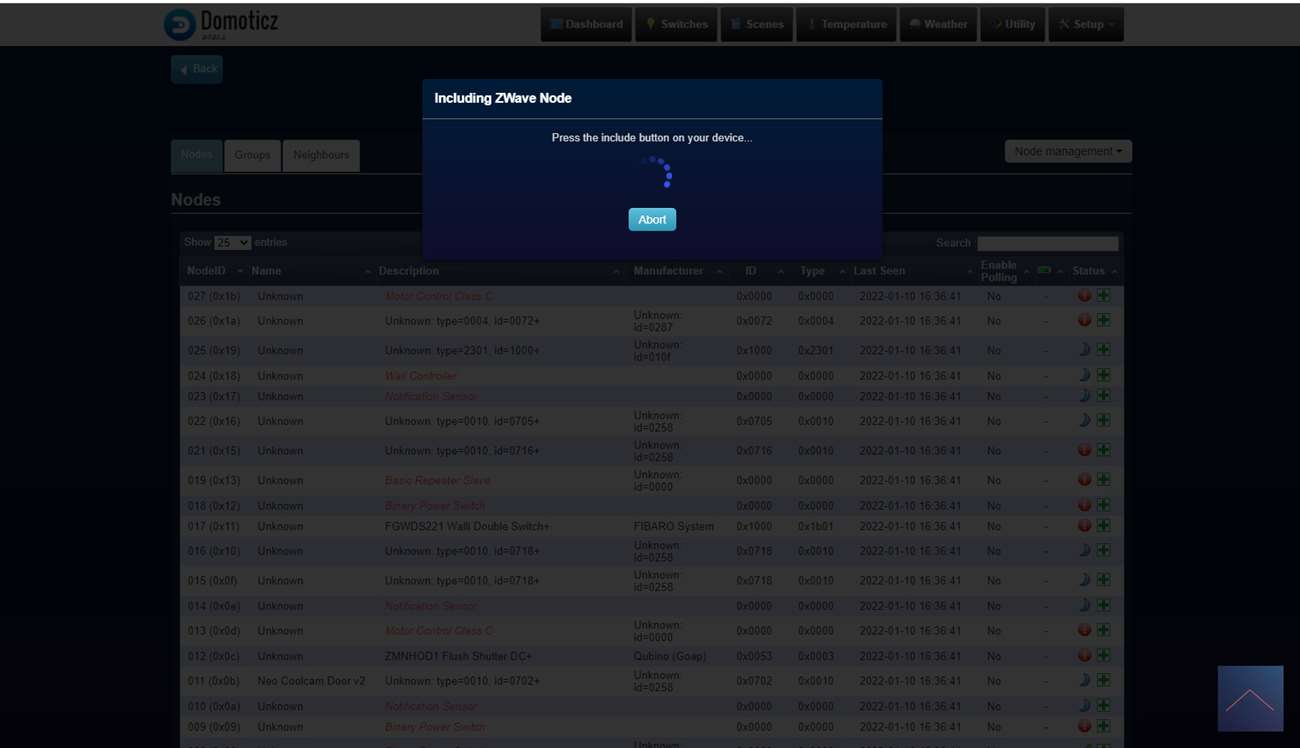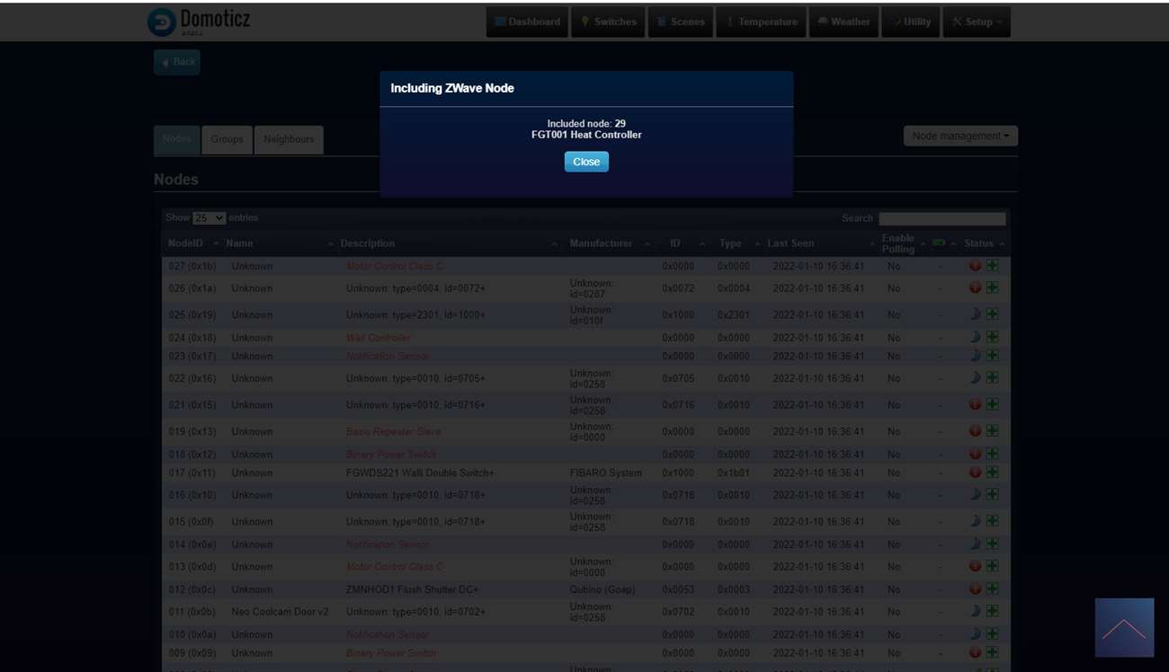 We loggen in op Domoticz en ga naar het menu item "setup" en naar "hardware". Druk hierna op de setup bij de Aeon Labs controller en druk op include node secure. Er zal een pop-up komen dat de controller in leerstand staat. De volgende stap is om het knopje op de kraan 3x achter elkaar in te drukken, de LED wordt eerst wit van kleur en hierna groen om aan te geven dat het koppelen is gelukt.
