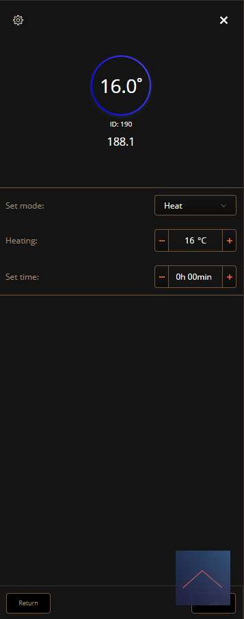 We zien de temperatuur van de sensor, kunnen de temperatuur van de kraan instellen, het modus kunnen we wijzigen (uit, verwarmen en beveiligd) en als klap op de vuurpijl zien we het batterijniveau. Je kunt ook nog instellen hoelang de temperatuur vast moet worden gehouden.