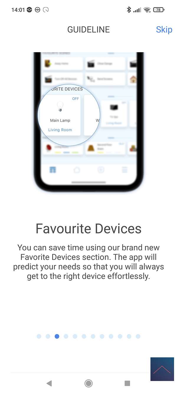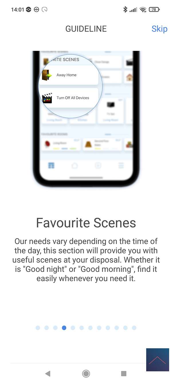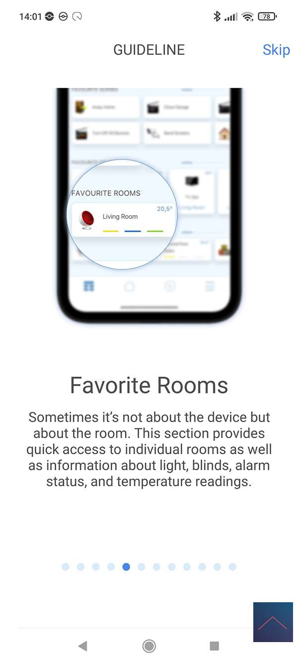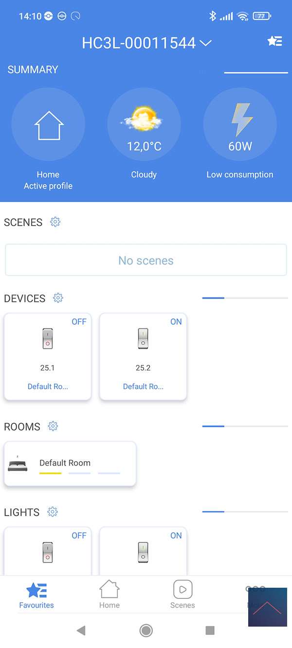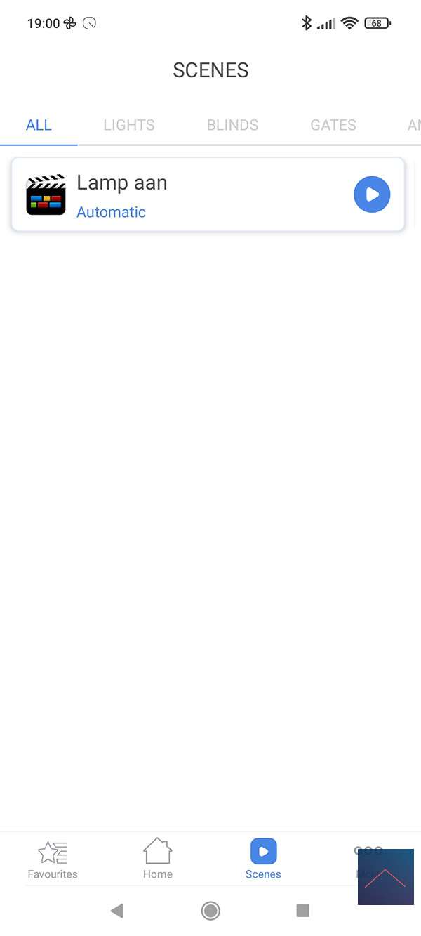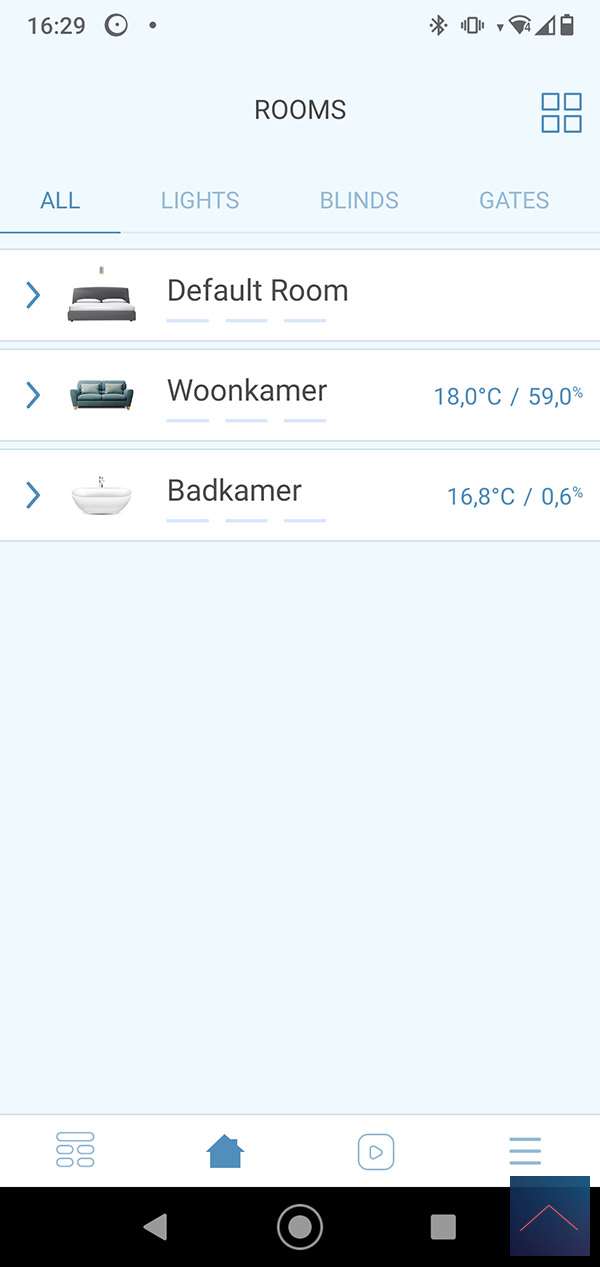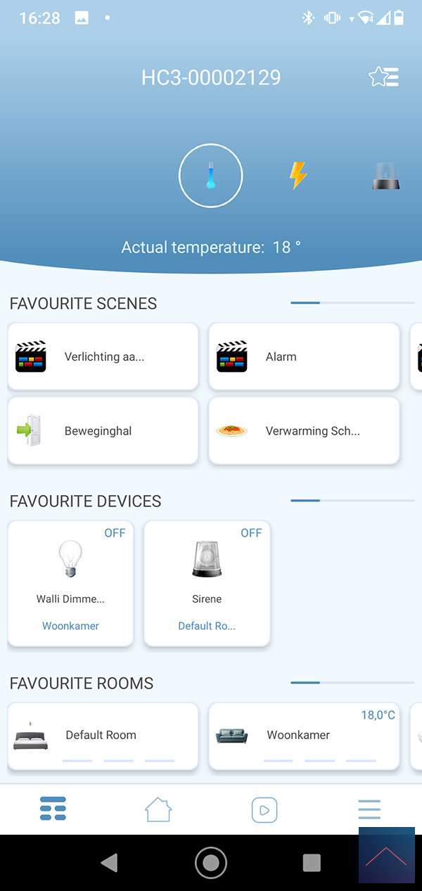 Bovenin het hoofdscherm staan een soort shortcuts naar o.a. je alarm en je profiel wijzigen (thuis, weg, etc). Hieronder kun je direct een scene opstarten, dit is wel super handig. En hier weer onder staan je favorieten apparaten en je kamers.