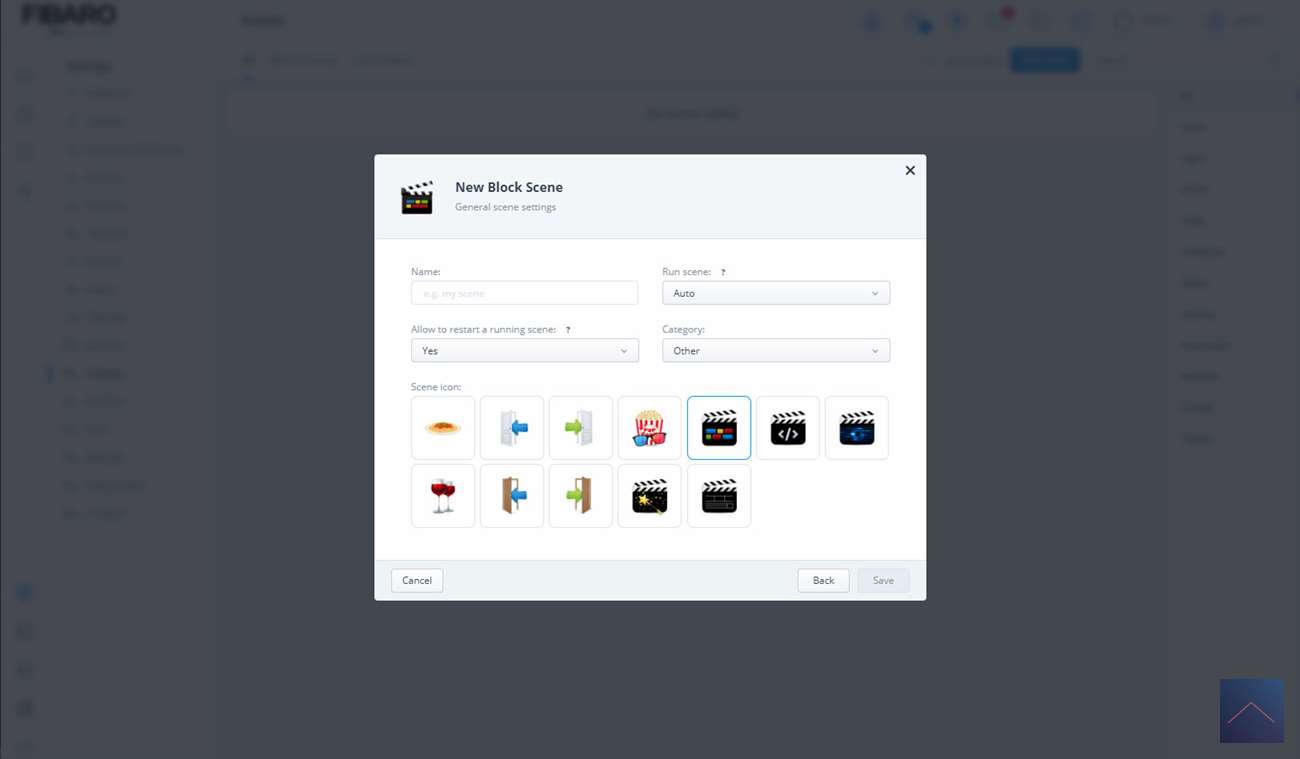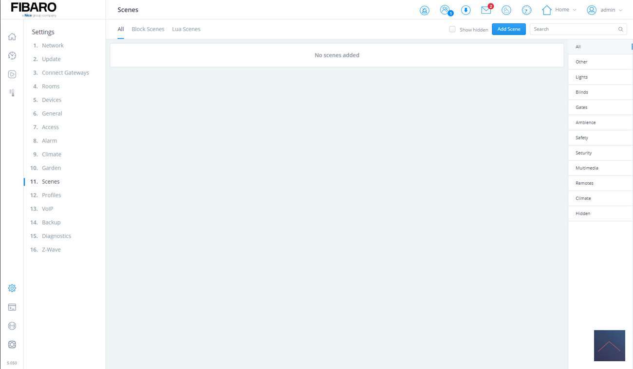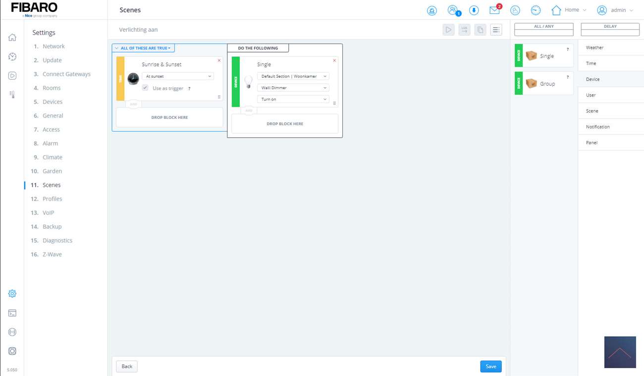We beginnen met een simpel voorbeeld. Hierbij zorgen we dat als de zon onder gaat de verlichting automatisch aangezet wordt. We gaan naar onze instellingen via het radar icoon om via het scenes gedeelte een scene aan te maken. We kiezen hierna voor de block scenes omdat dit een vrij eenvoudige scene gaat worden.