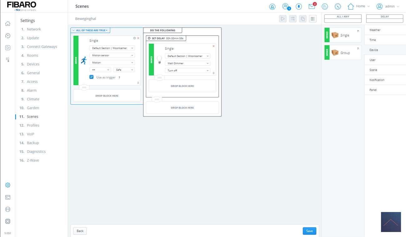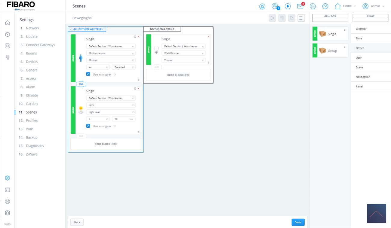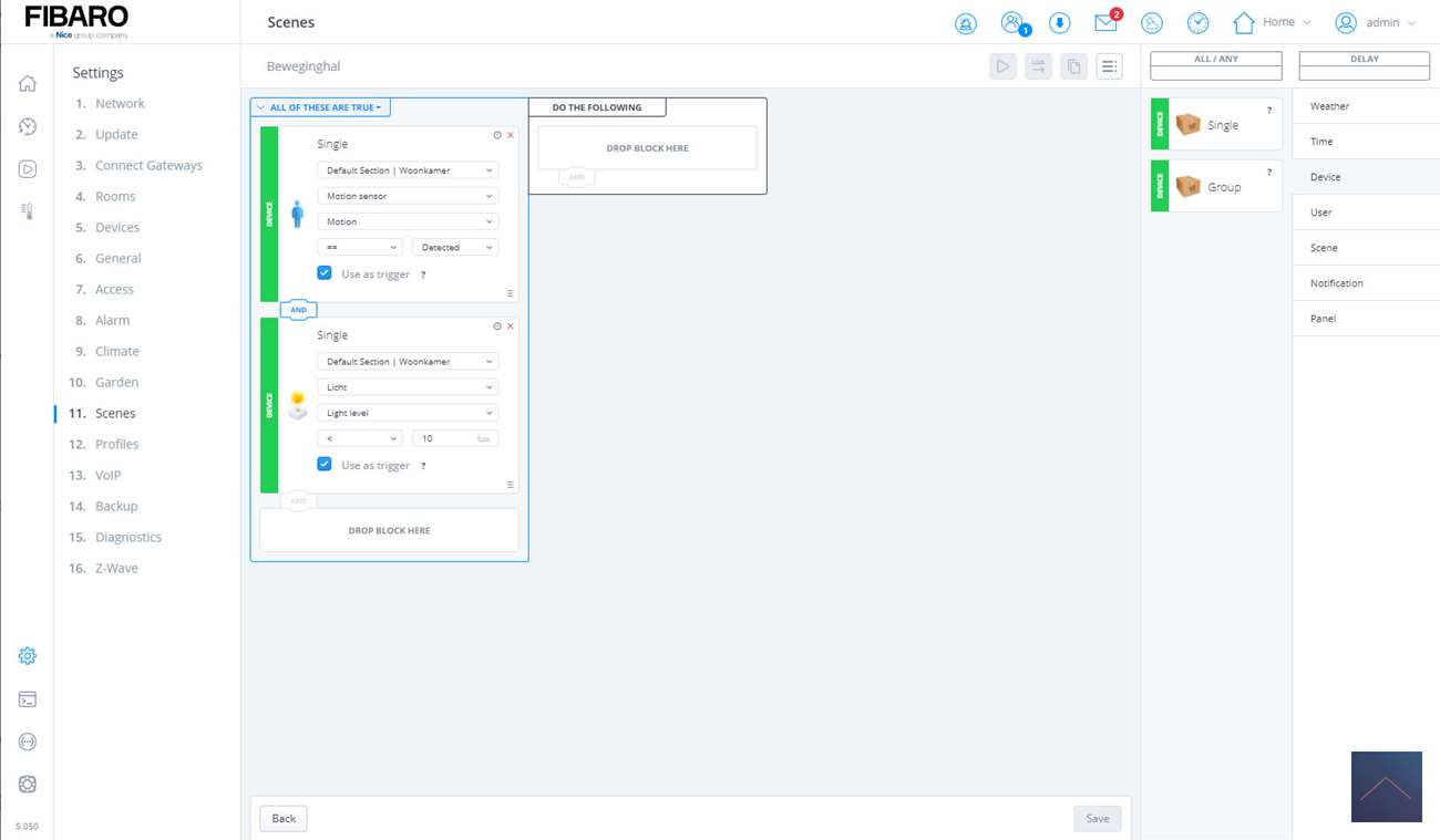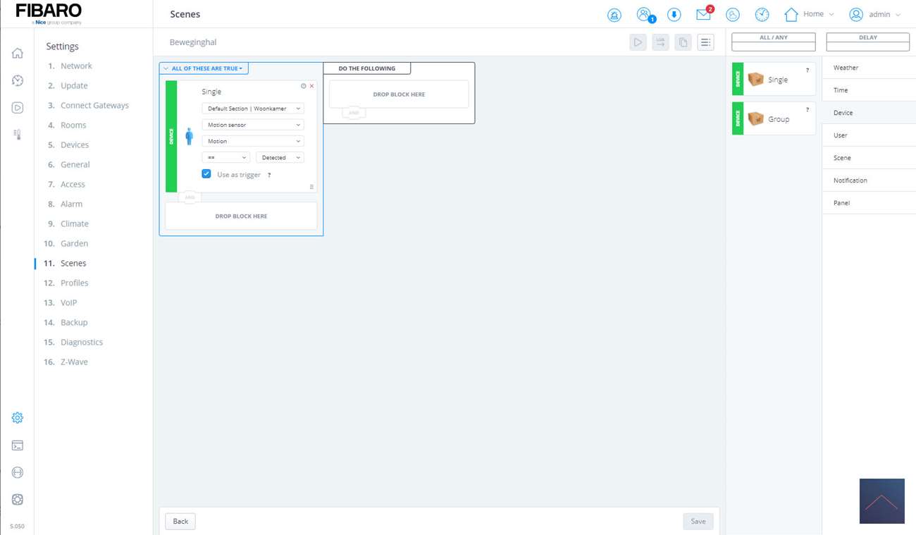 We starten door naar het scene gedeelte te gaan en een nieuwe scene aan te maken. Als trigger gebruiken we de bewegingsmelder. Dus draggen we bij apparaten "single" device in de trigger kolom. Vervolgens selecteren we: de kamer, motionsensor en op welke voorwaarden hij moet starten. In ons geval willen we dat als er beweging is gedetecteerd.