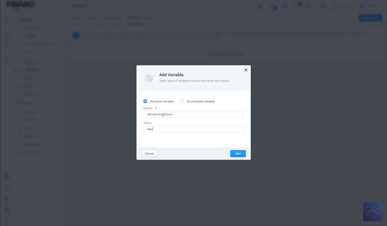 We maken als eerst een variabele aan genaamd "VerwarmingSchuur" en geven deze de waarde "Aan". Dit kun je bij de instellingen doen.