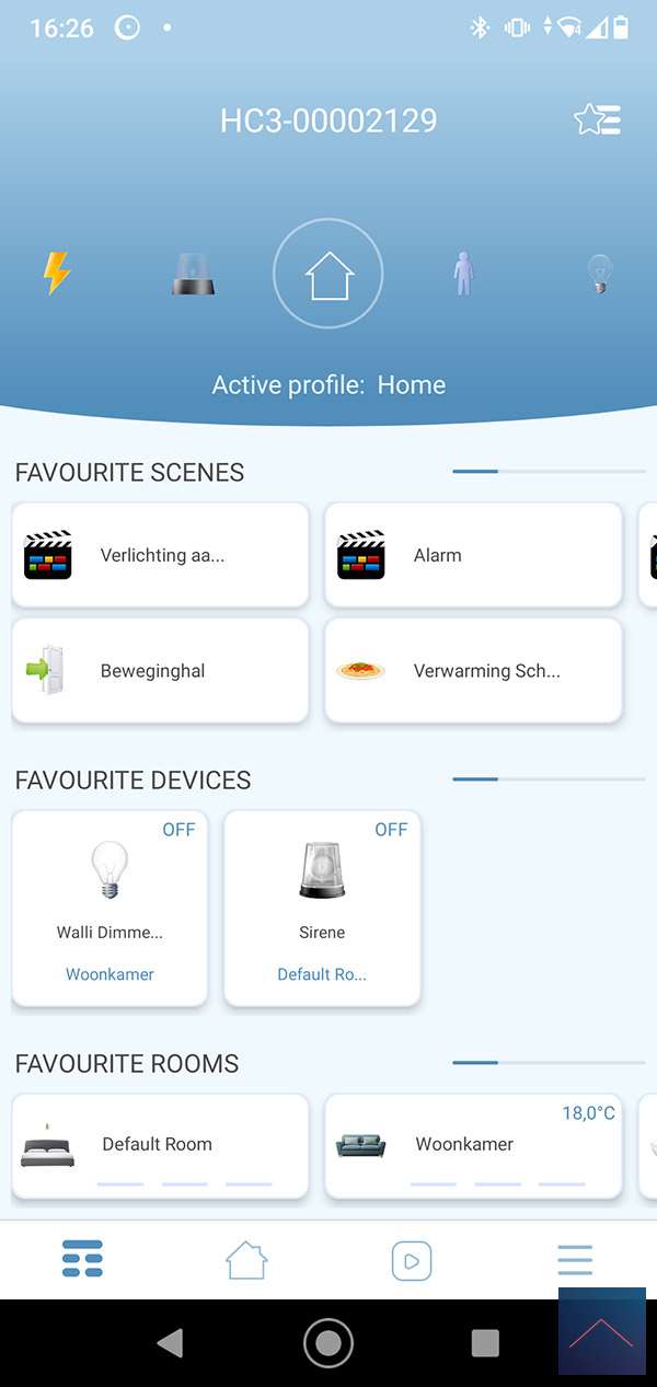 Bovenin het hoofdscherm staan een soort shortcuts naar o.a. je alarm en je profiel wijzigen (thuis, weg, etc). Hieronder kun je direct een scene opstarten, dit is wel super handig. Hier weer onder staan je favorieten apparaten en je kamers.