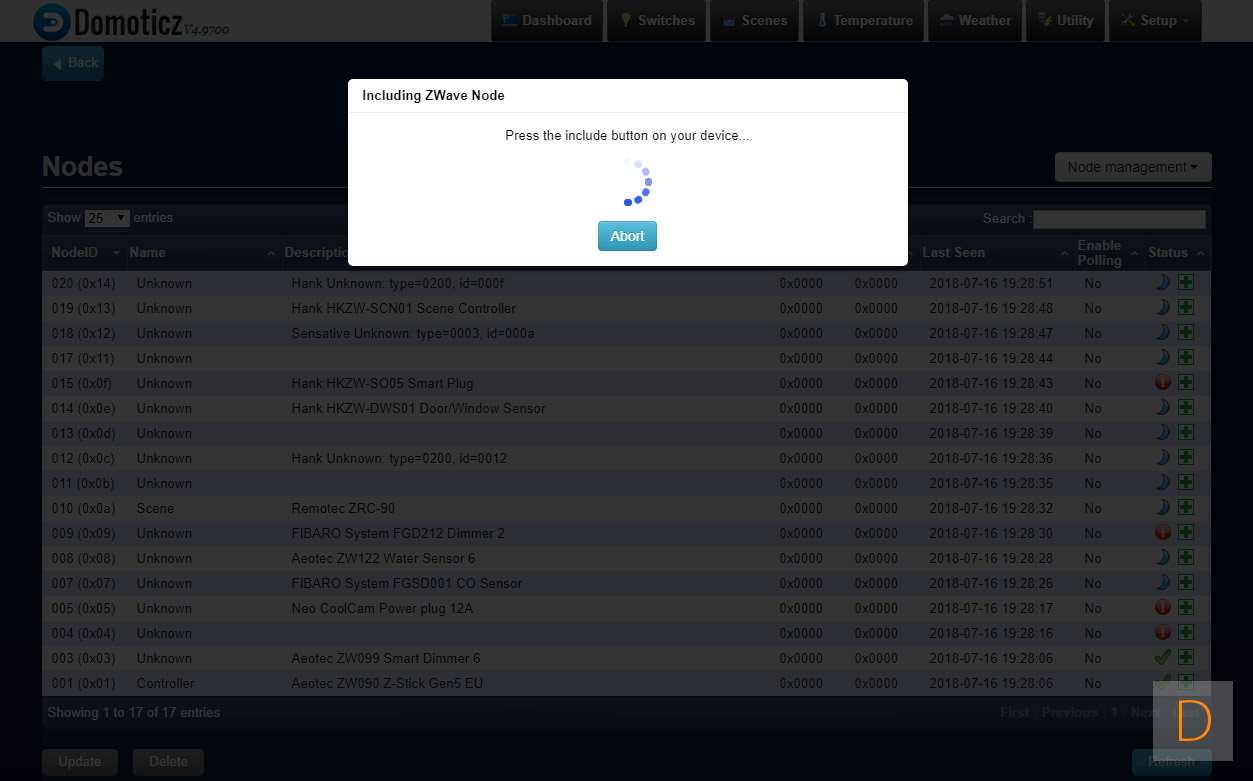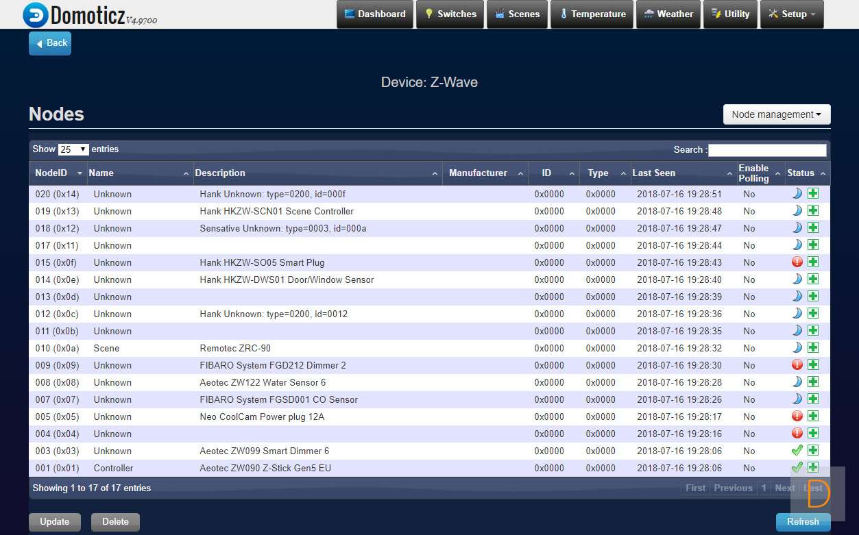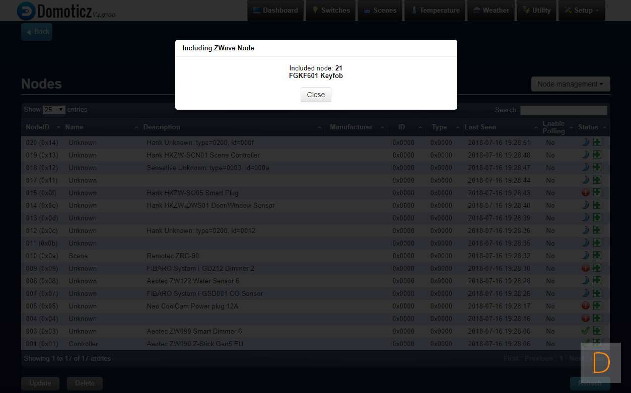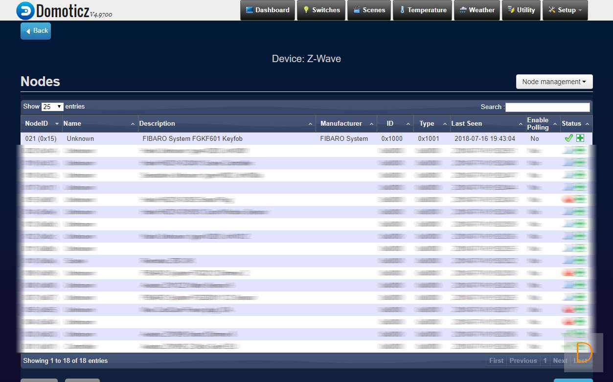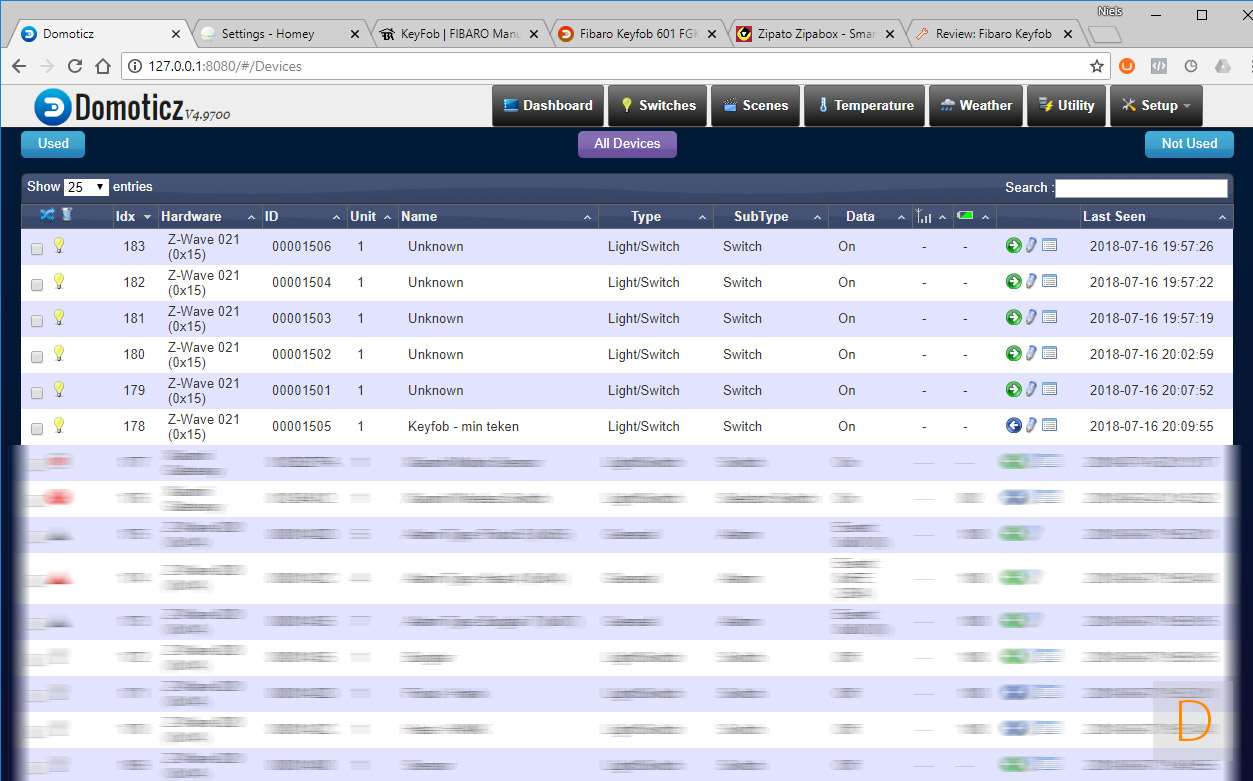 vervolgens klik je op Setup. Aan de rechterkant vind je een menuutje waar je klikt op "include node secure". Om hem beveiligd toe te voegen plaats je de batterij en druk je 3x een willekeurige knop in op de keyfob. De LED zal wit gaan knipperen om aan te geven dat hij toevoegen is gelukt. Hij werd toegevoegd en zie 6 apparaten verschijnen als lichtschakelaar. Niet helemaal zoals het hoort dus.