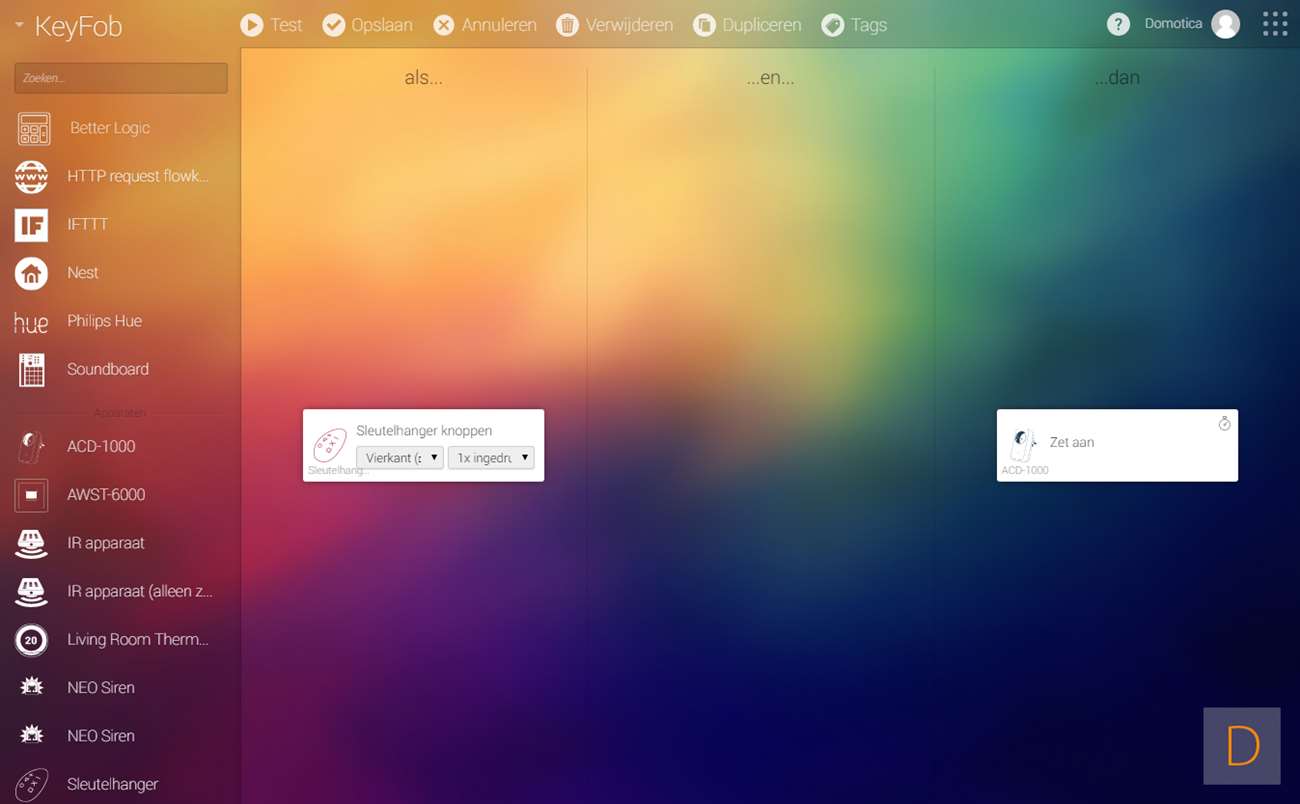 Via de flow editor kun je flows starten via de knoppen van de KeyFob. Ik zie netjes alle knoppen verschijnen en de opties om hem: 1, 2 of 3 in te drukken, hem langer ingedrukt te houden en langer ingedrukt gestopt.