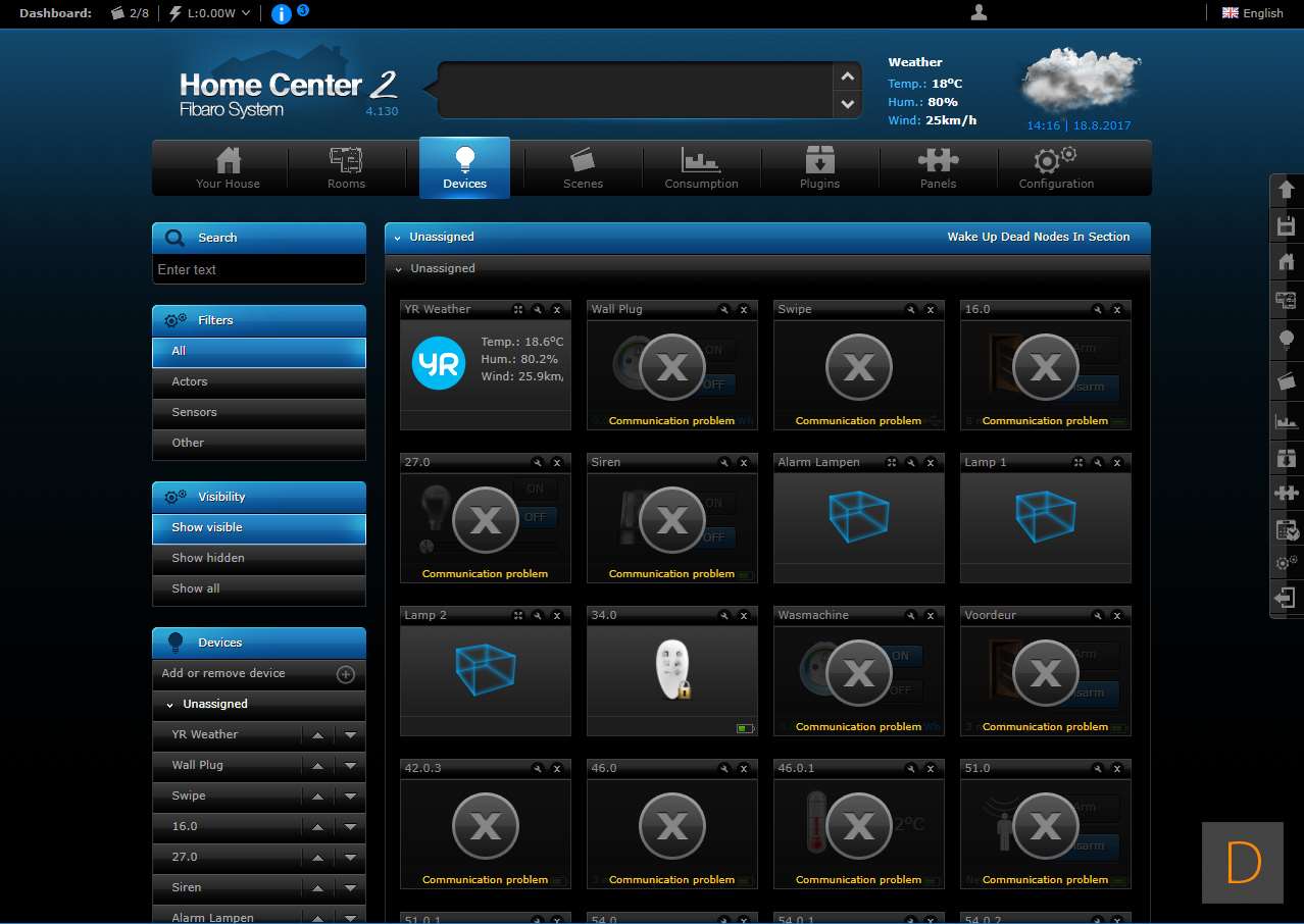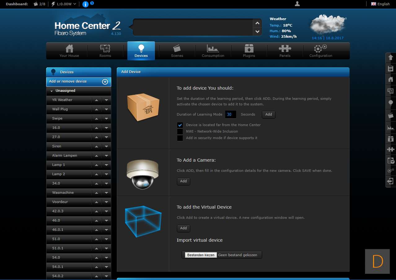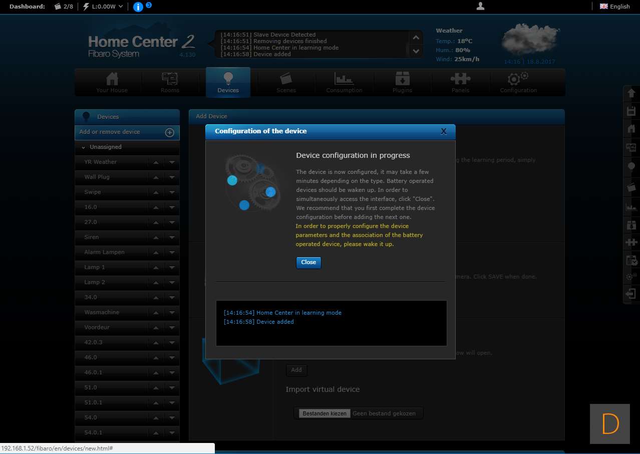 Als 3de controller testen we de HC2 van FIbaro, dit moet natuurlijk ook geen enkel probleem zijn gezien het hun eigen product is.