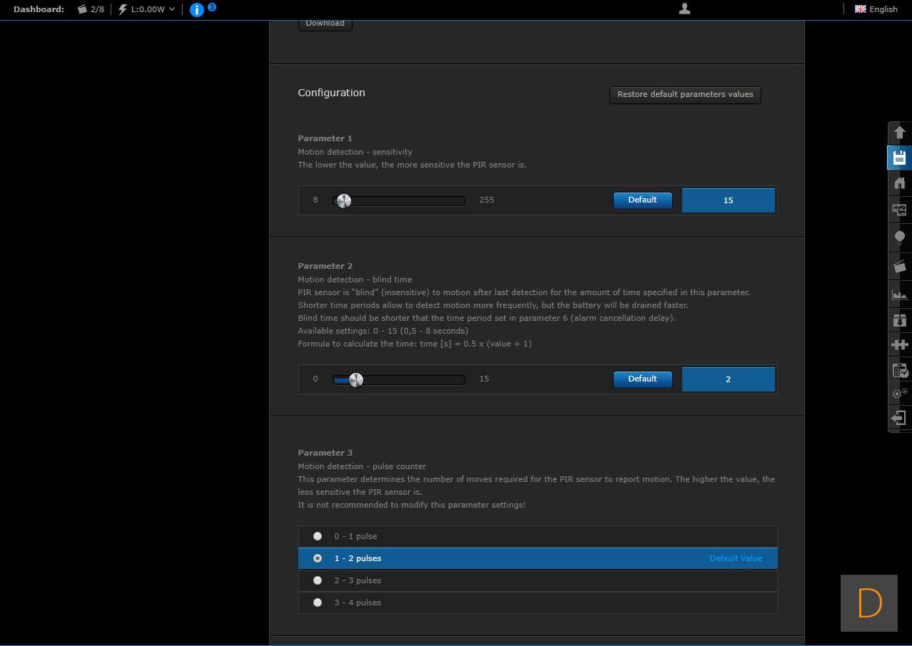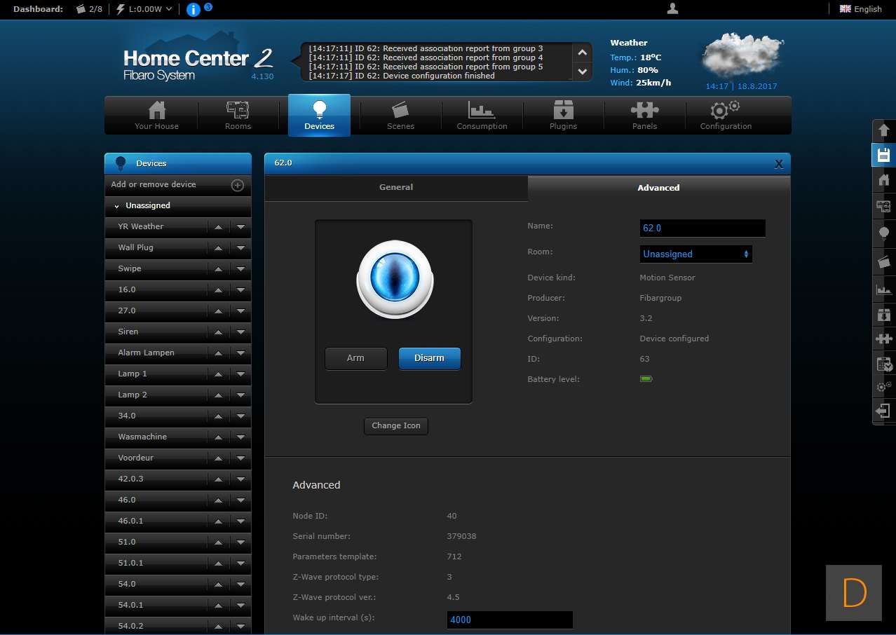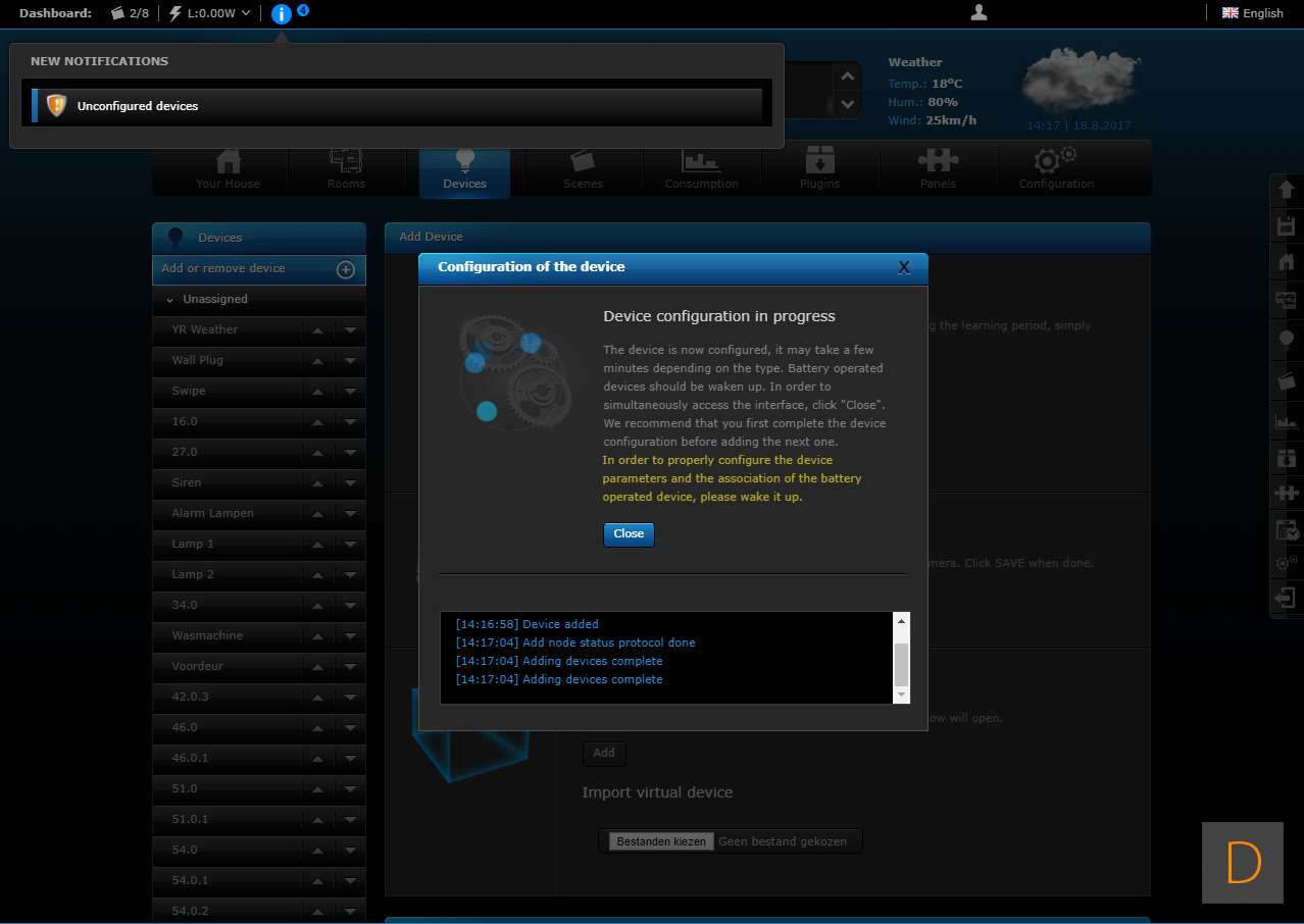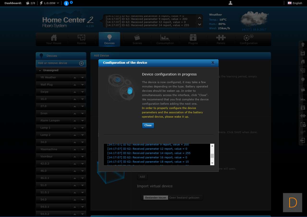 Om het toevoegen te starten log je in op je Home Center. Vervolgens ga je naar het device gedeelte en klik je op "add or remove device" en vervolgens op de "add" knop. Het aftellen zal beginnen. Hierna is het een kwestie van de sensor open te draaien en het lipje bij de batterij te verwijderen. Je kunt het toevoegen starten door 3 keer snel achter elkaar op de (b) knop te drukken. Zorg altijd dat je dicht bij de controller bent als je gaat toevoegen. Hij werd netjes gevonden en toegevoegd aan de HC2. Ik zie ook alle opties en configuratie mogelijkheden.