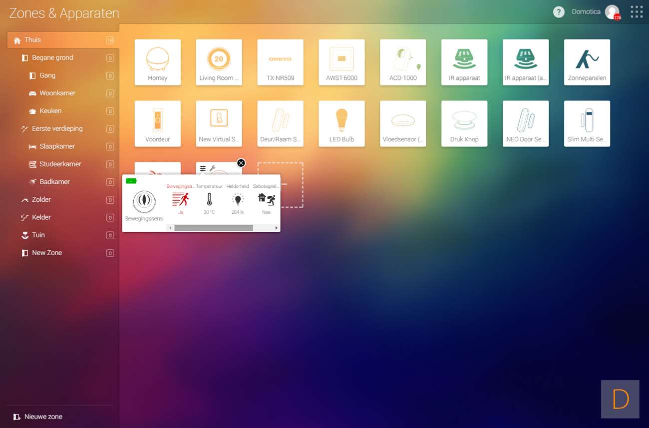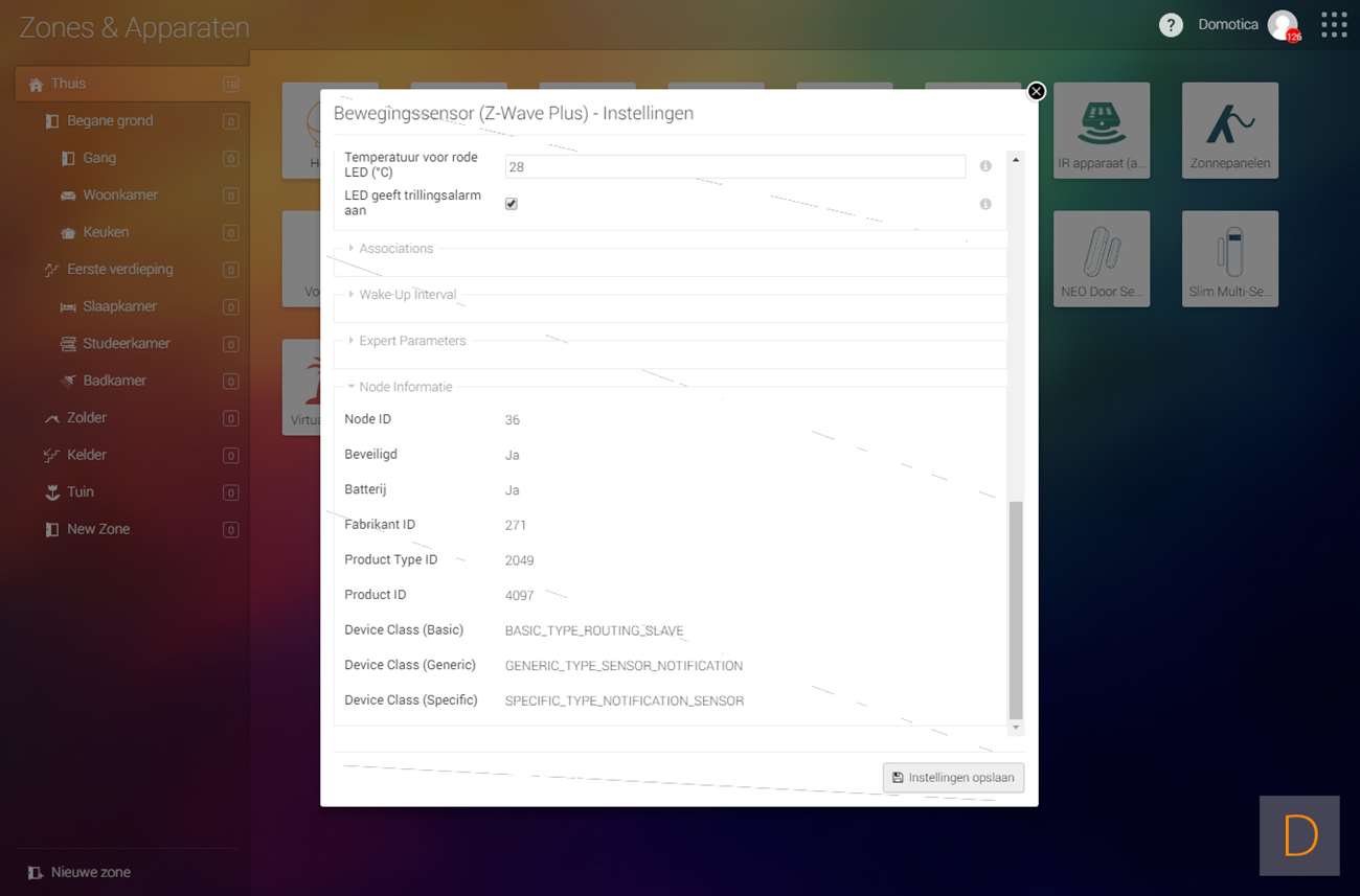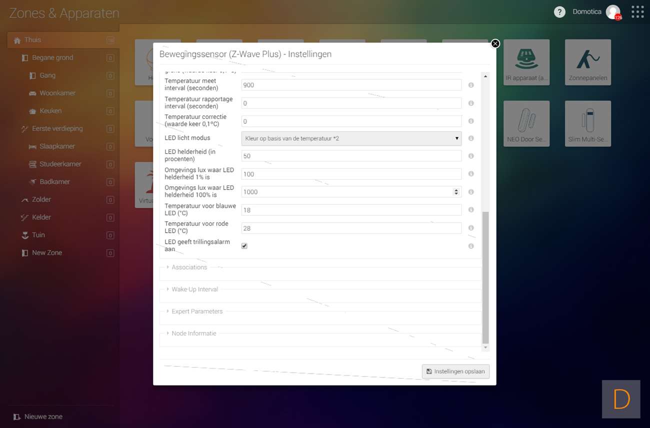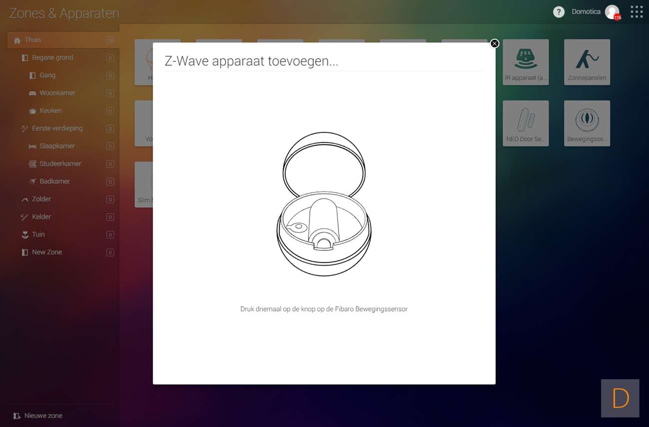 Het installeren van deze motion sensor gaat door eerst naar het apparaten gedeelte te gaan en op het (+) icon te klikken. Vervolgens installeer je de Fibaro APP (mocht je deze nog niet hebben) en zoek je de sensor op. Hierna maak je de sensor open. Dit kun je doen door hem open te draaien. Vervolgens verwijder je het lipje bij de batterij en druk je 3x op het toevoegen, knopje welke boven de batterij zit. Hij zal blauw oplichten. Als het toevoegen is gelukt zal hij bij je apparaten verschijnen. Het kan even duren tot de licht-, temperatuur- en batterij waardes zichtbaar worden.