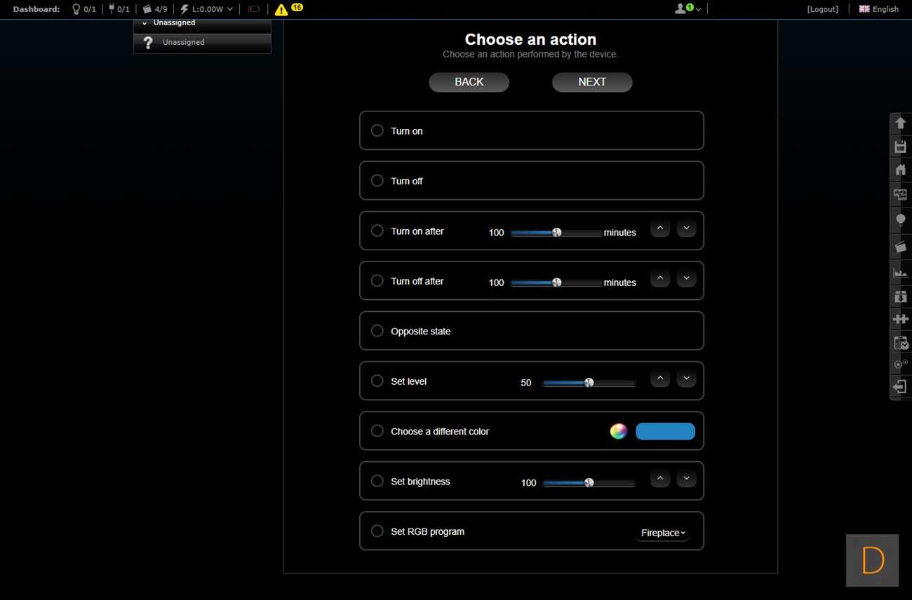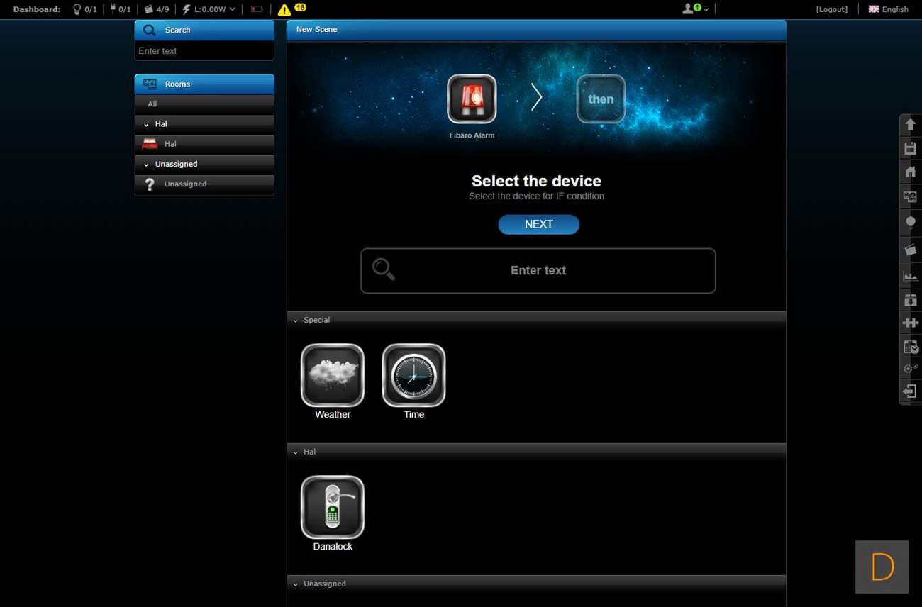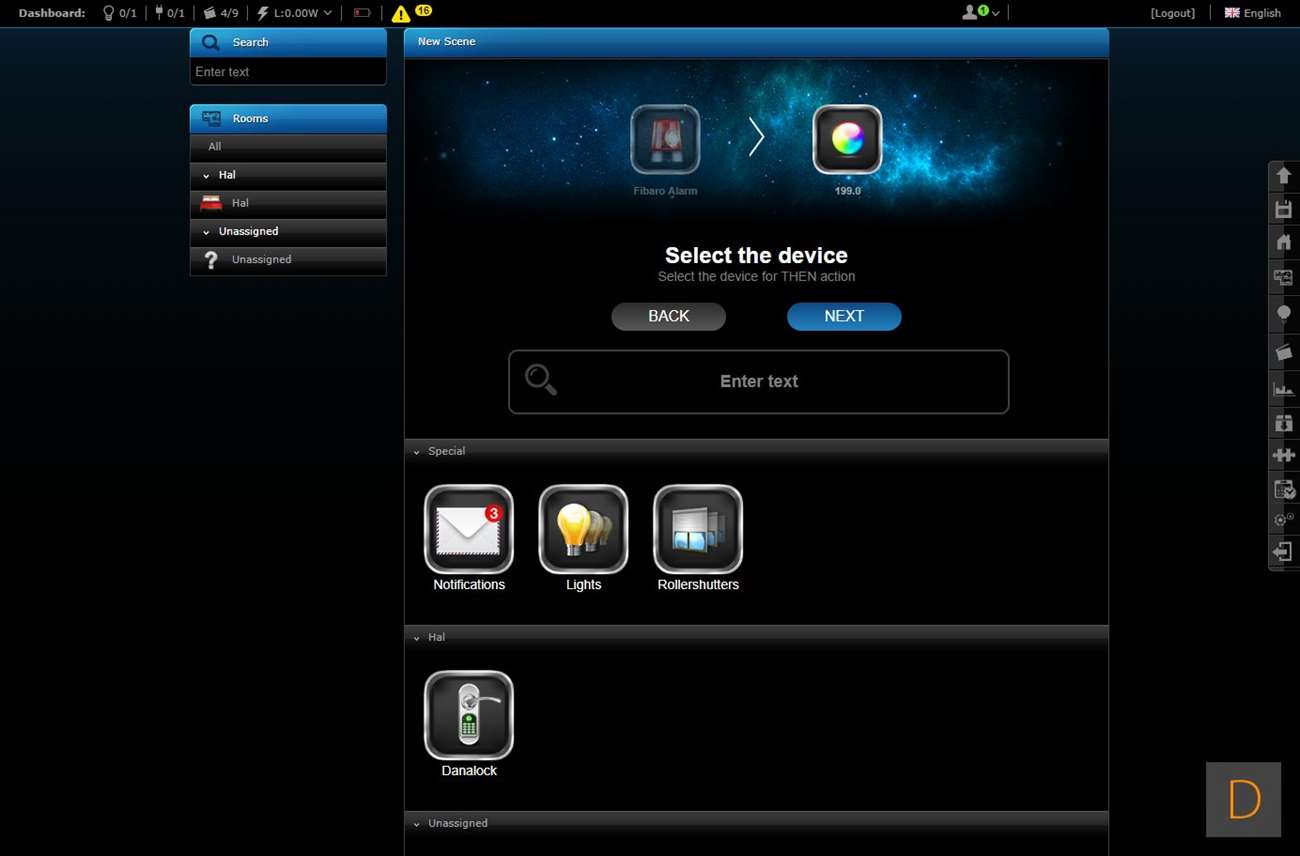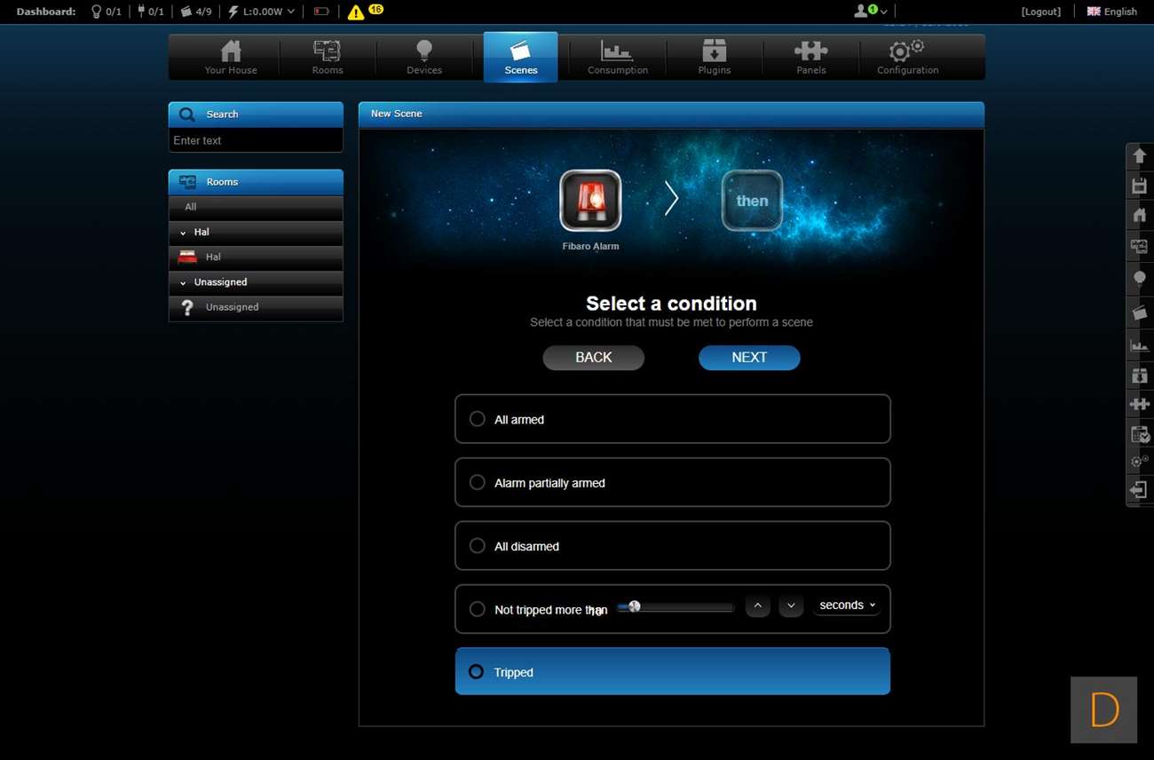 Als het alarm afgaat willen we de inbreker natuurlijk een mooie lichtshow geven. We gebruiken hiervoor het alarm als uitgangspunt en het programma van de RGBW om de lichteffecten te geven. Deze keer gebruiken we de magic scene optie (zoals je kun lezen in deze review).