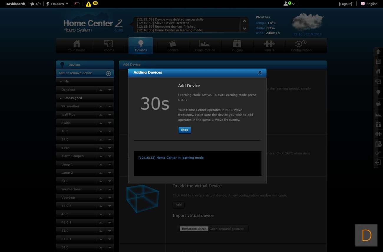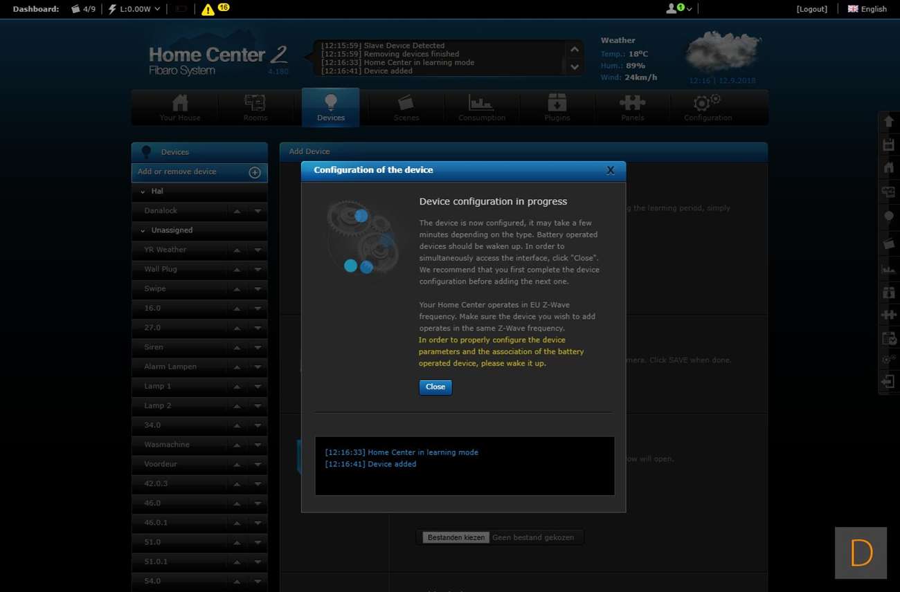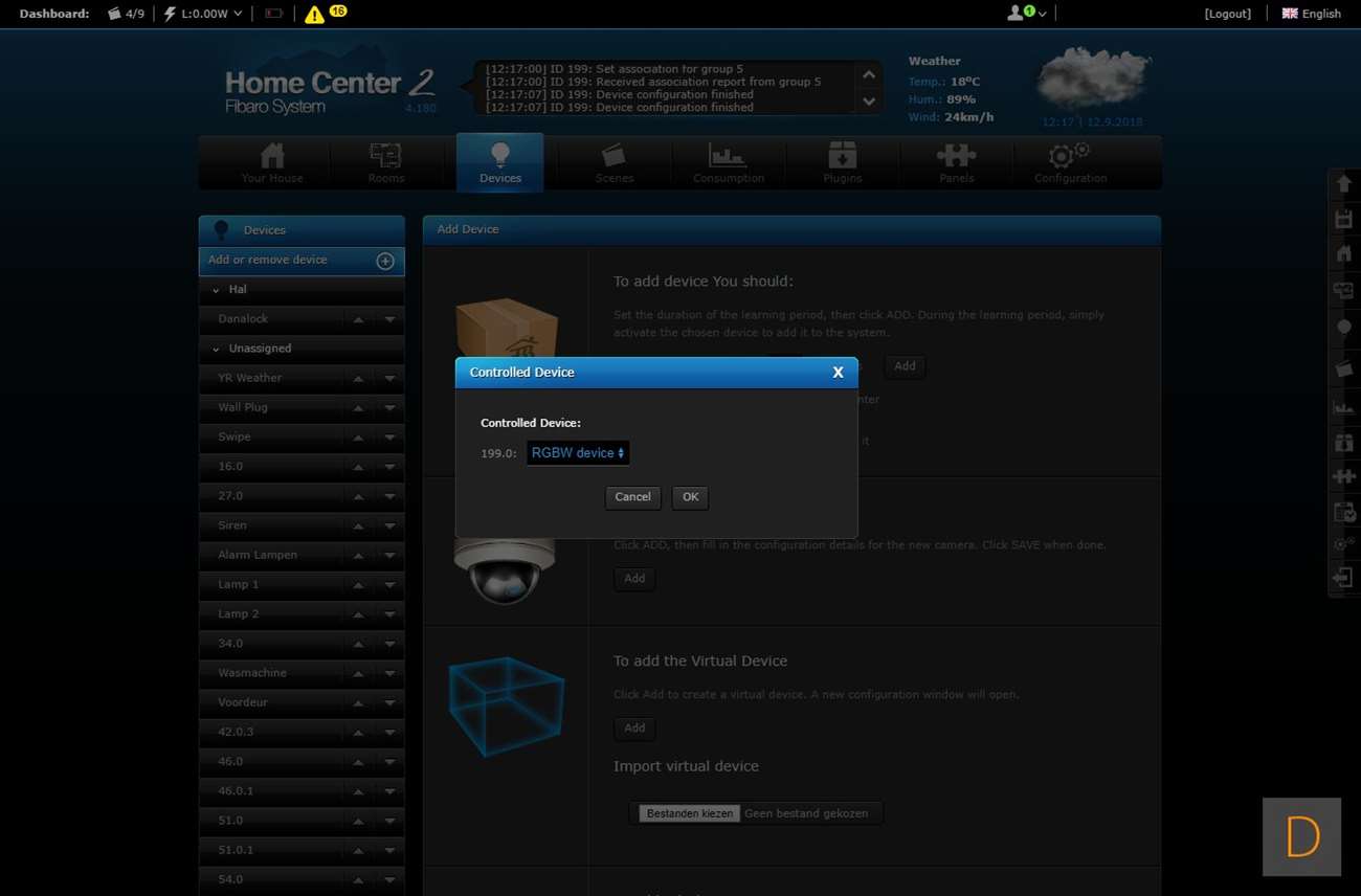 Dit product is van Fibaro, dus het toevoegen zou geen enkel probleem moeten zijn. We gaan zien of dit ook het geval is. Je kunt het toevoegen starten door in te loggen op de HC2 en vervolgens te gaan naar je apparaten. Hierna druk je op "add or remove devices" en vinkje "Add in security mode if device supports it" aan. Om het toevoegen echt te starten druk je op "Add" en voorzie je de RGBW van stroom. Hij zal vrijwel direct gevonden worden. Mocht dit niet het geval zijn dan druk je 3x op het "B" knopje aan de voorkant. Als het toevoegen is gelukt zullen de LED's groen oplichten.
