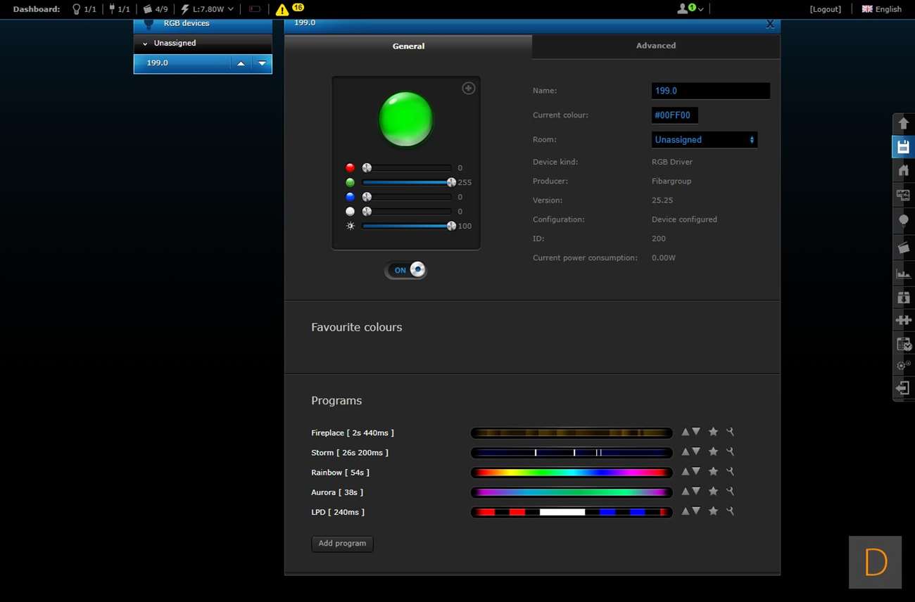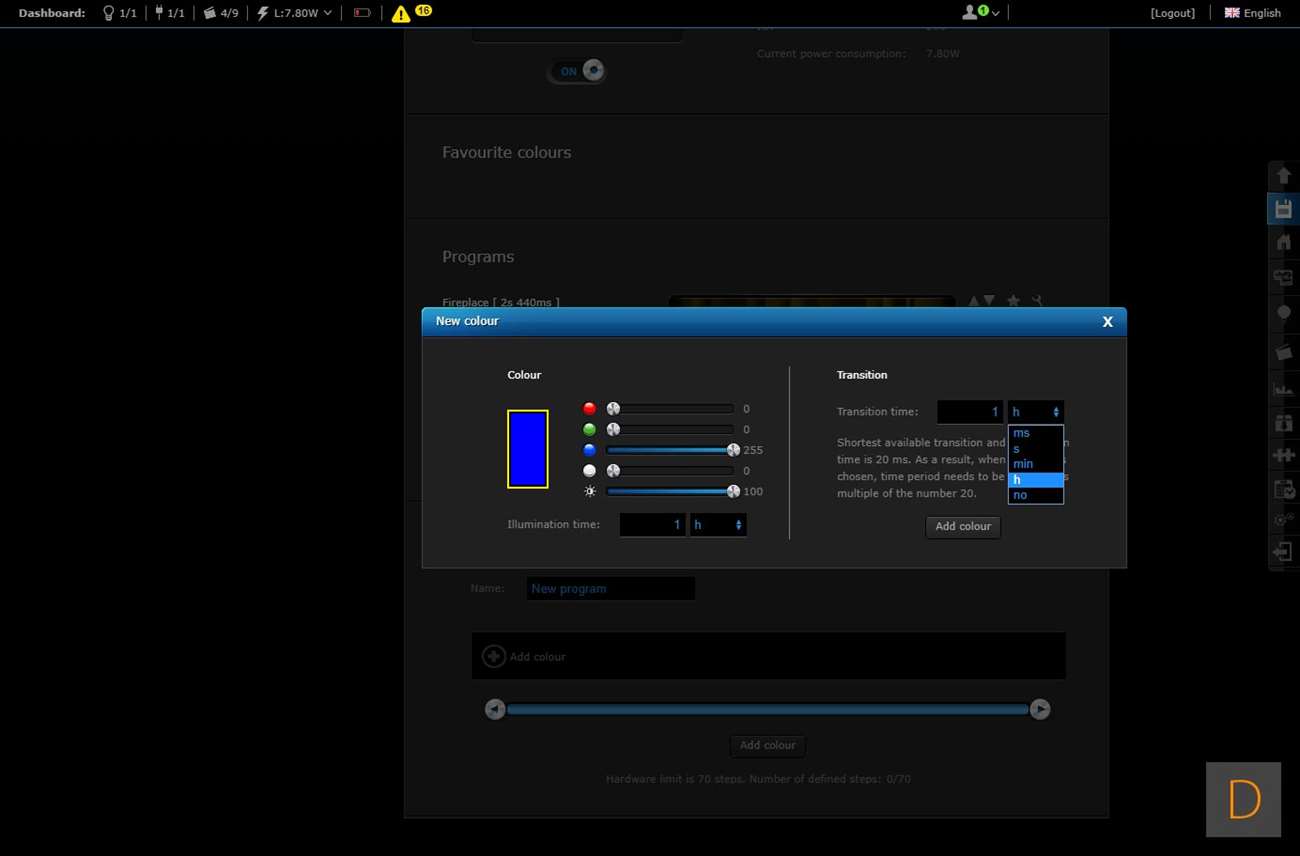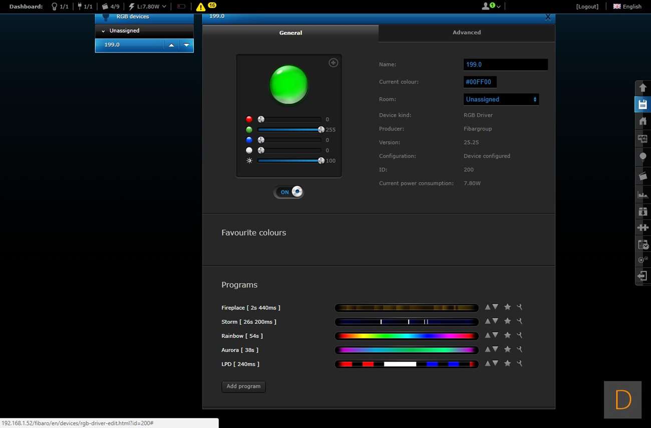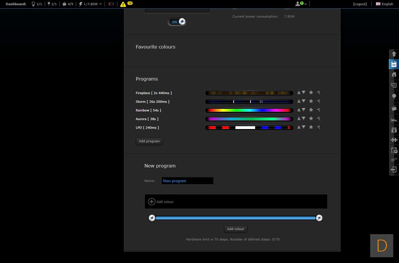 Hij werd inderdaad goed toevoegt en ik zie alle opties: De kleuren, totaal verbruik en huidig verbruik. Leuk bij de HC2 is dat je programma's kan maken. Dit zijn vooraf gemaakte kleurenwisselingen. Zo kun je een fade effect doen of een politieauto na doen. Handig dus als je de boel wil laten oplichten.