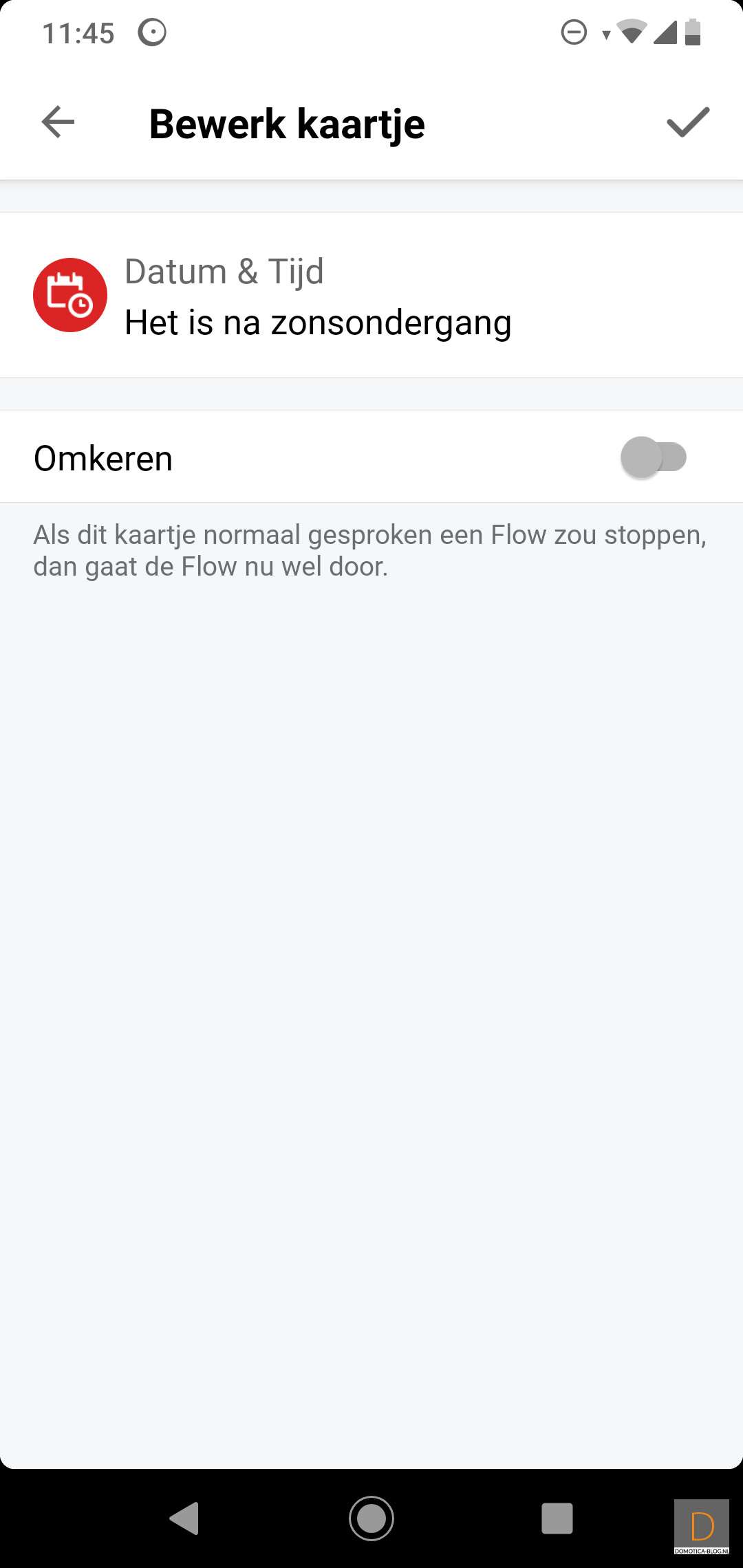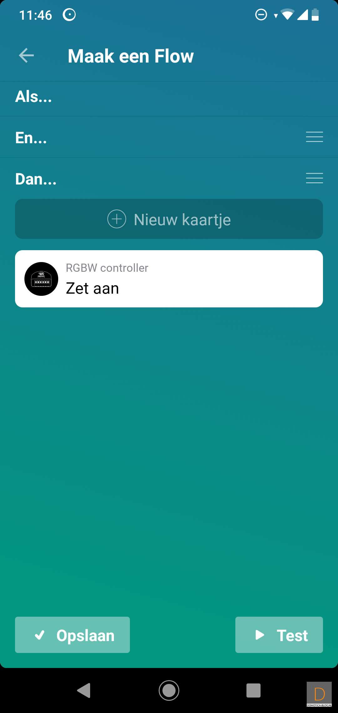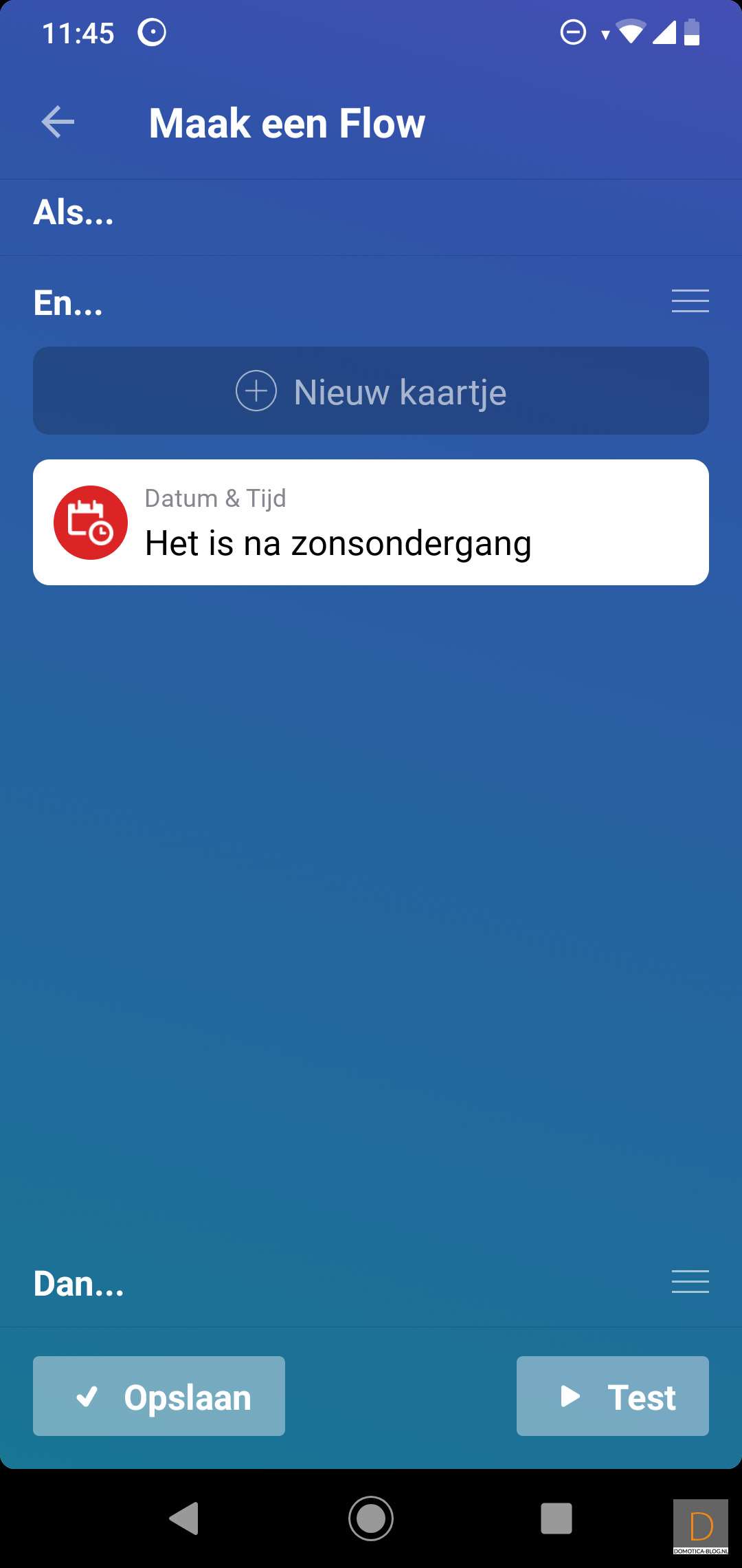Ik wil graag dat bij het openen van de deur, en als de zon onder is, dat dan de RGBW aangezet wordt. We nemen hiervoor als startpunt de deursensor en gebruiken de tijdskaart voor de zonsondergang. Als laatste zorgen we dat de RGBW controller wordt aangezet.