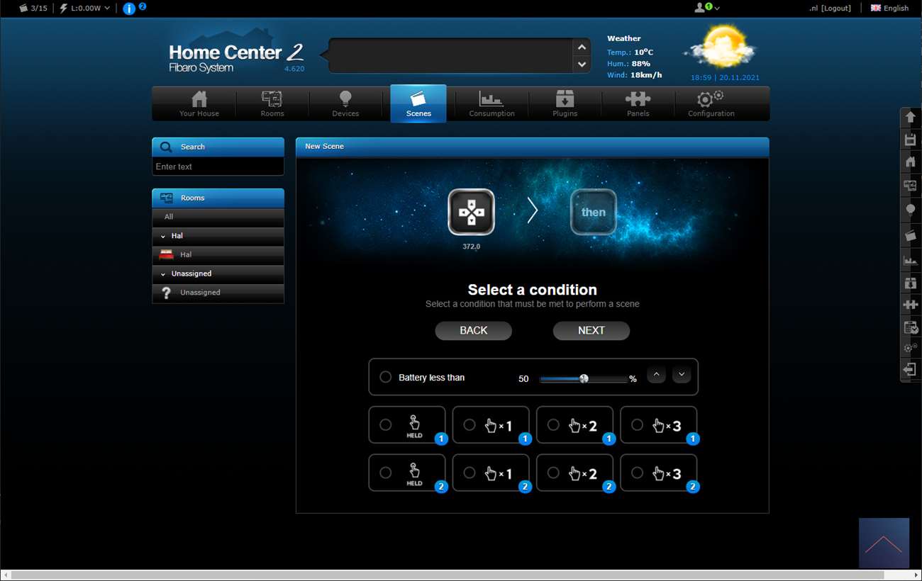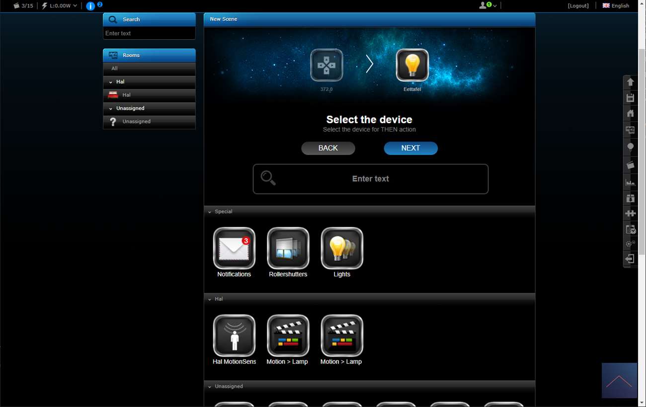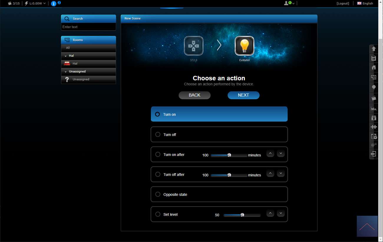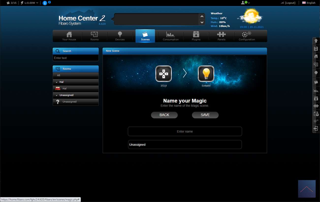 We gaan voor deze laatste variant en we gebruiken hiervoor de magic scenes. Als trigger gebruiken we de 1x drukken en zetten hierna de lamp aan.