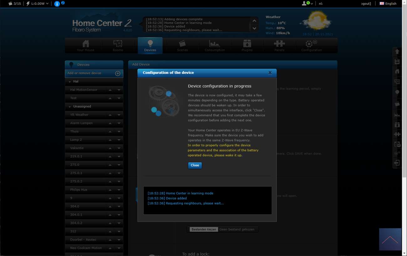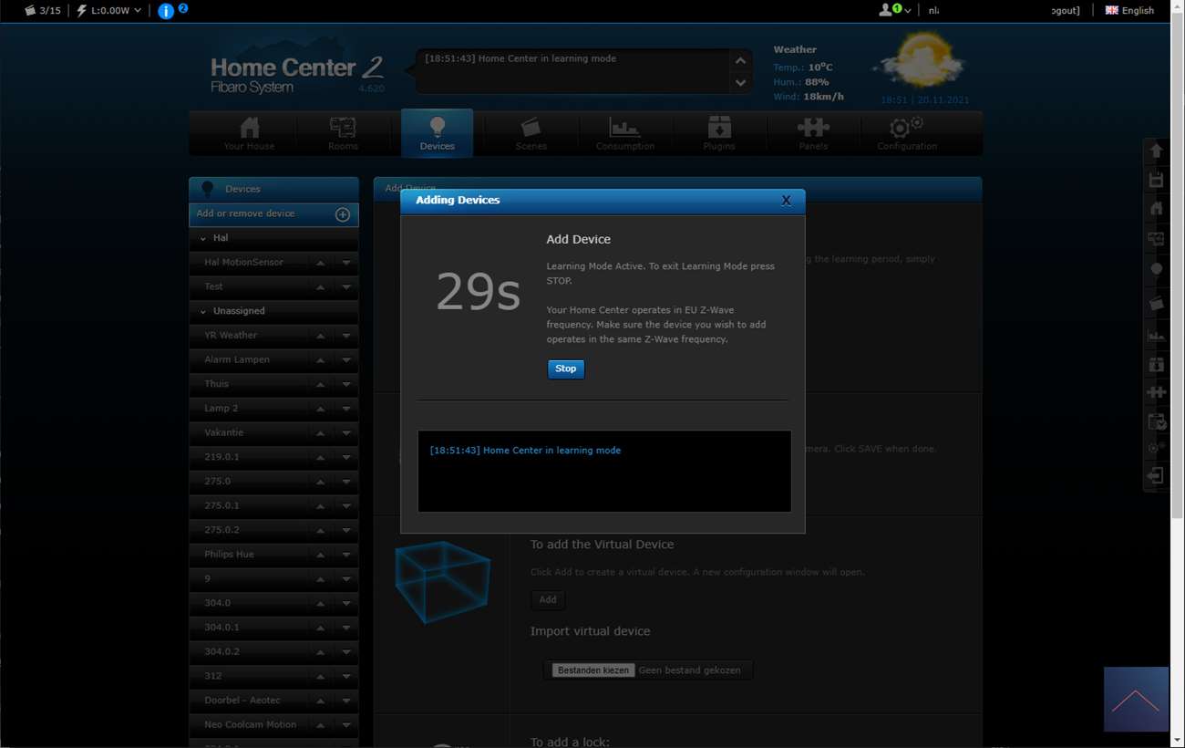 Nu plaatsten we knop weer terug en loggen in op de HC2 en gaan naar onze apparaten. Nu klikken we op "add new device" en hierna op "add". Nu moeten we de 3x snel achter elkaar de knop van de controller indrukken om het toevoegen te activeren. Hij wordt hierna vrij snel gevonden en zie de LED geel knipperen.