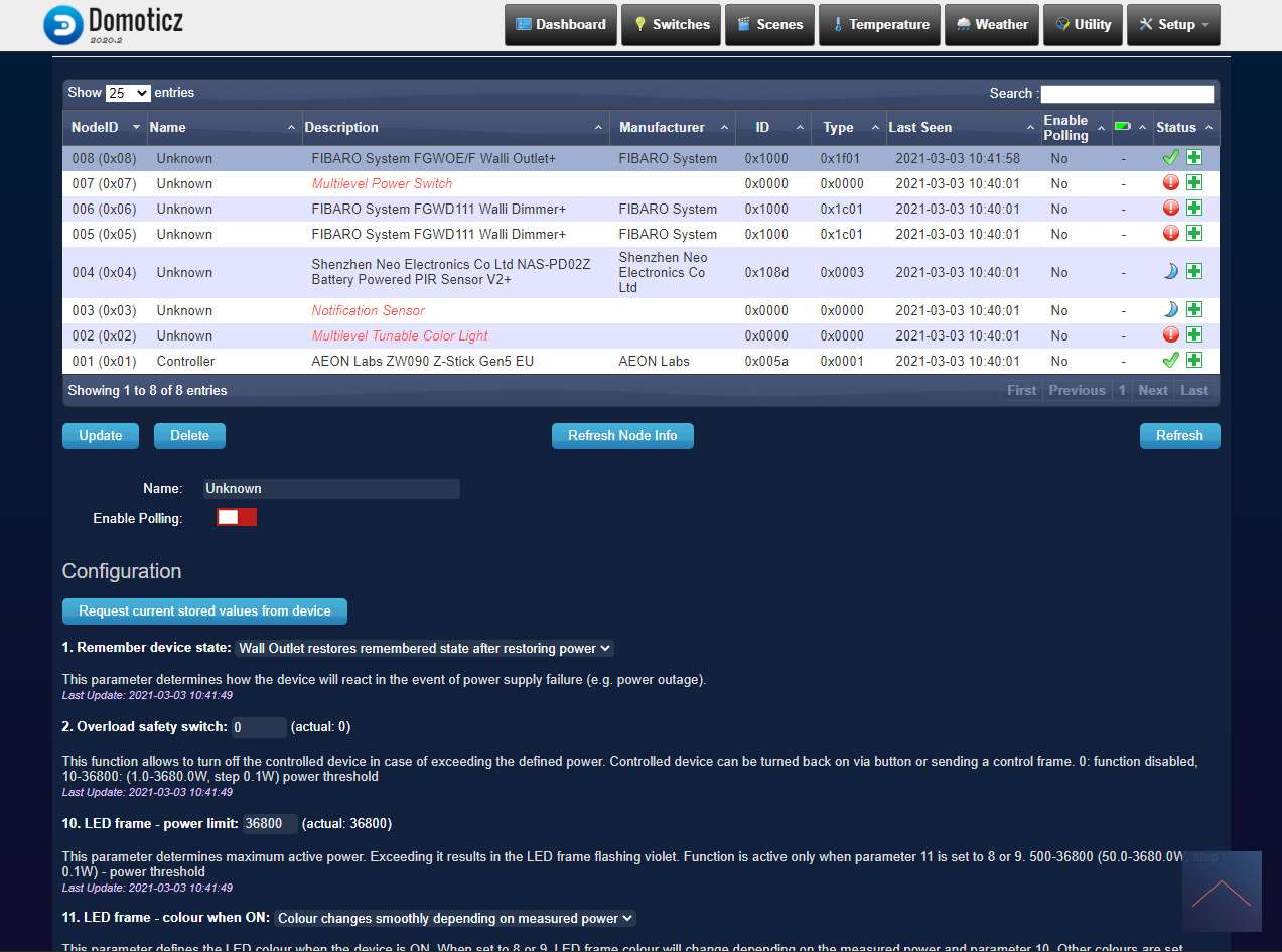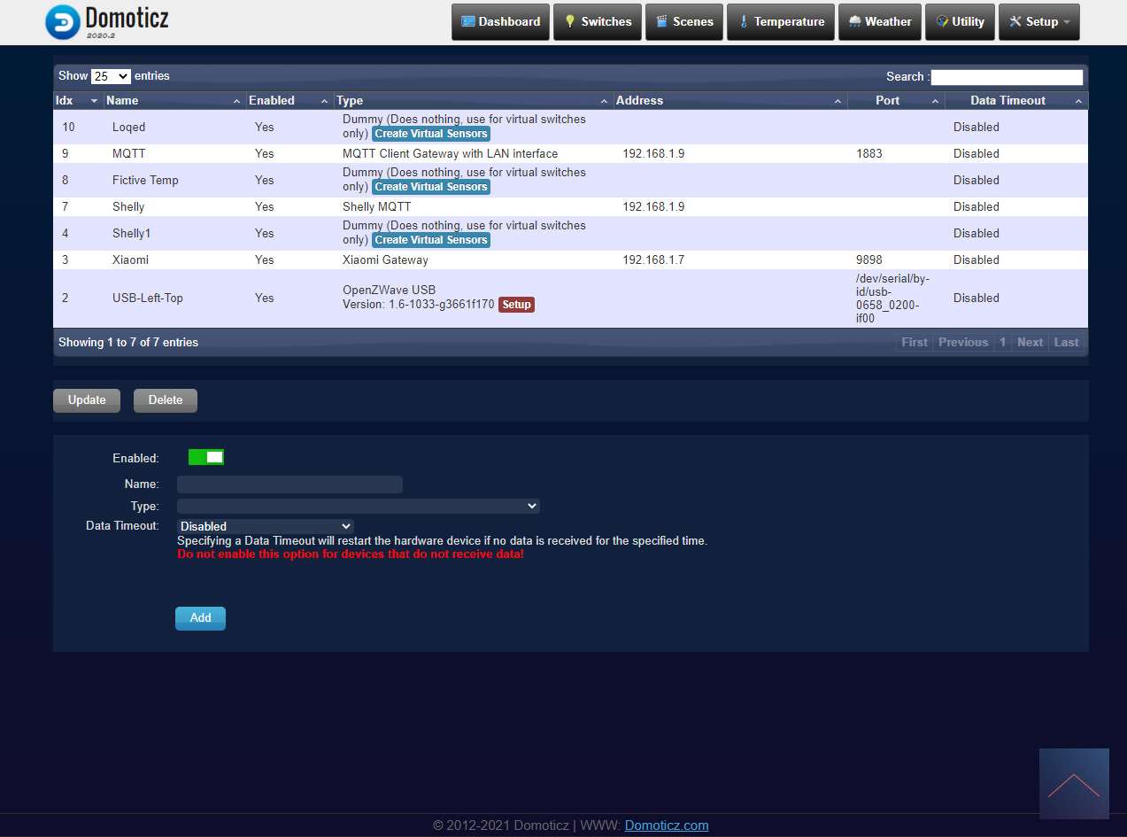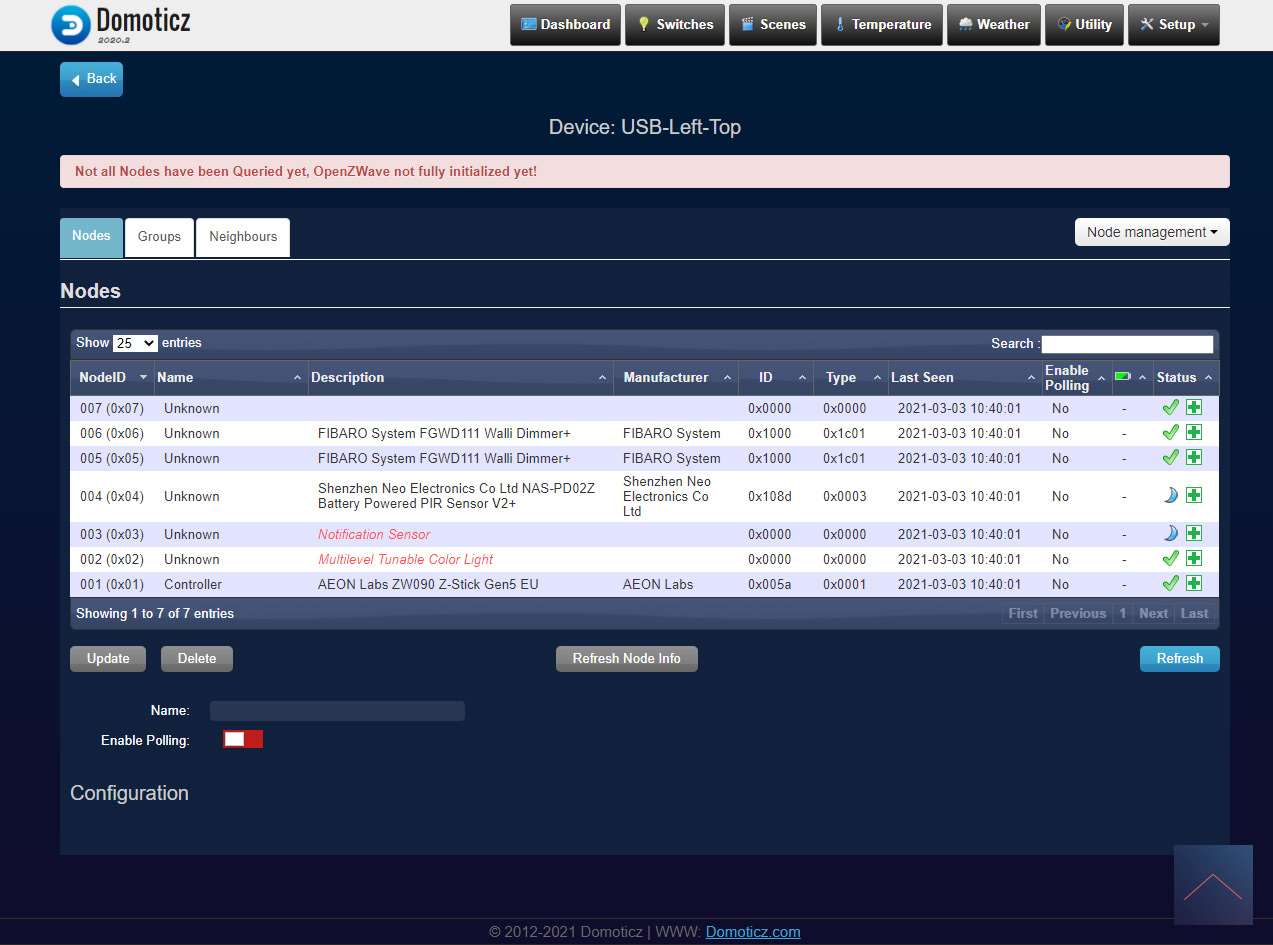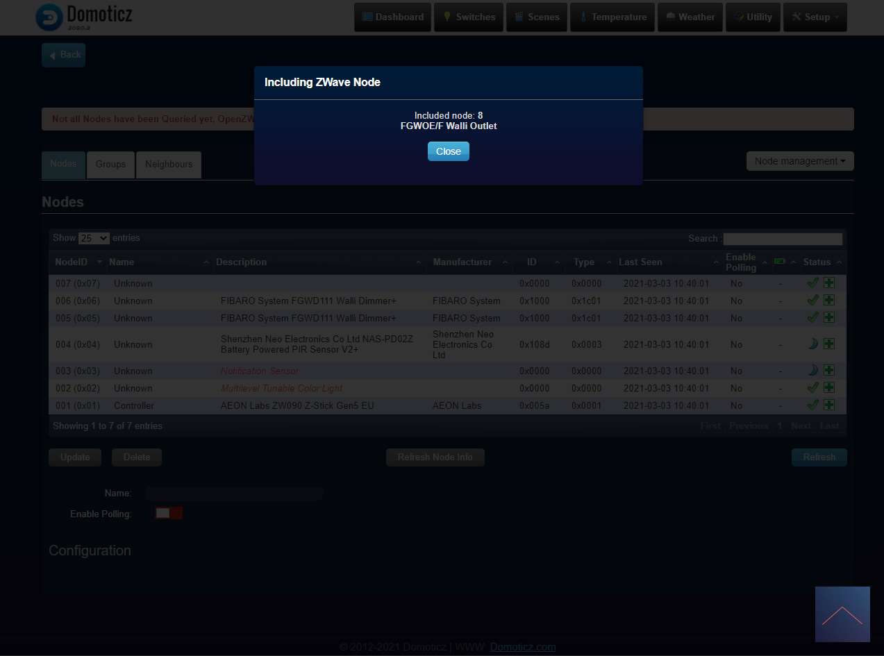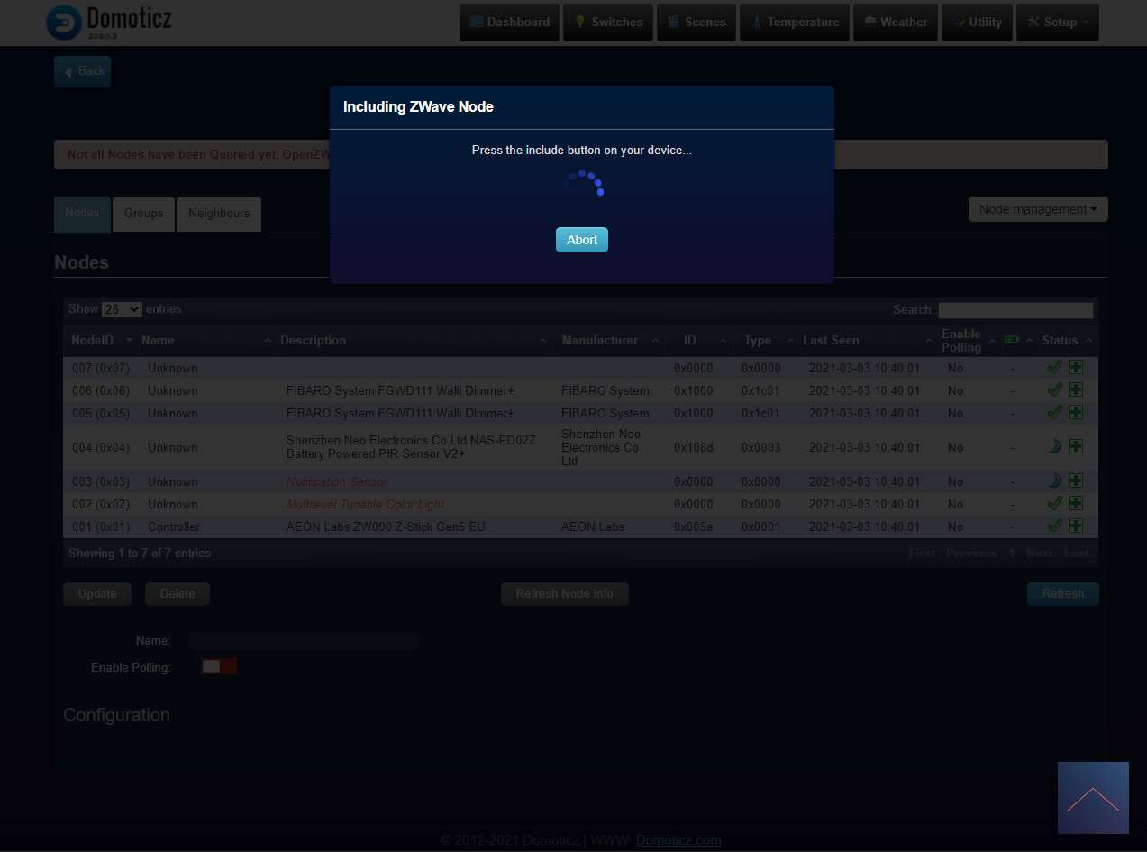 Log vervolgens in op Domoticz en ga naar het menu item "setup" en naar "hardware". Druk hierna op de setup bij de Aeon Labs controller en druk op "include node secure". Er zal en een pop-up komen dat de controller in leerstand staat. Druk vervolgens 3x met een kleine schroevendraaier op het toevoegen knopje. De LED zal groen gaan knipperen en hierna wit oplichten om aan te geven dat het toevoegen is gelukt.