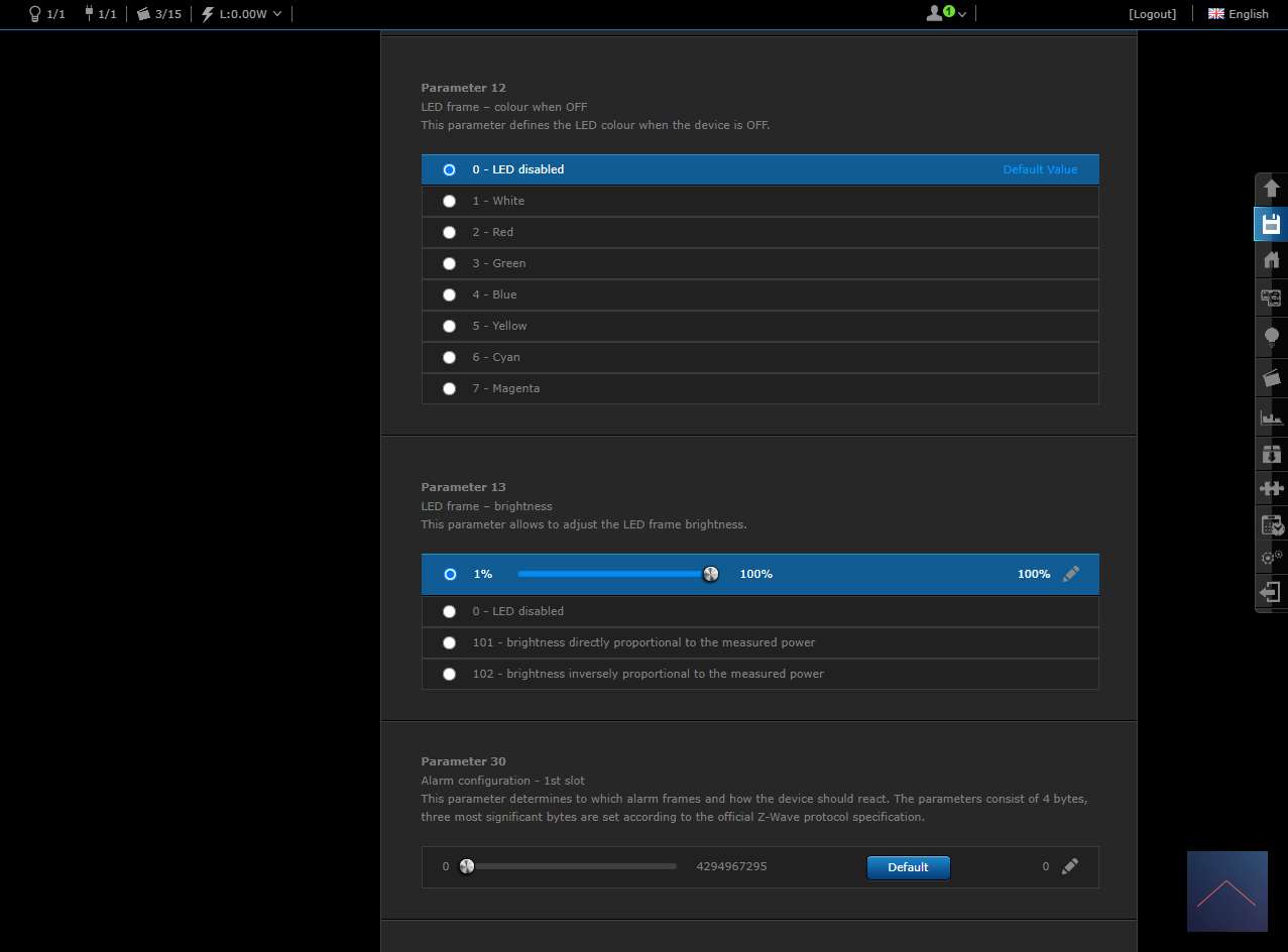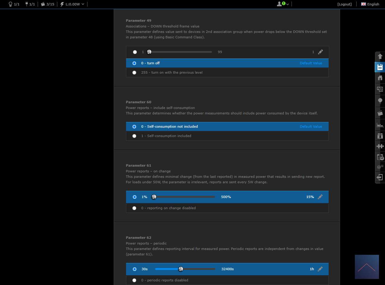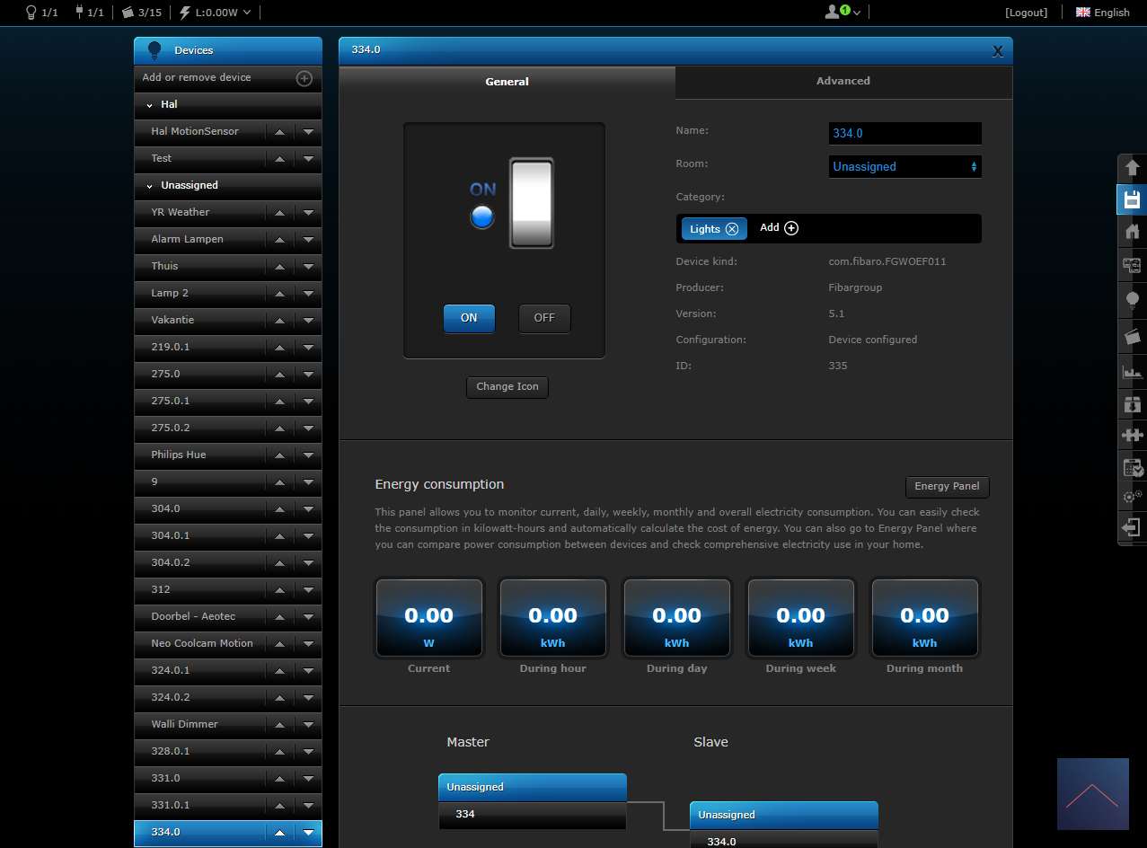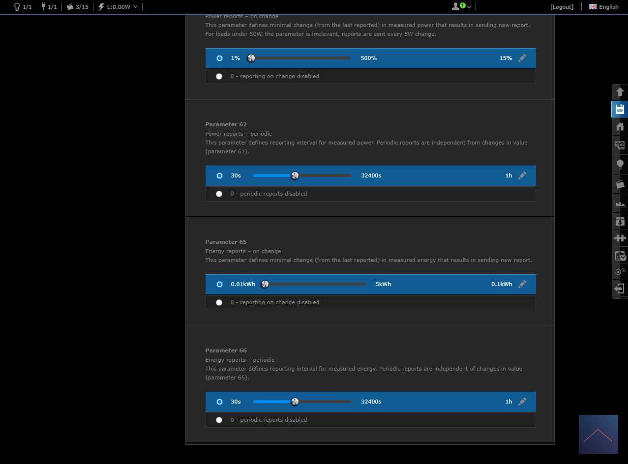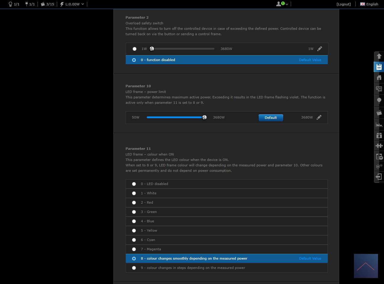 We krijgen een aan/uit schakelaar, we zien het totaal verbruik en het huidige verbruik. Bij de configuratie zien alle parameters/configuratie mogelijkheden. Zoals verwacht helemaal compleet dus.