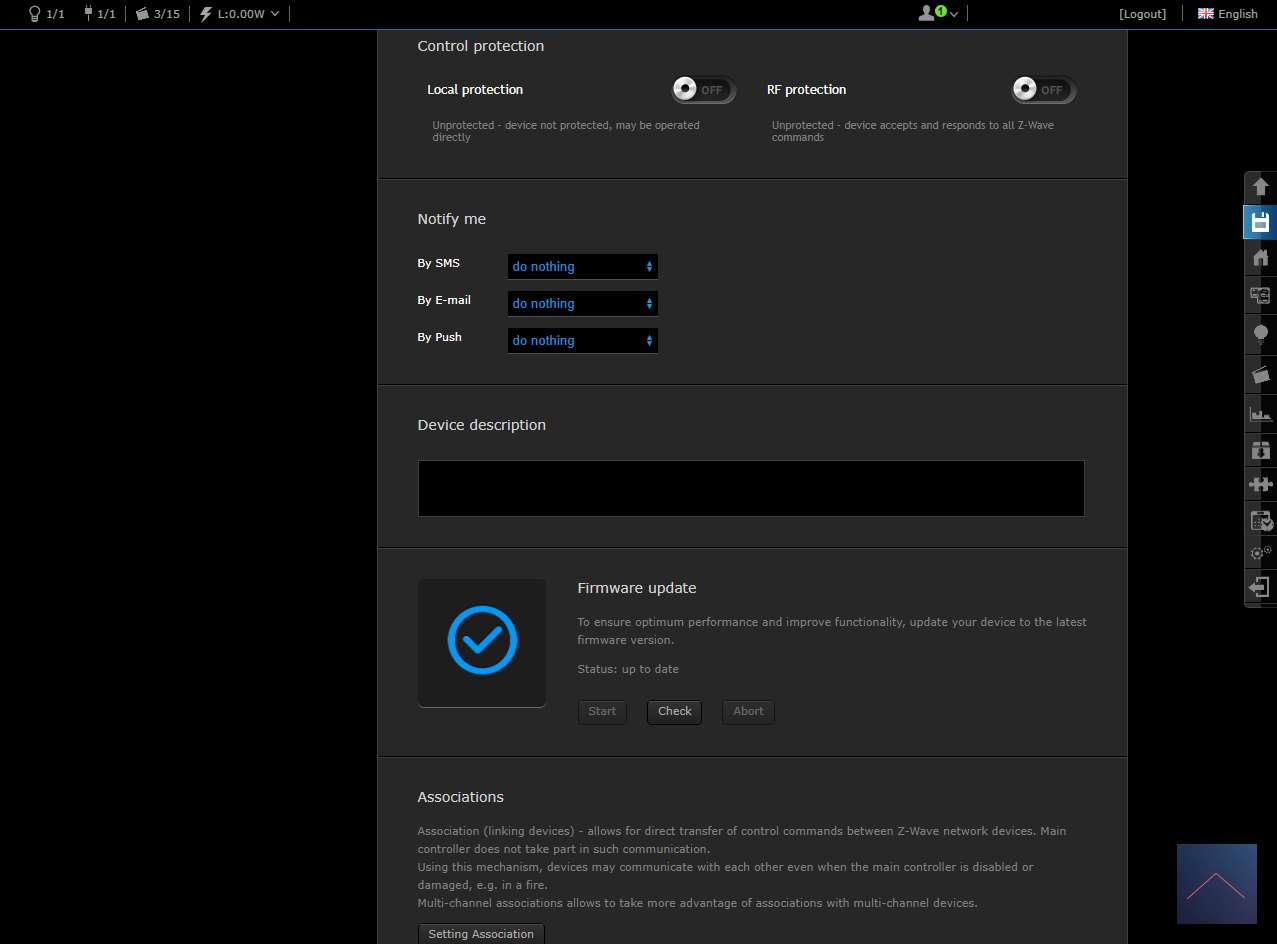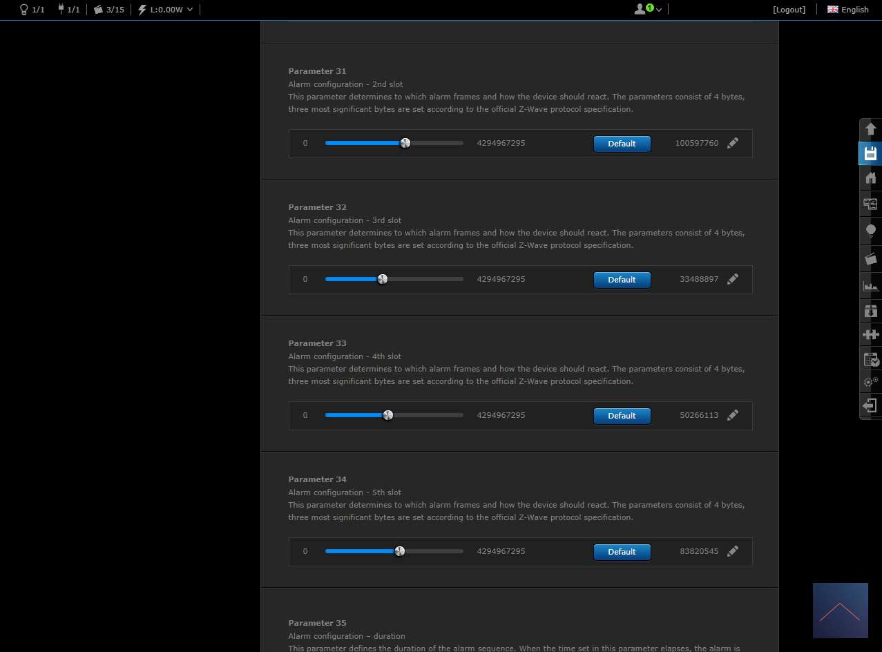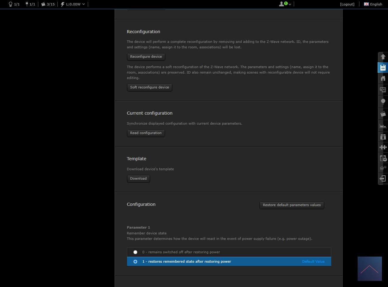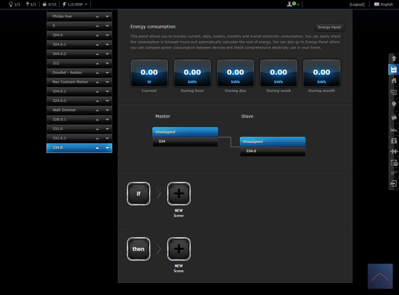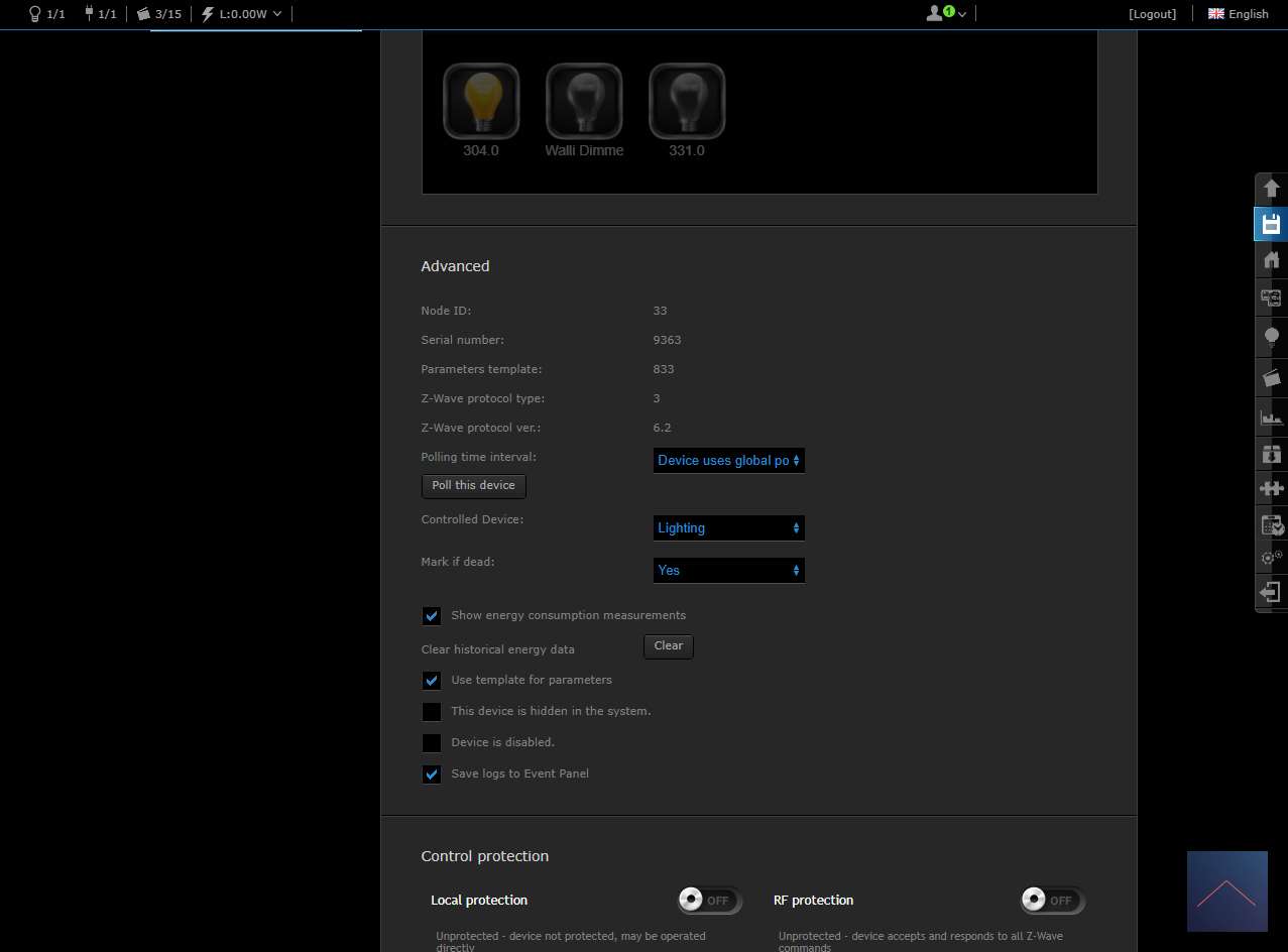We krijgen een aan/uit schakelaar, we zien het totaal verbruik en het huidige verbruik. Bij de configuratie zien alle parameters/configuratie mogelijkheden. Zoals verwacht helemaal compleet dus.
