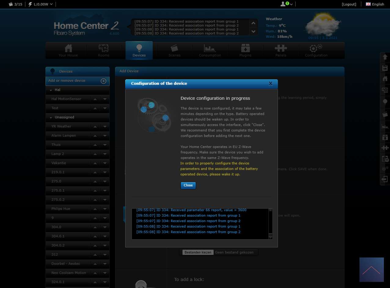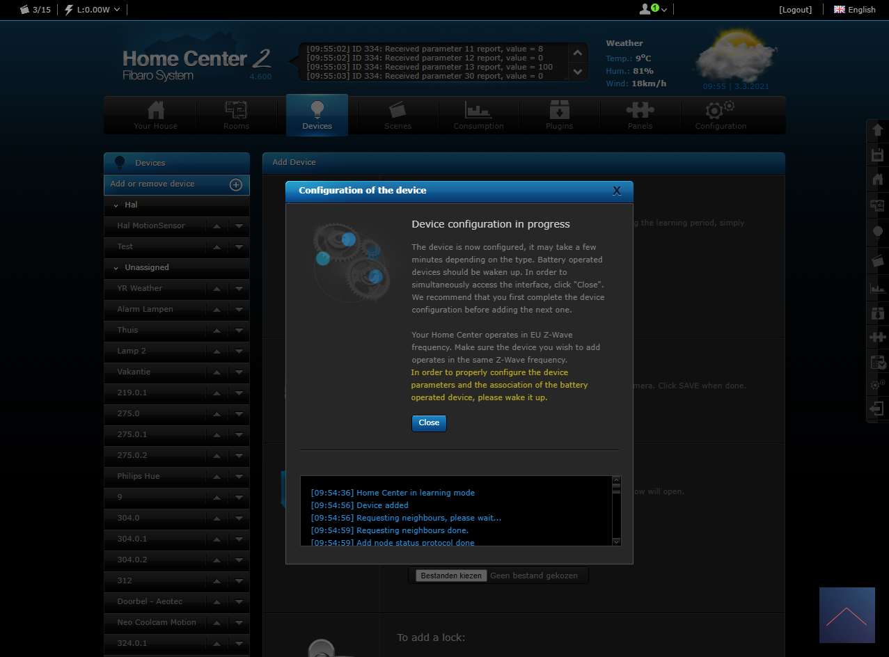 De HC2 vindt hem vrijwel direct en ik zie dat de eindpunten/nodes worden toegevoegd.